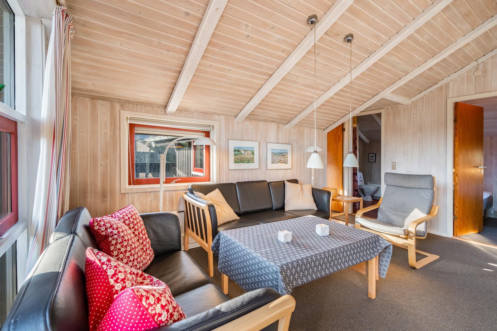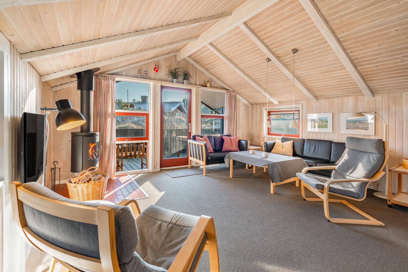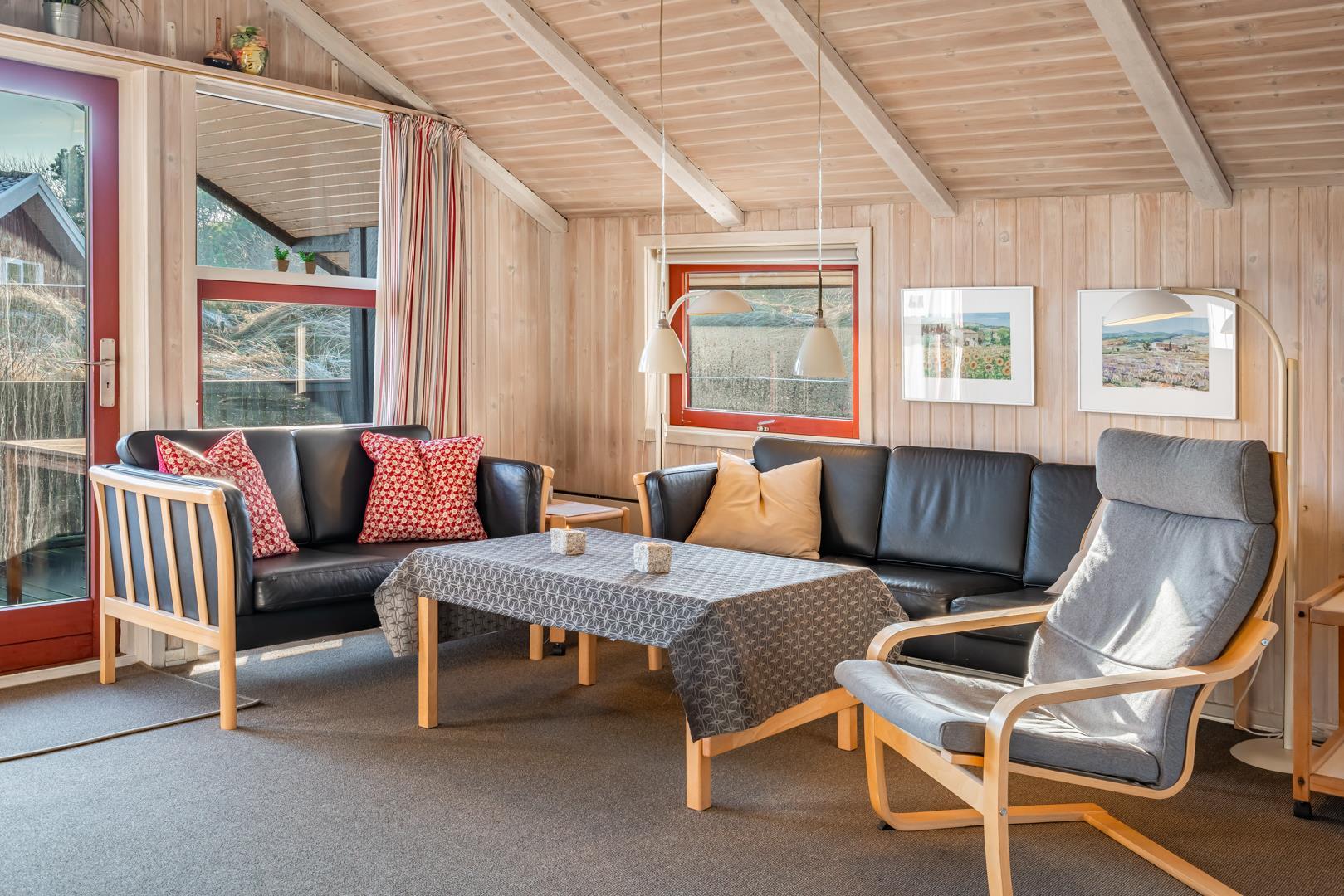 Huset byder på en lys og hyggelig stue med komfortable møbler og direkte adgang til terrassen.