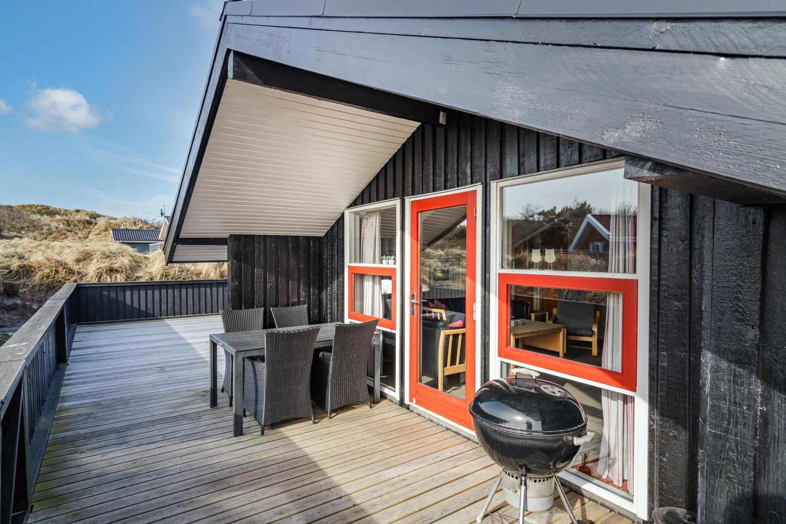 En del af terrassen er overdækket, hvilket giver mulighed for hyggelige udendørsstunder, uanset vejret.