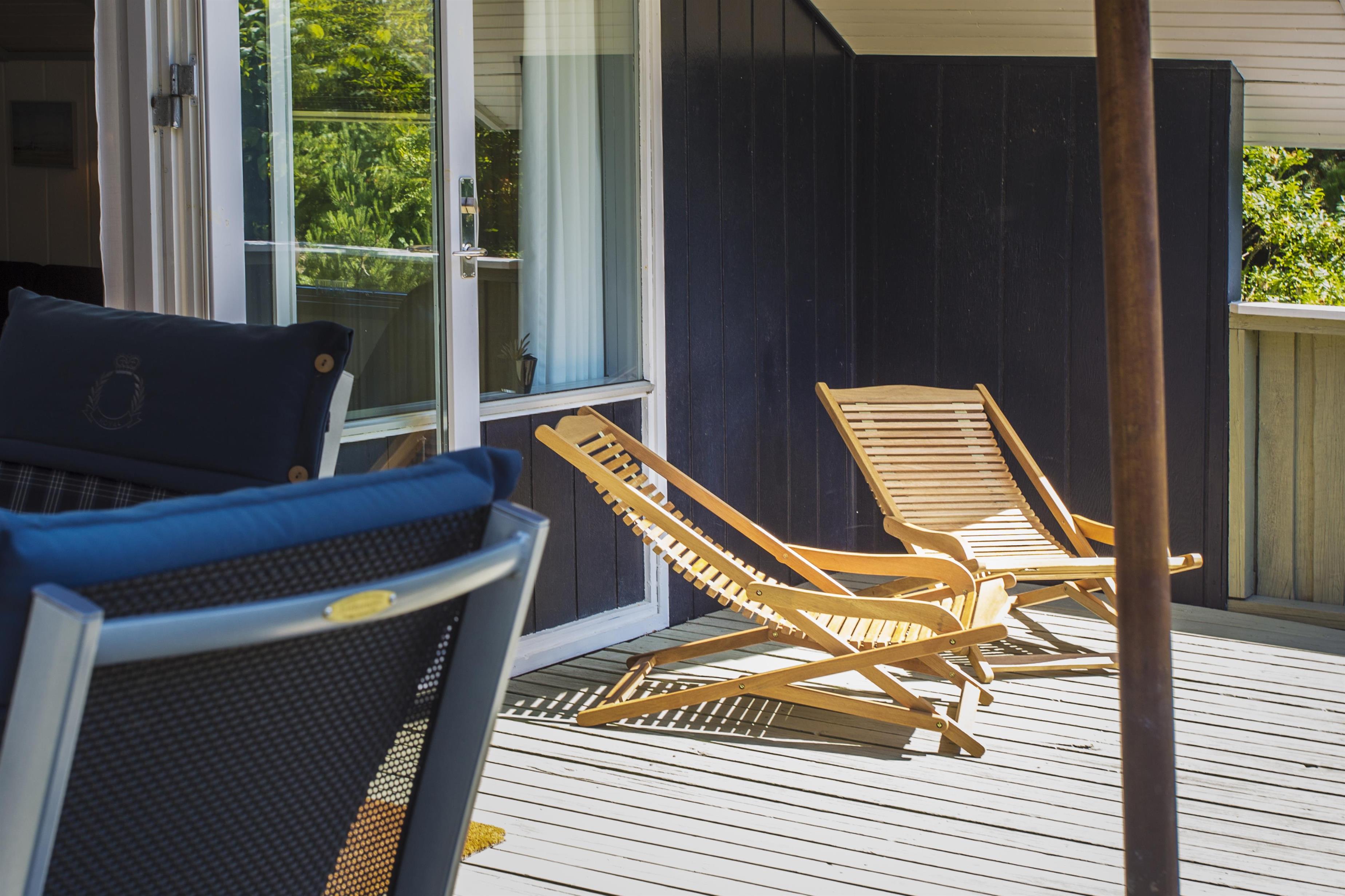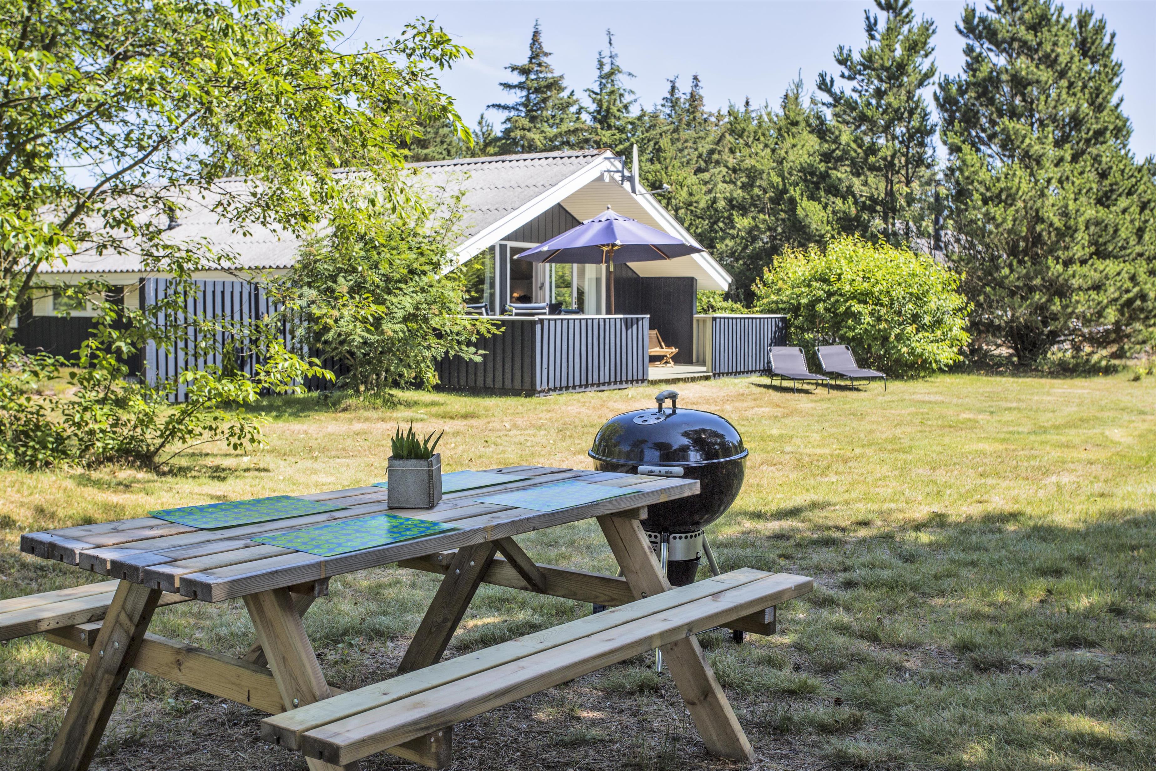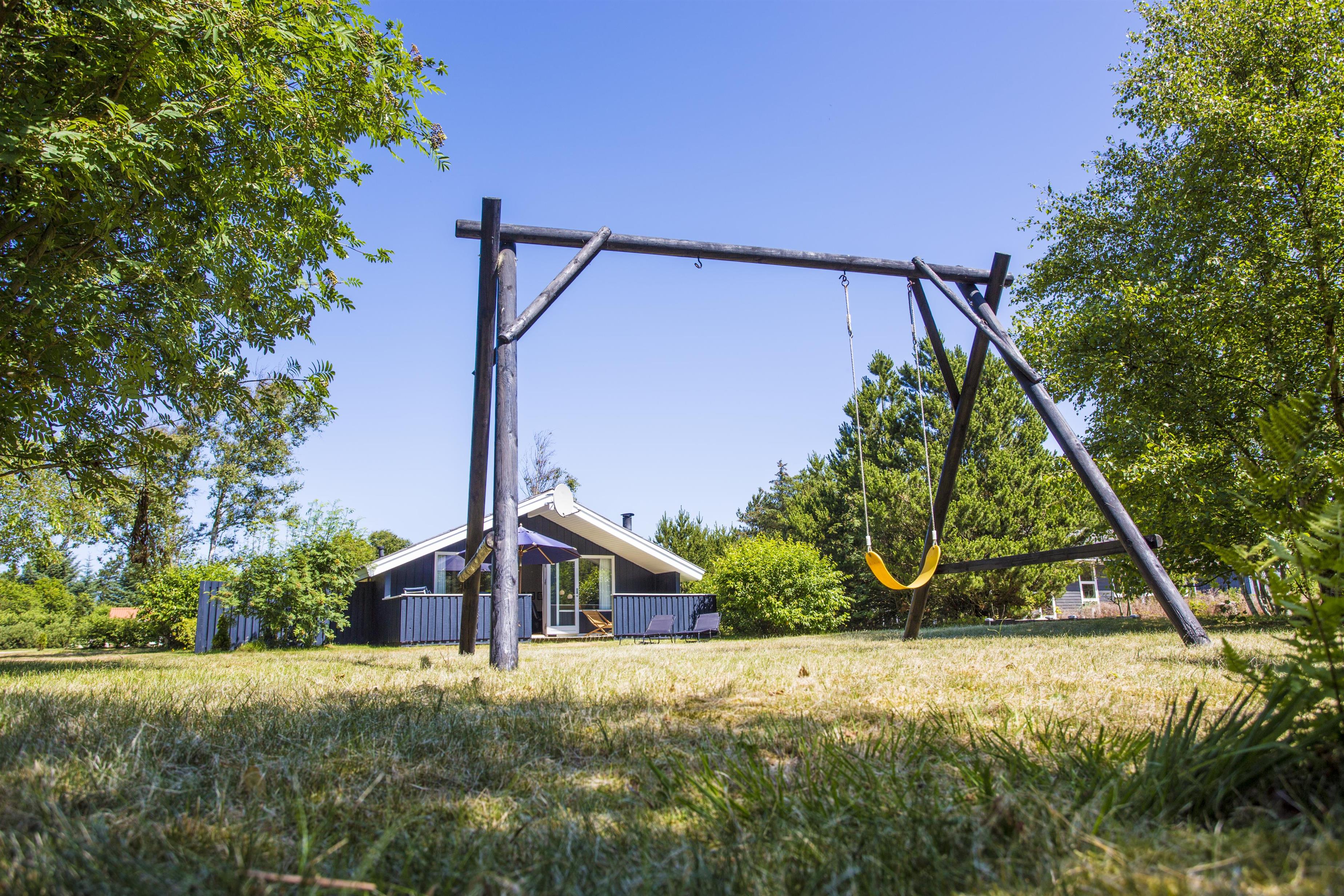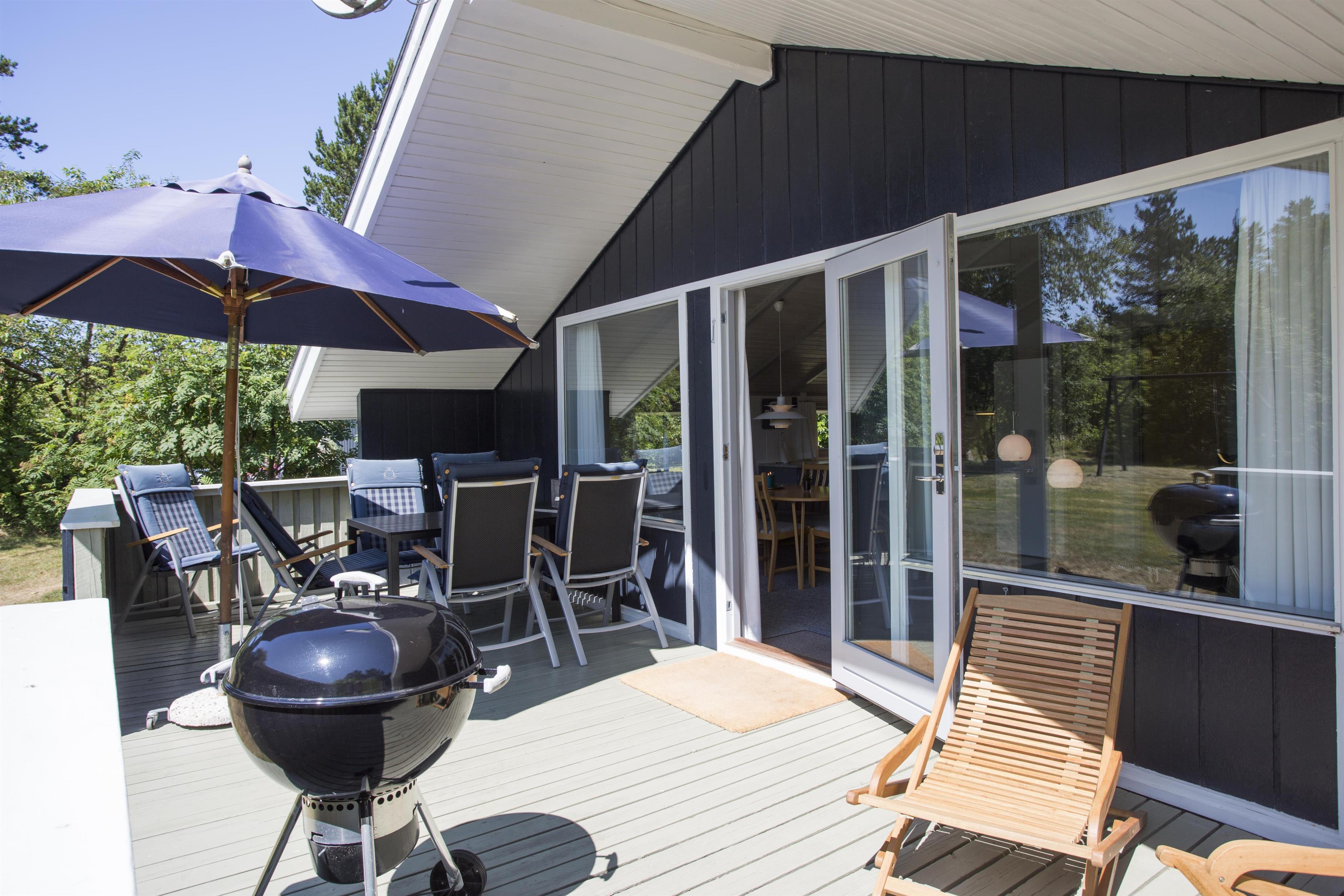 Fra den dejlige terrasse kan man nyde solen og kigge ud i den store have. Der er havemøbler, liggestole og grill på terrassen. I haven er der et gyngestativ og en sandkasse.
