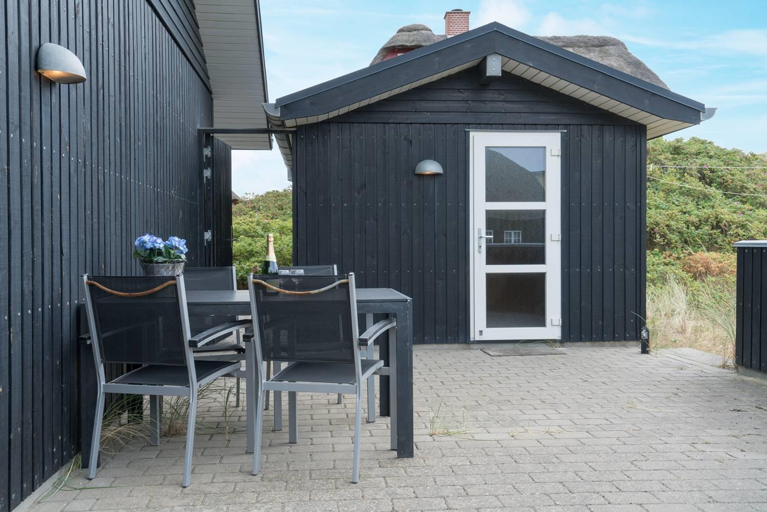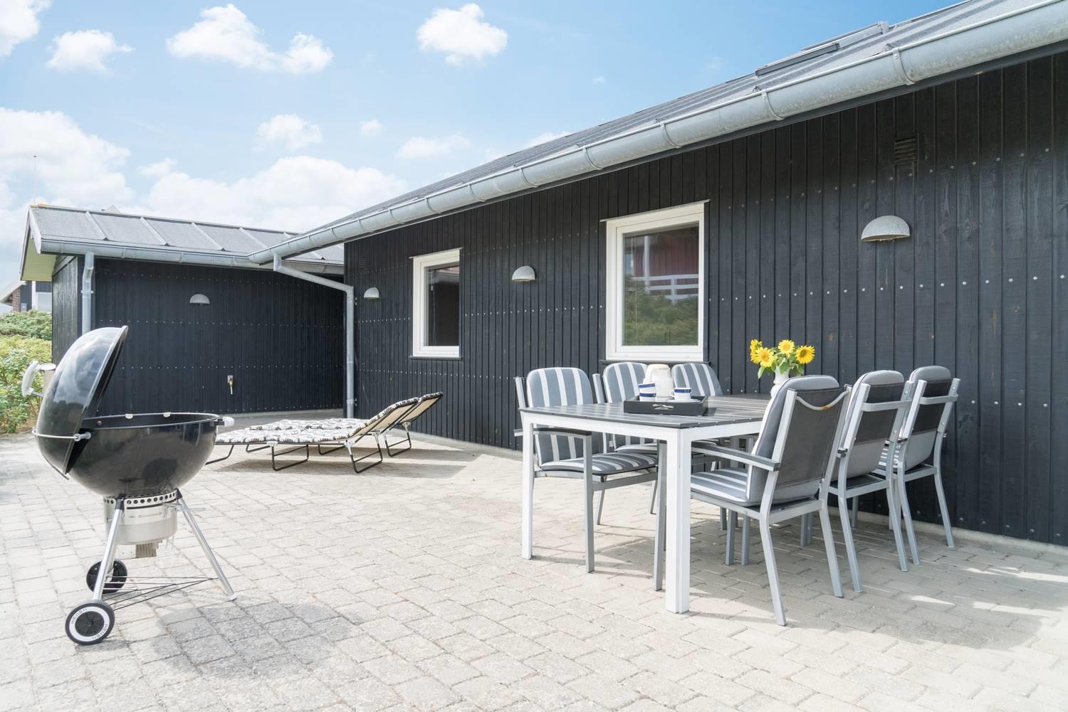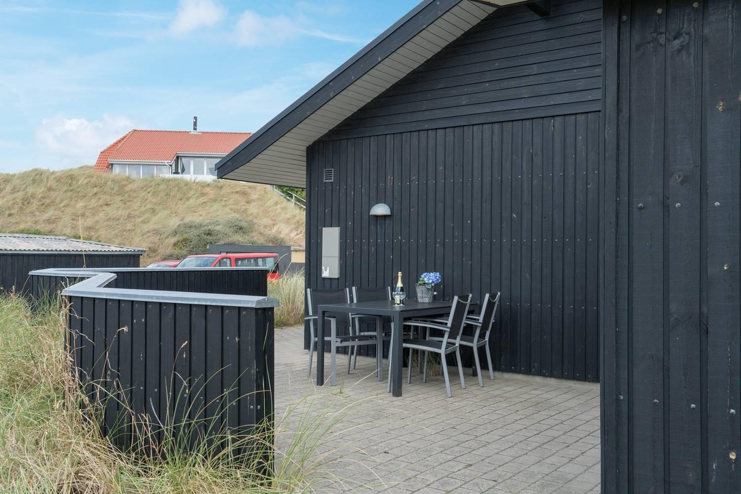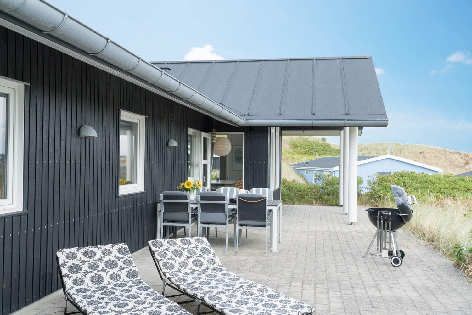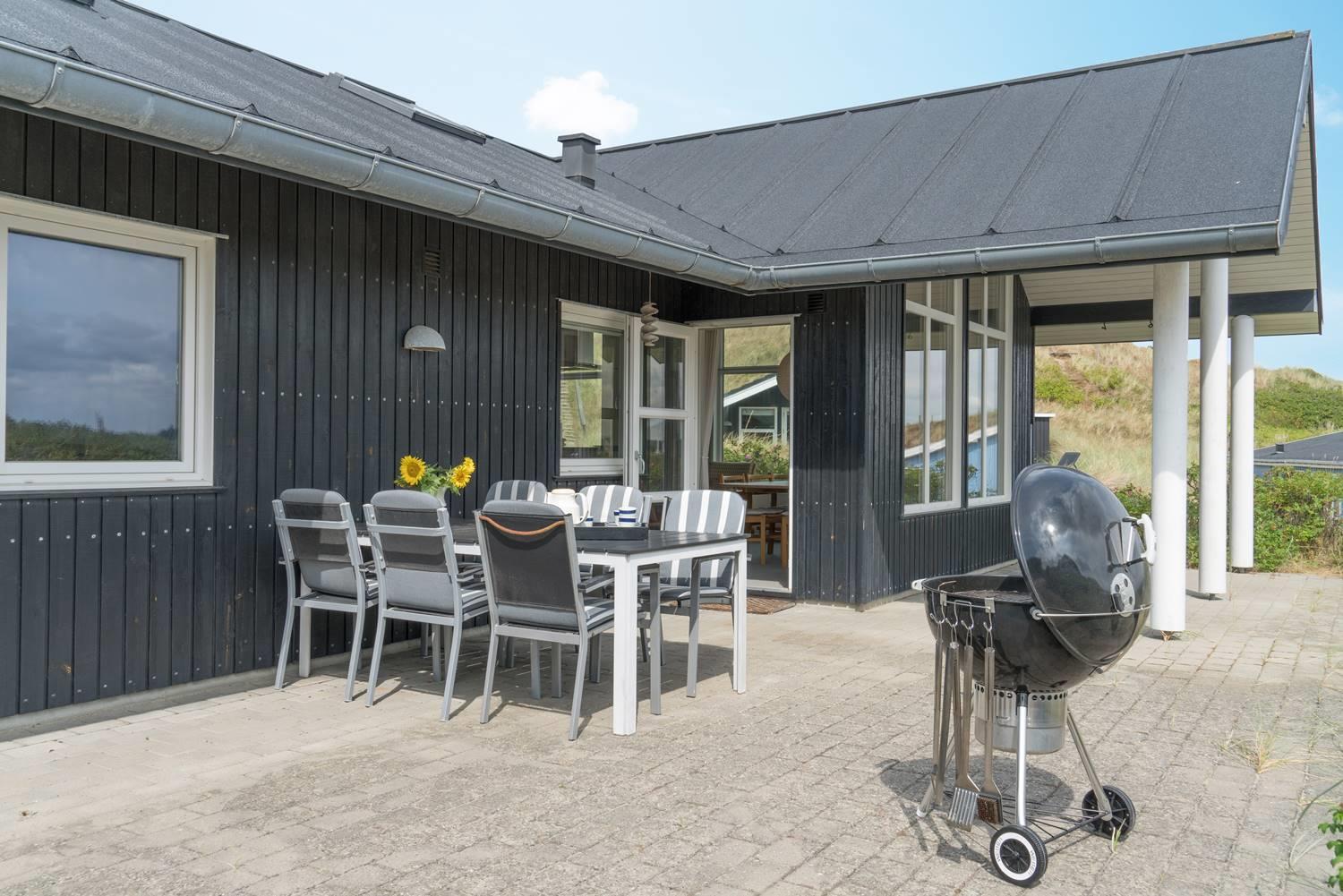 Udendørs byder sommerhuset på en overdækket terrasse, hvor du kan nyde den friske havluft uanset vejret.