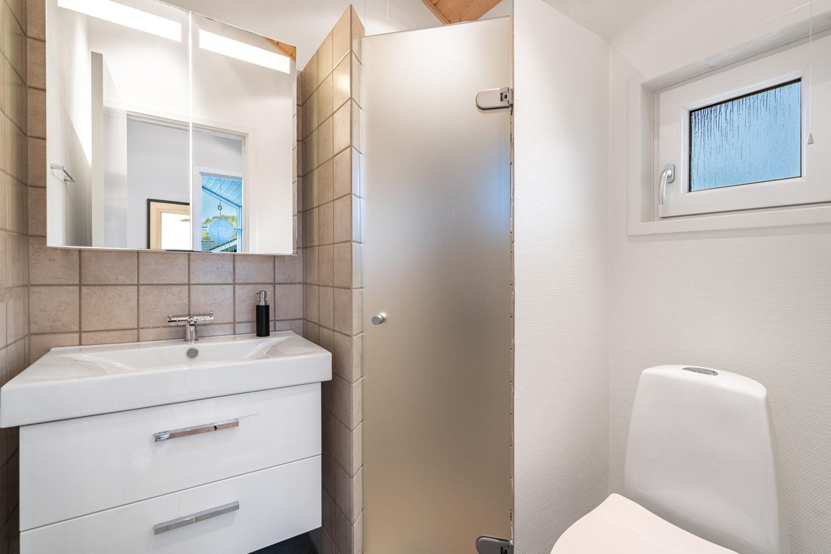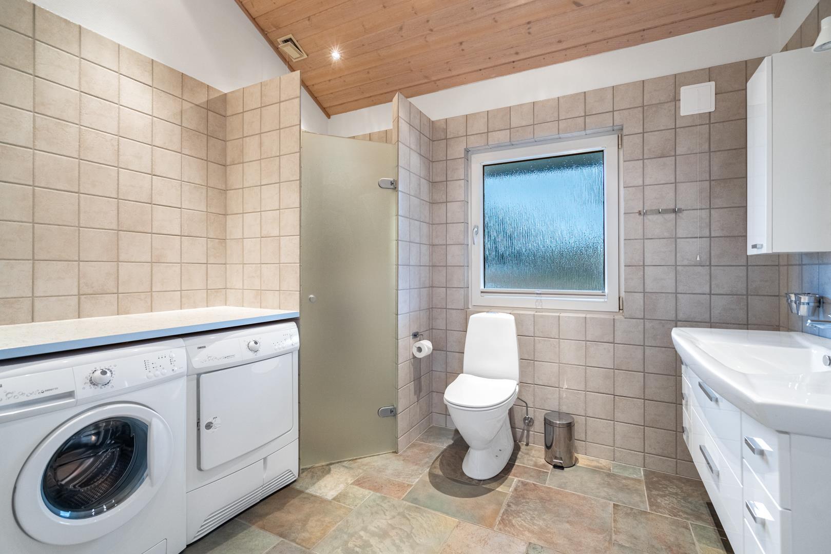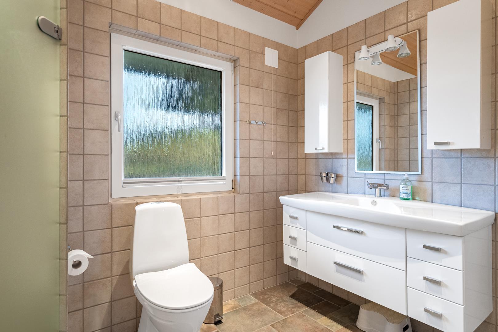 De 2 badeværelser – begge med gulvvarme – gør hverdagen ekstra nem, især når flere skal gøre sig klar samtidig. Derudover er der både vaskemaskine og tørretumbler, så du også er godt dækket ind ved længere ophold.