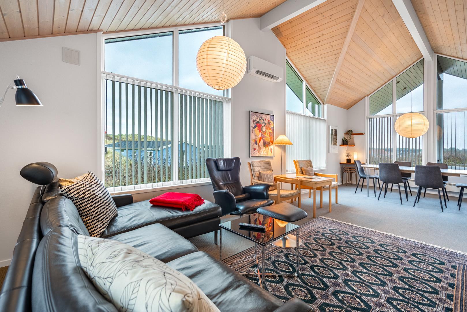 Charmerende feriehus i Henne Strand med udsigt over klitter og tæt på Vesterhavet, moderne faciliteter og to terrasser.