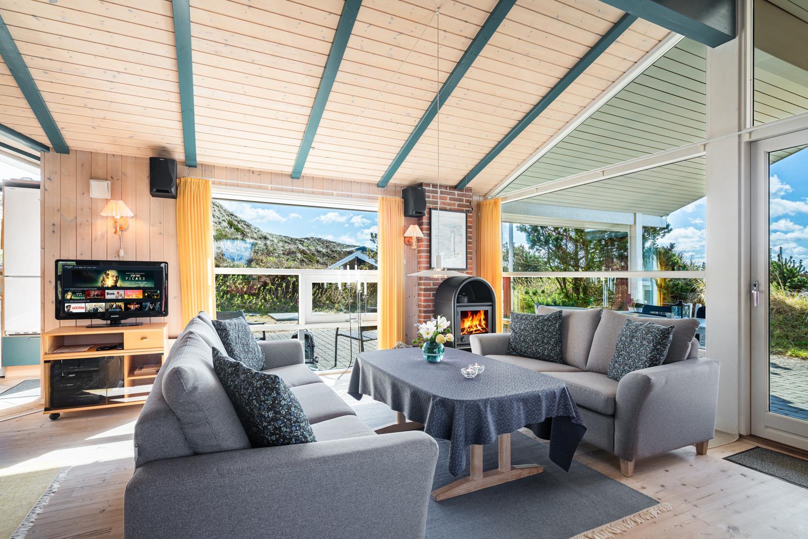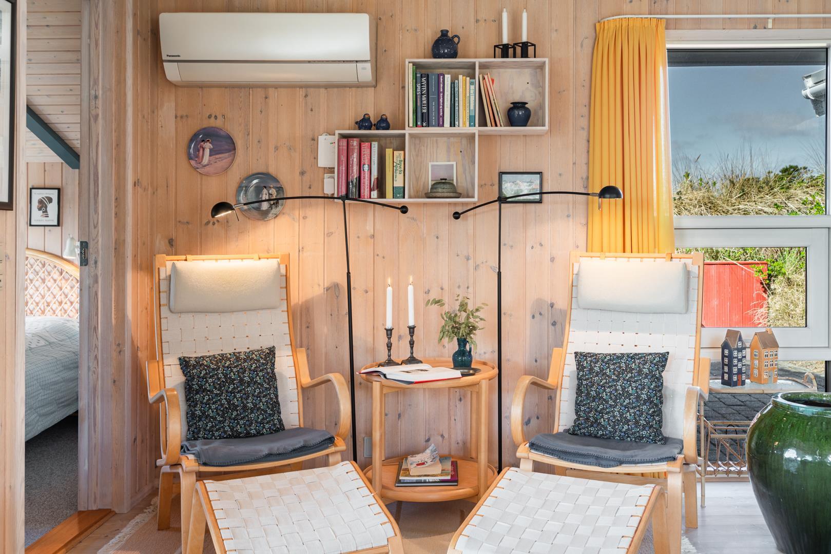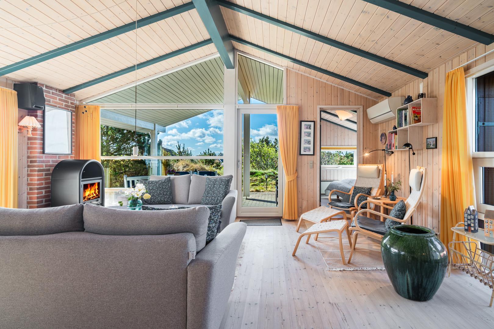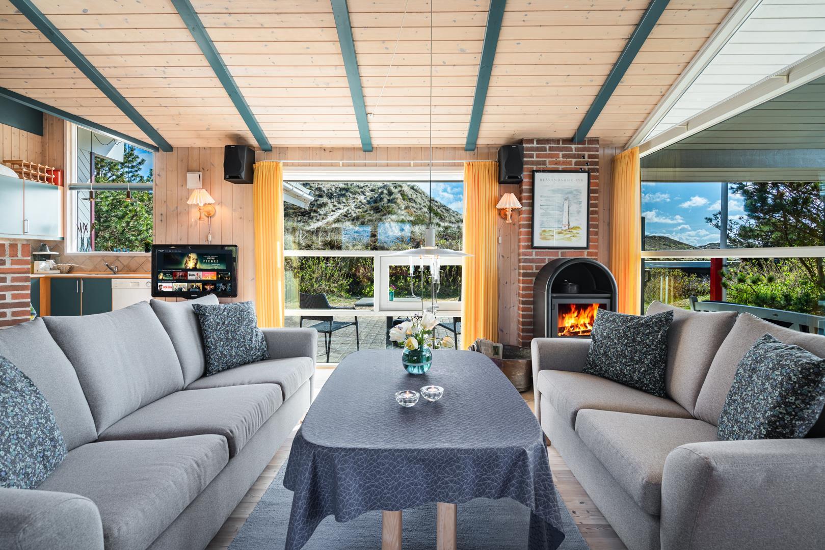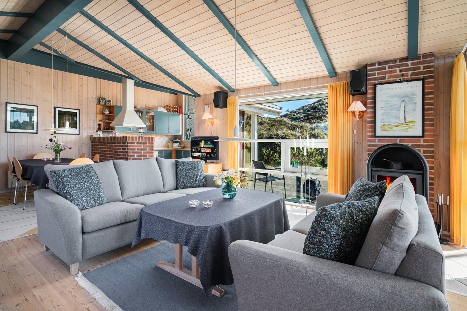 Indendørs finder du et lyst og åbent køkken/alrum med adgang til en hyggelig stue, smagfuldt indrettet med gode og komfortable møbler – ideelt til afslapning efter en dag ved stranden eller i naturen.