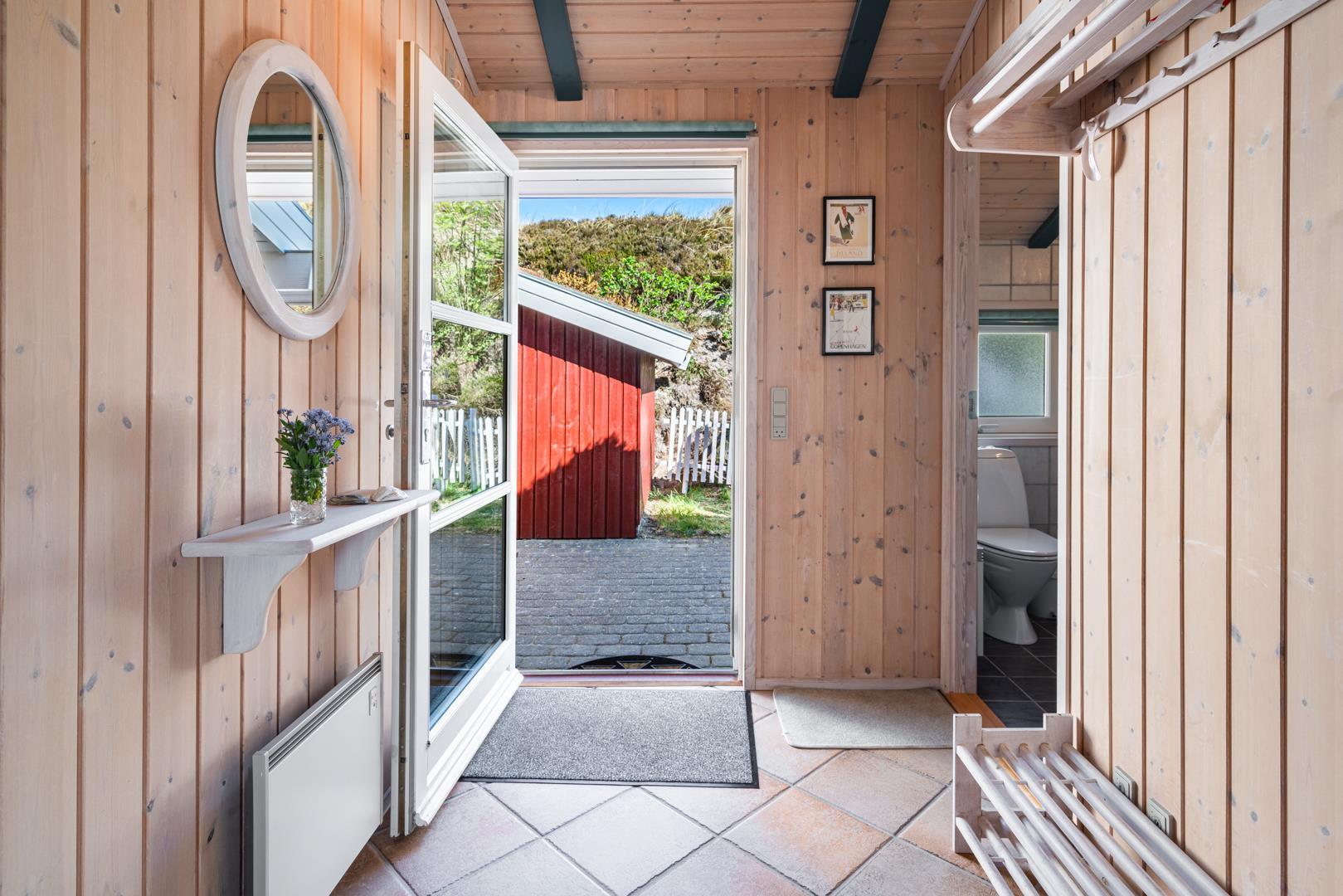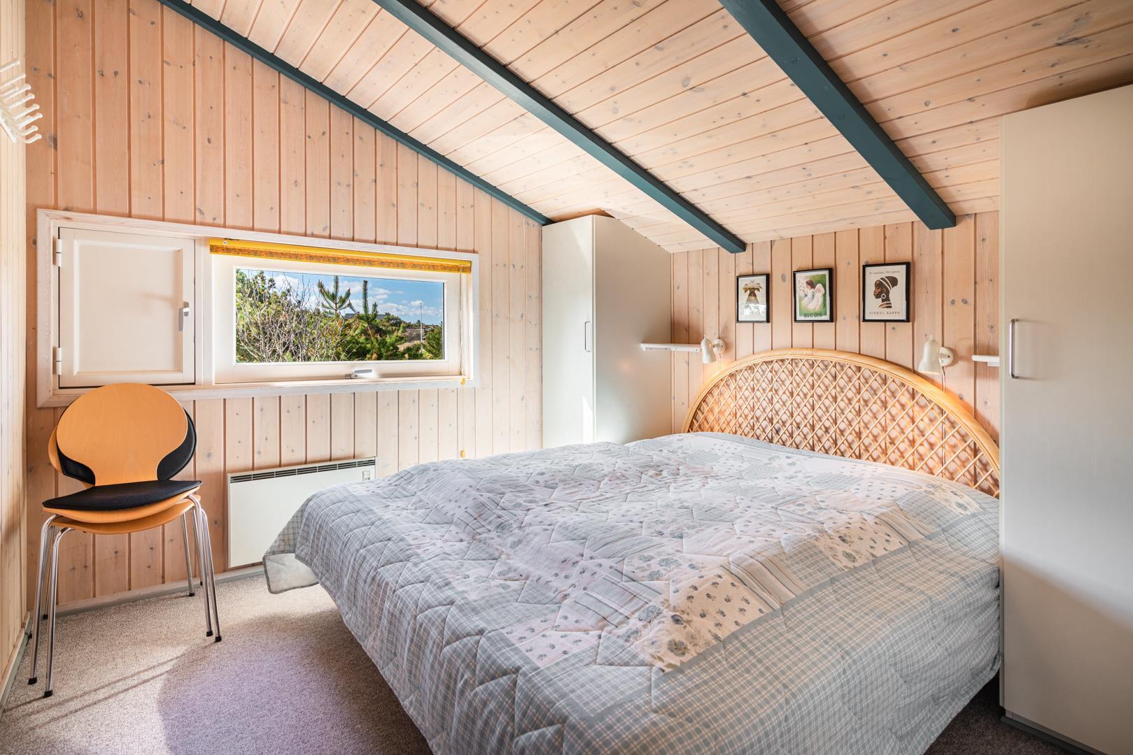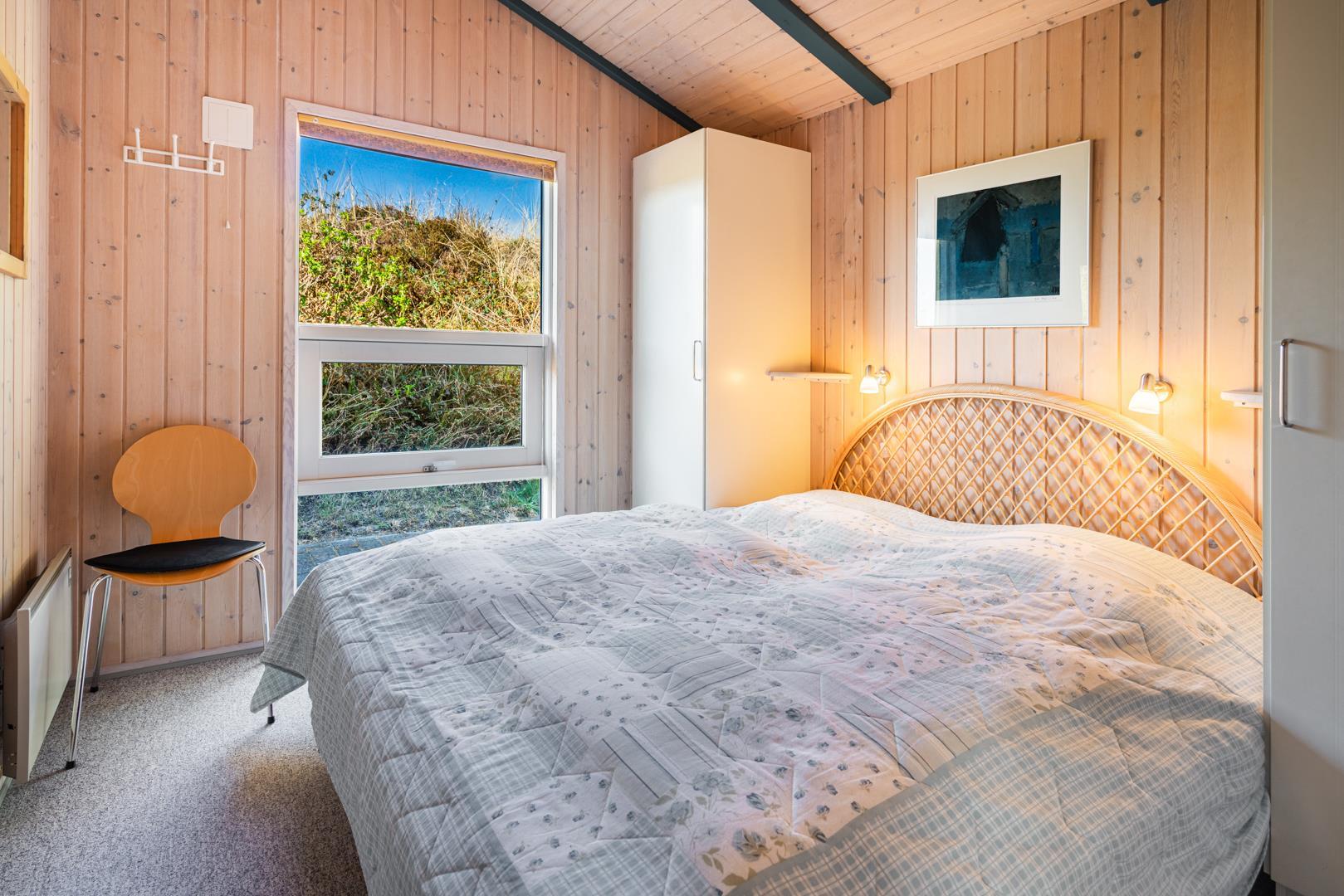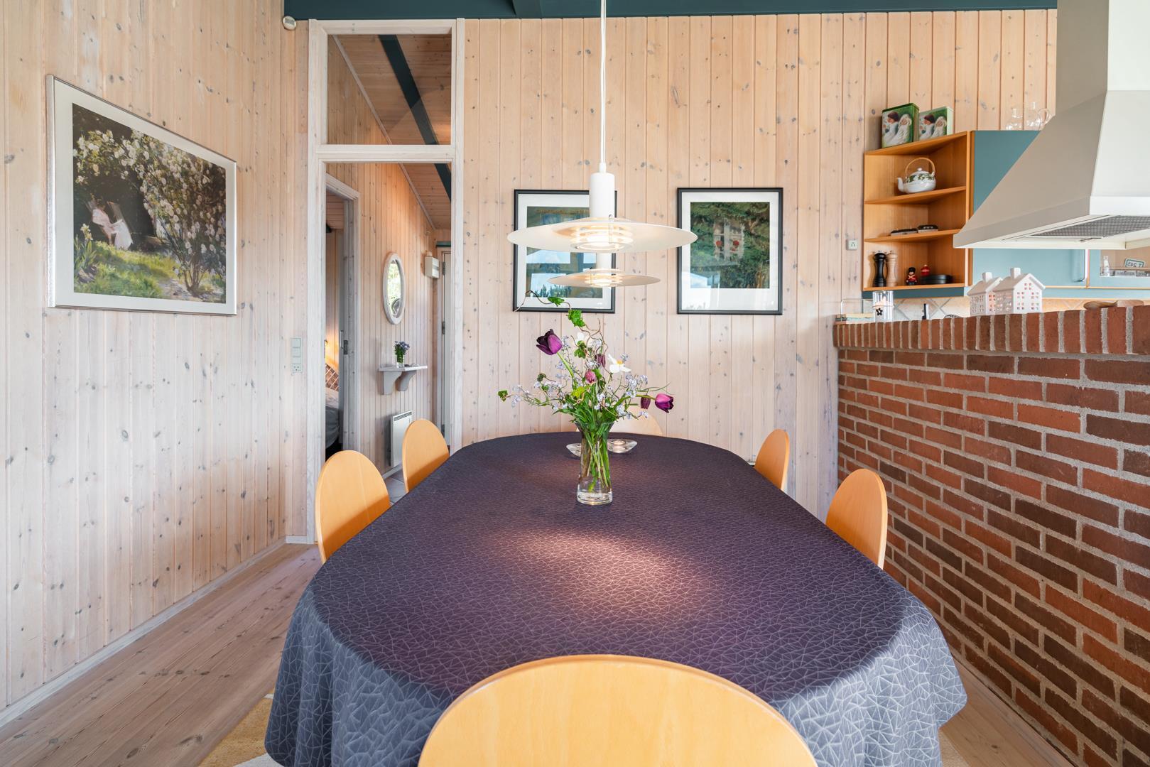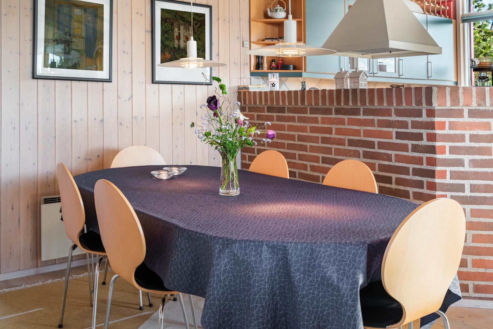 Indendørs finder du et lyst og åbent køkken/alrum med adgang til en hyggelig stue, smagfuldt indrettet med gode og komfortable møbler – ideelt til afslapning efter en dag ved stranden eller i naturen.