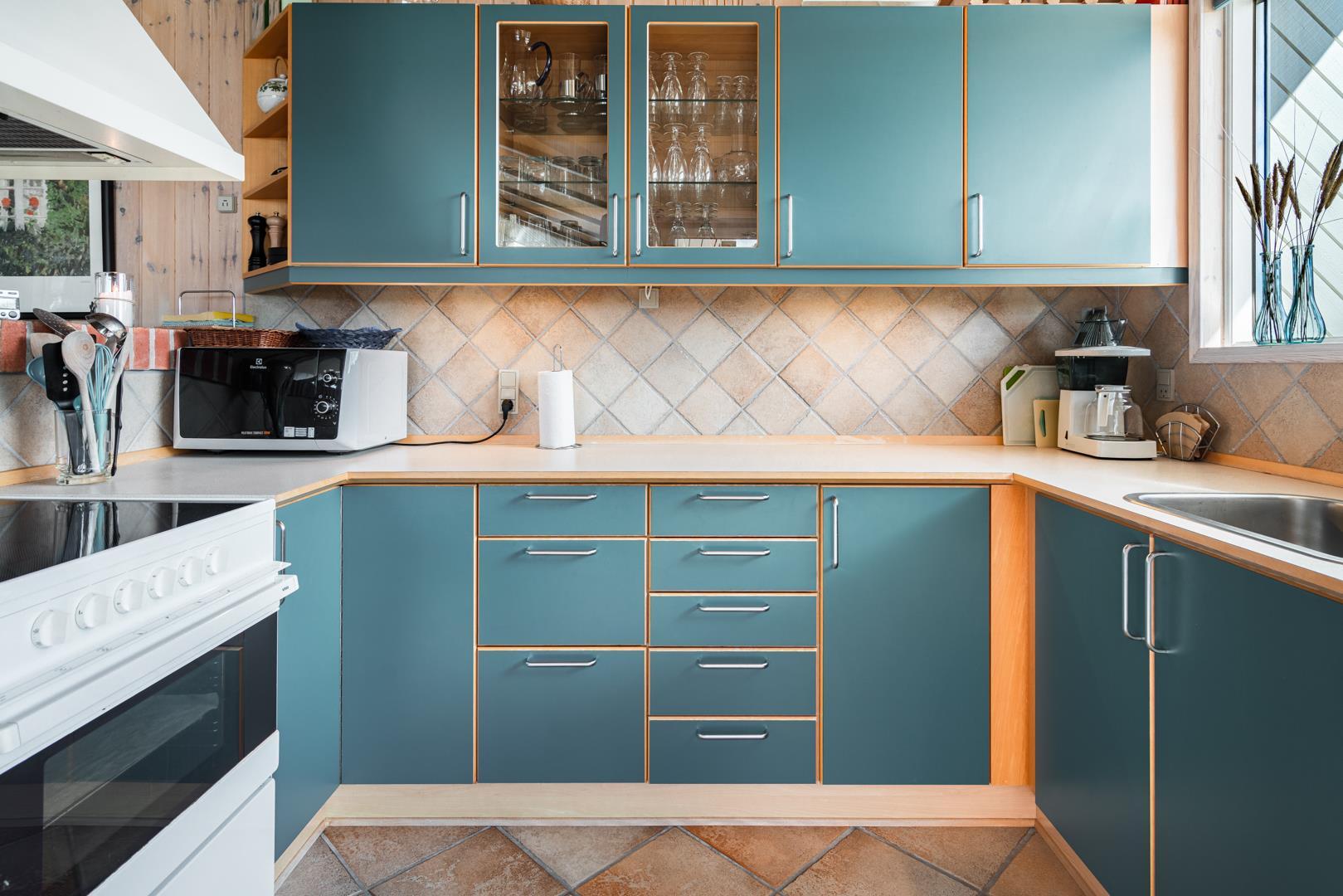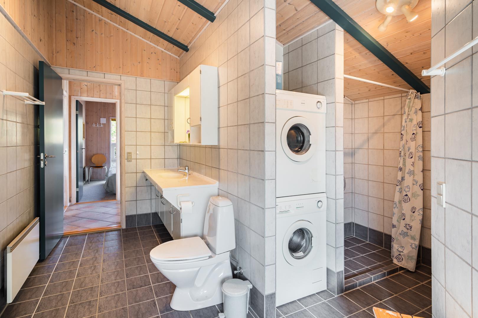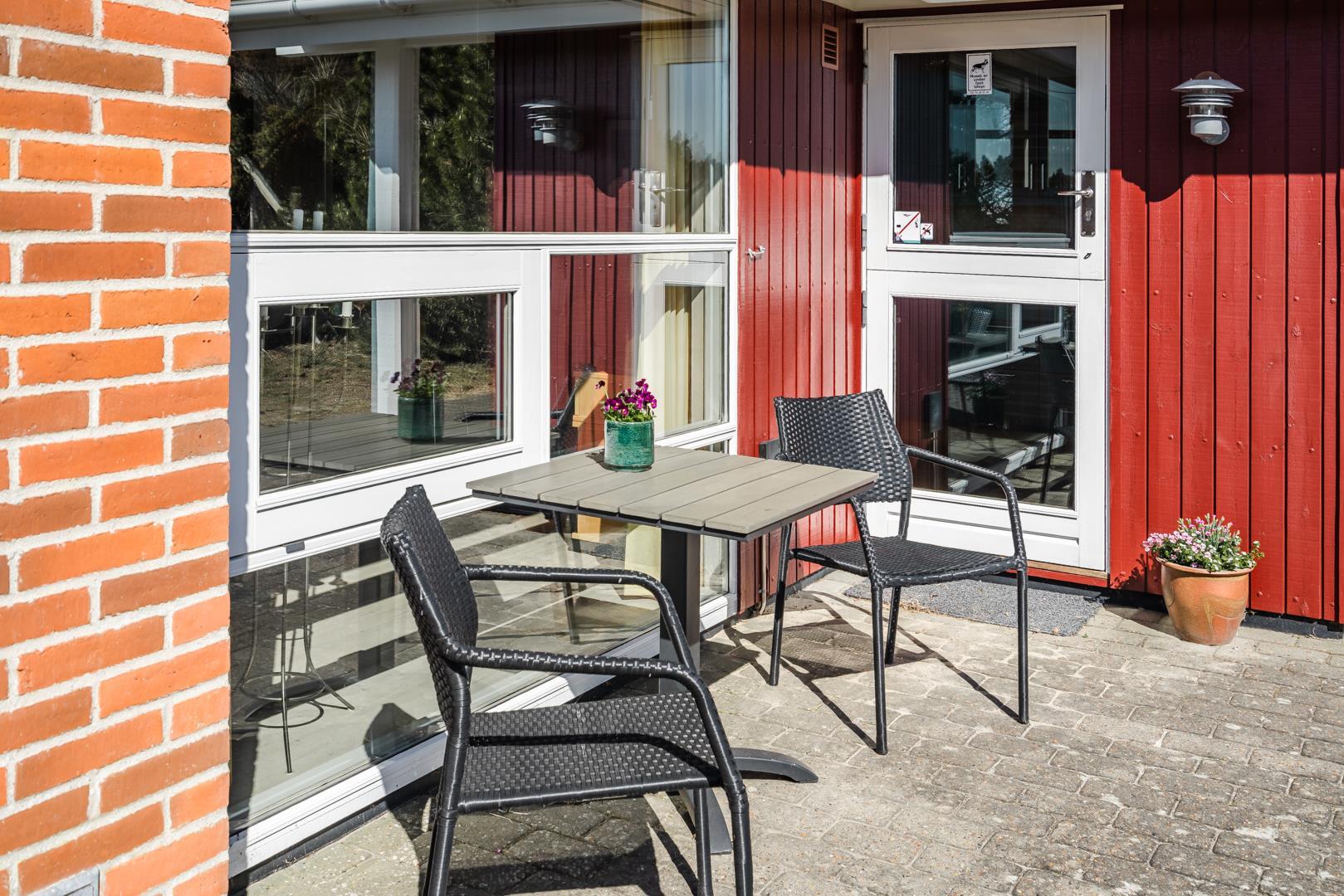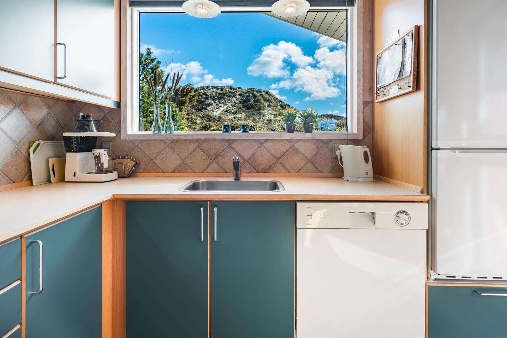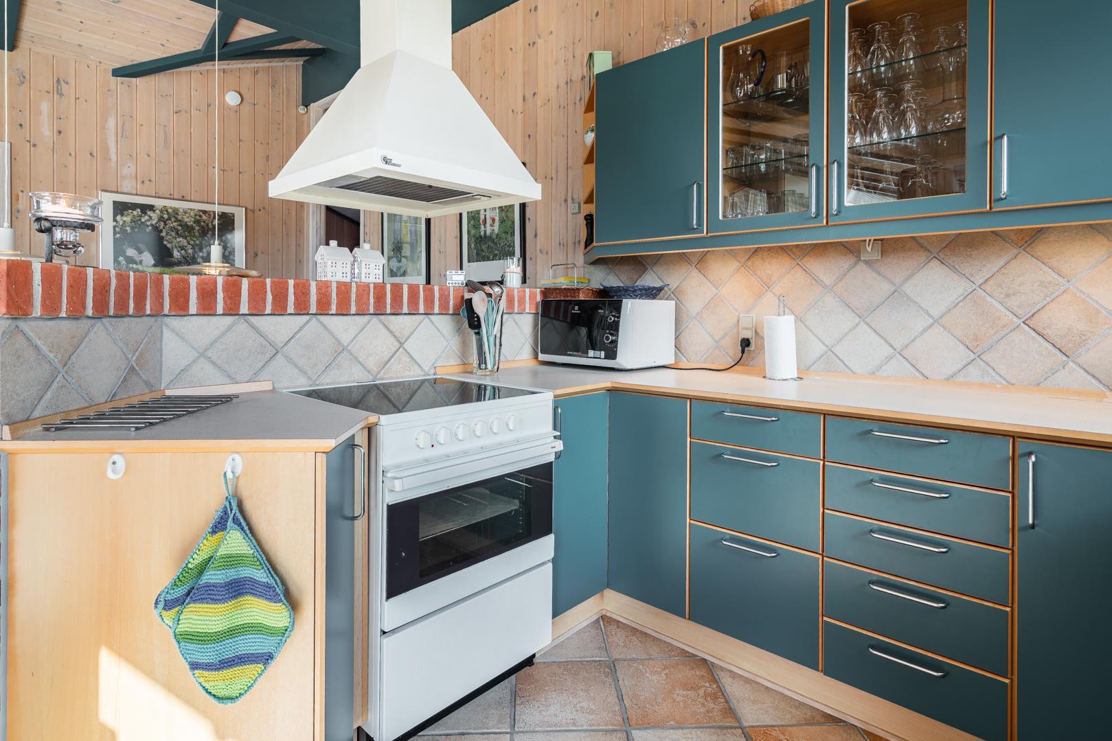 Indendørs finder du et lyst og åbent køkken/alrum med adgang til en hyggelig stue, smagfuldt indrettet med gode og komfortable møbler – ideelt til afslapning efter en dag ved stranden eller i naturen.