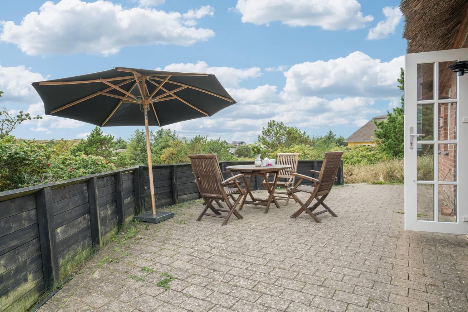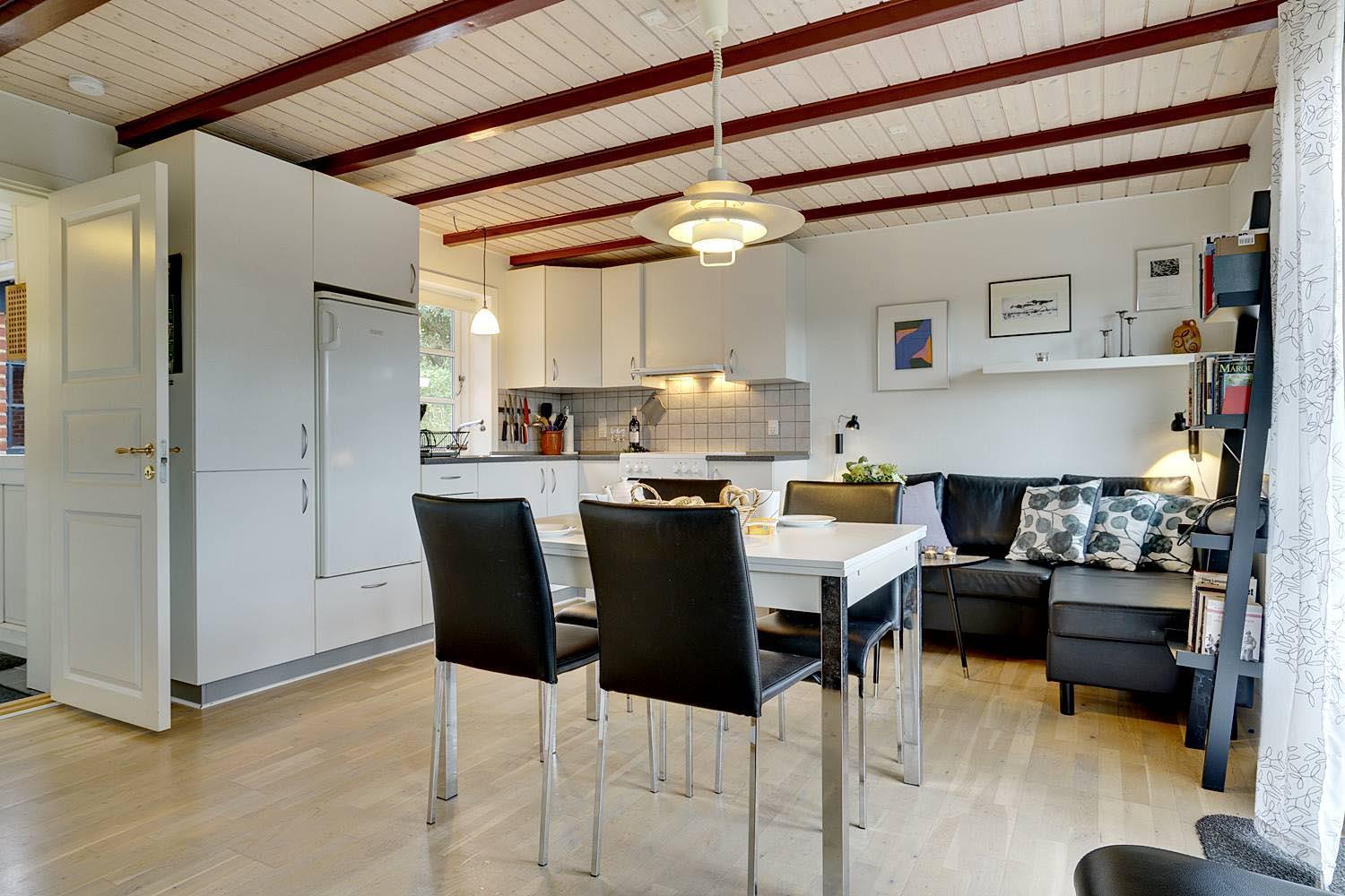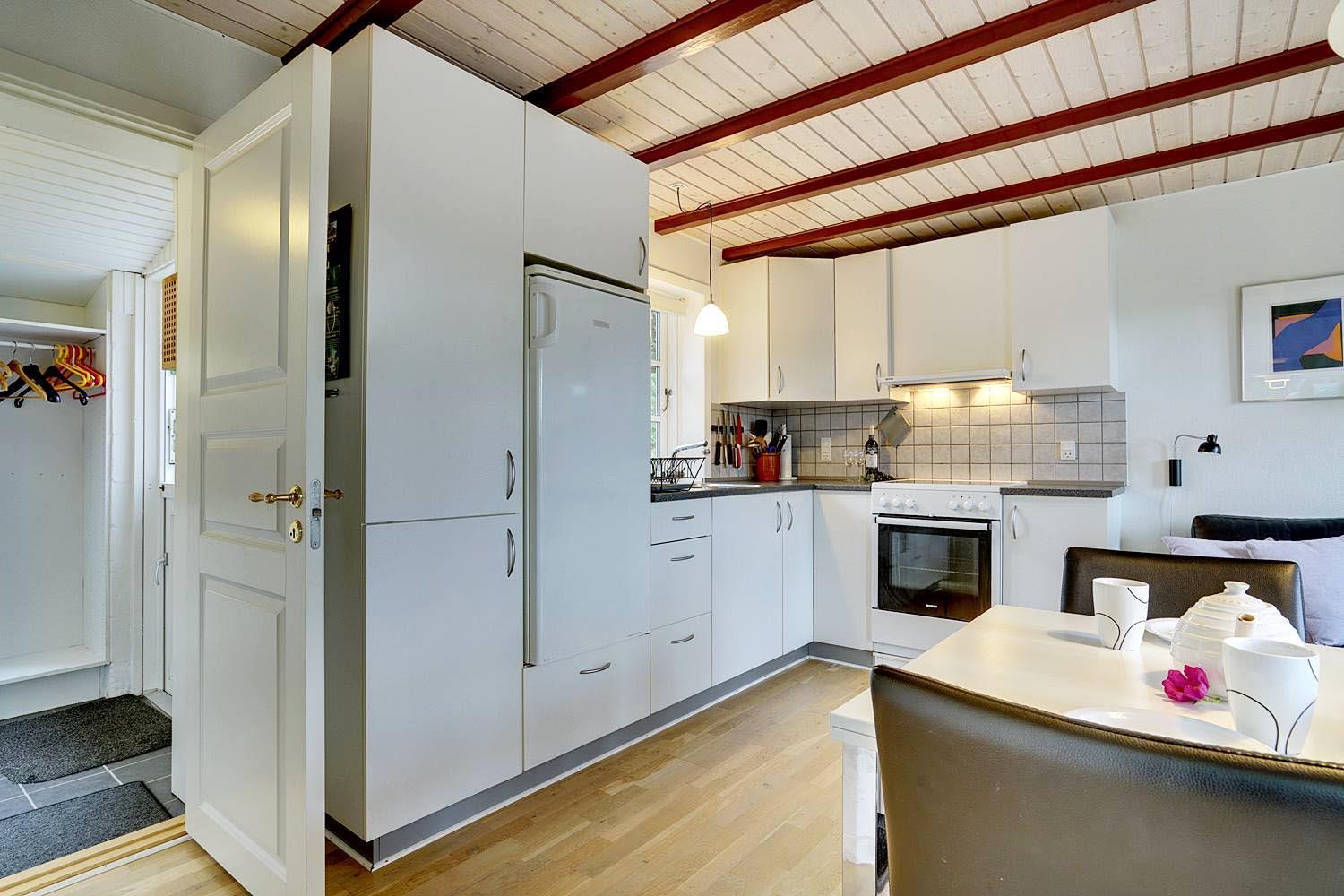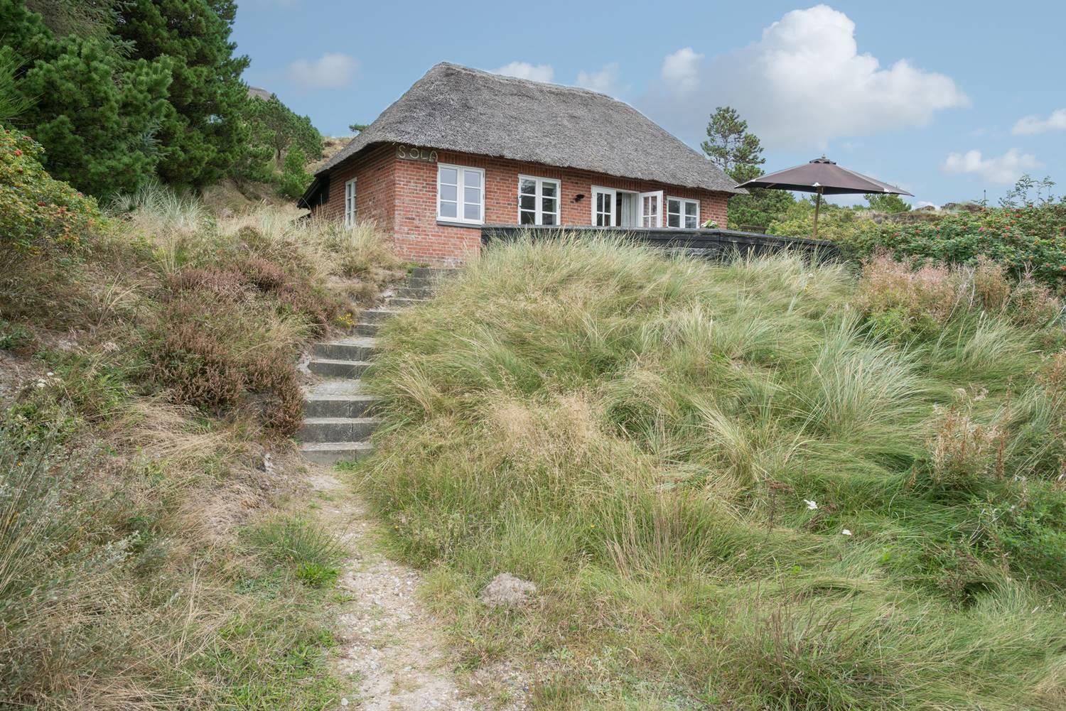Et lille muret feriehus med stråtag og meget charme. Huset er gennem renoveret og fremstår med sine lyse vægge og lofter lyst og venligt. Huset stue og køkken er i samme rum og med udgang til terrassen. Der er et soverum med en dobbeltseng og et med køjesenge.