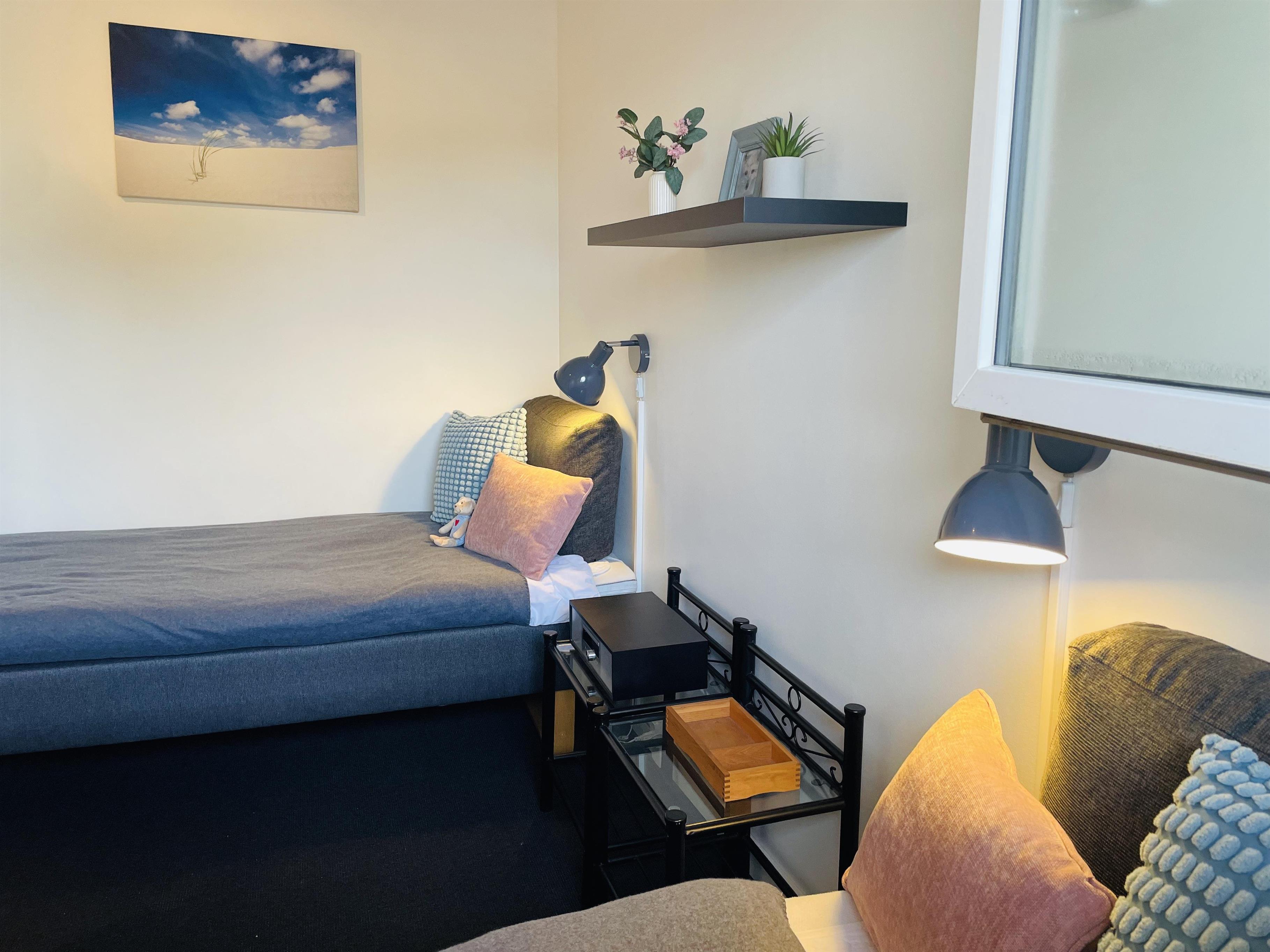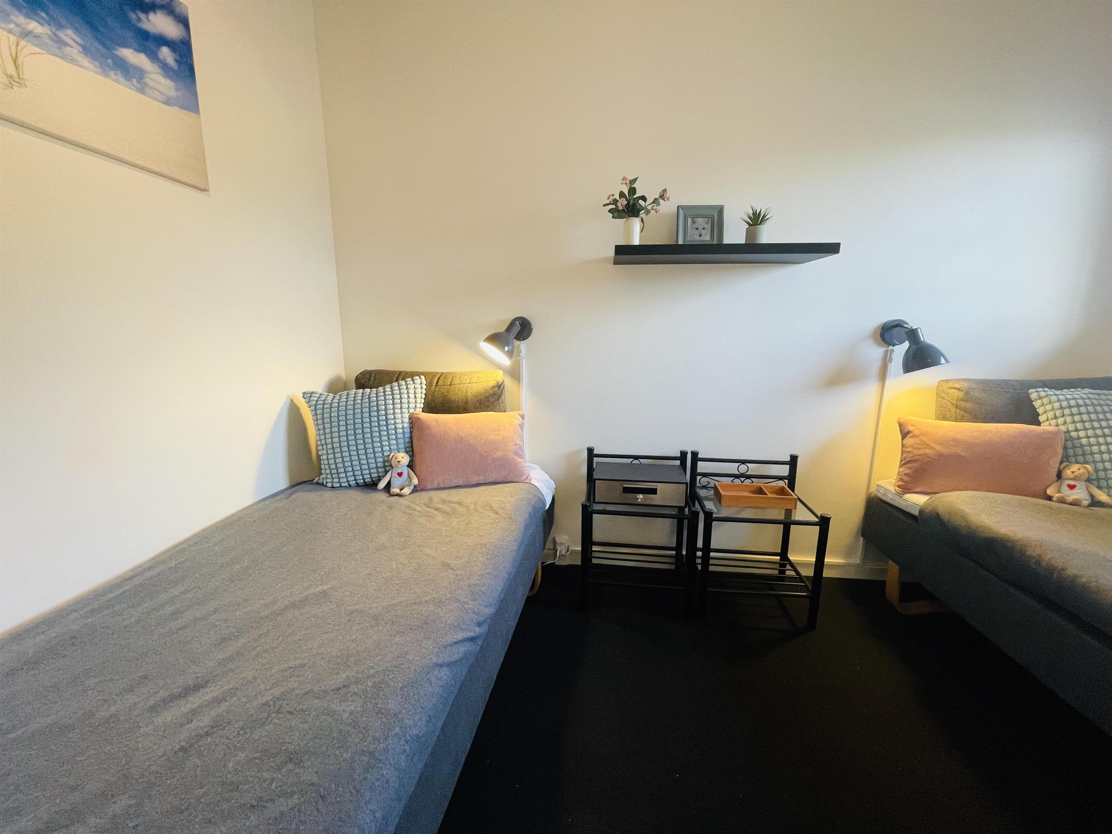 1 soveværelse: 2 enkeltsenge (90x200 cm), som også kan skubbes sammen, samt gulvtæppe.