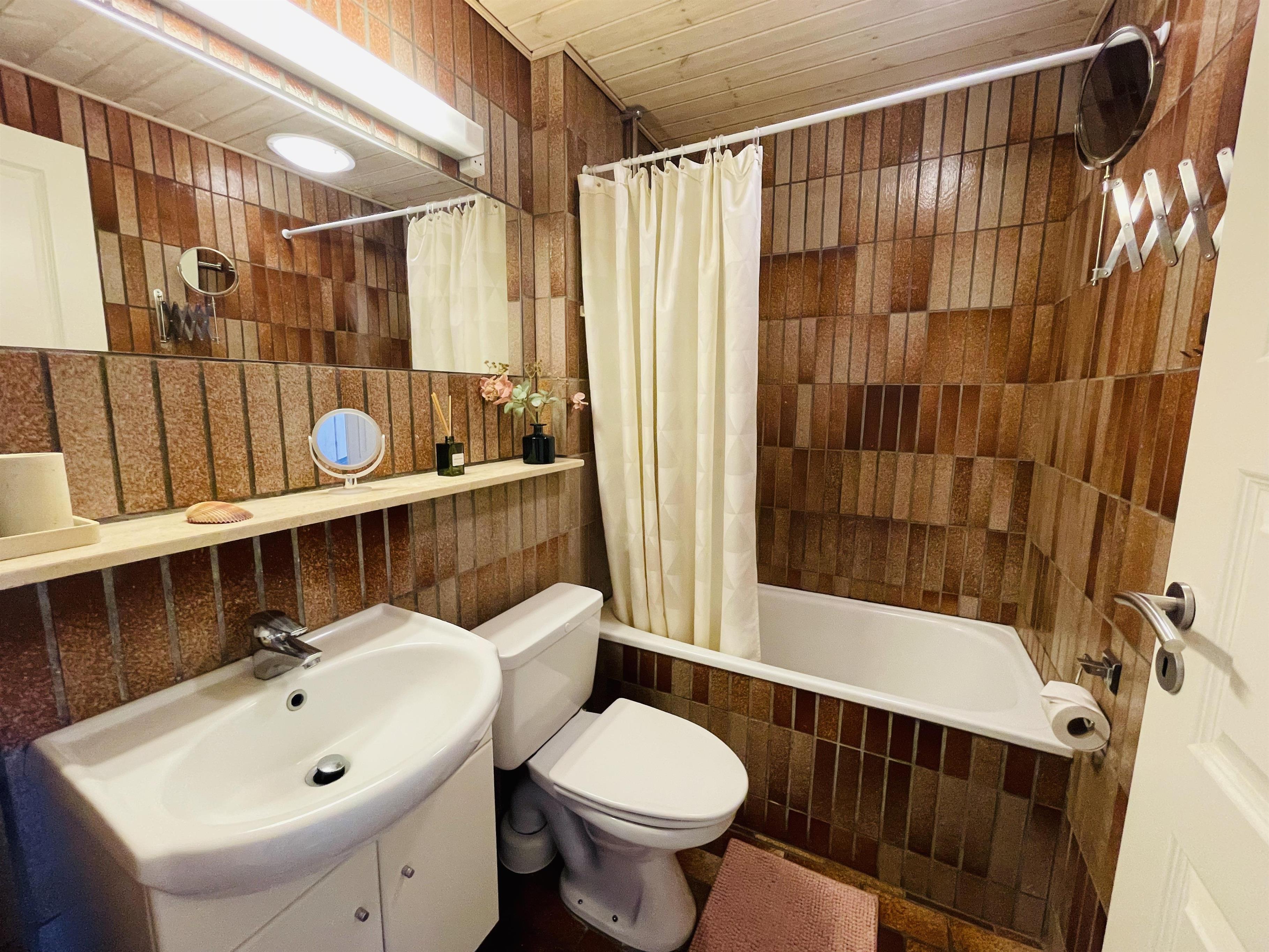 Badeværelset er udstyret med toilet, håndvask og badekar.