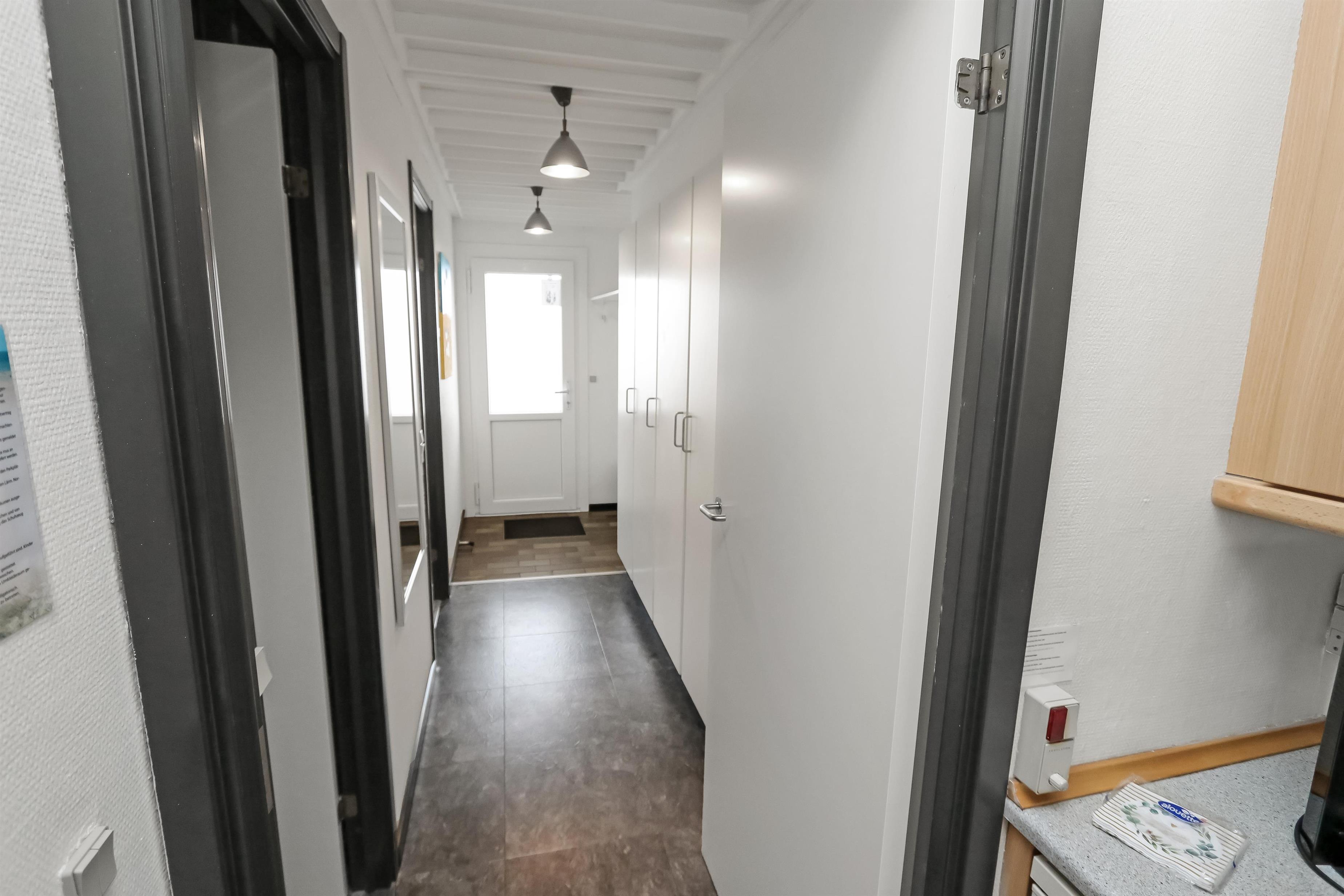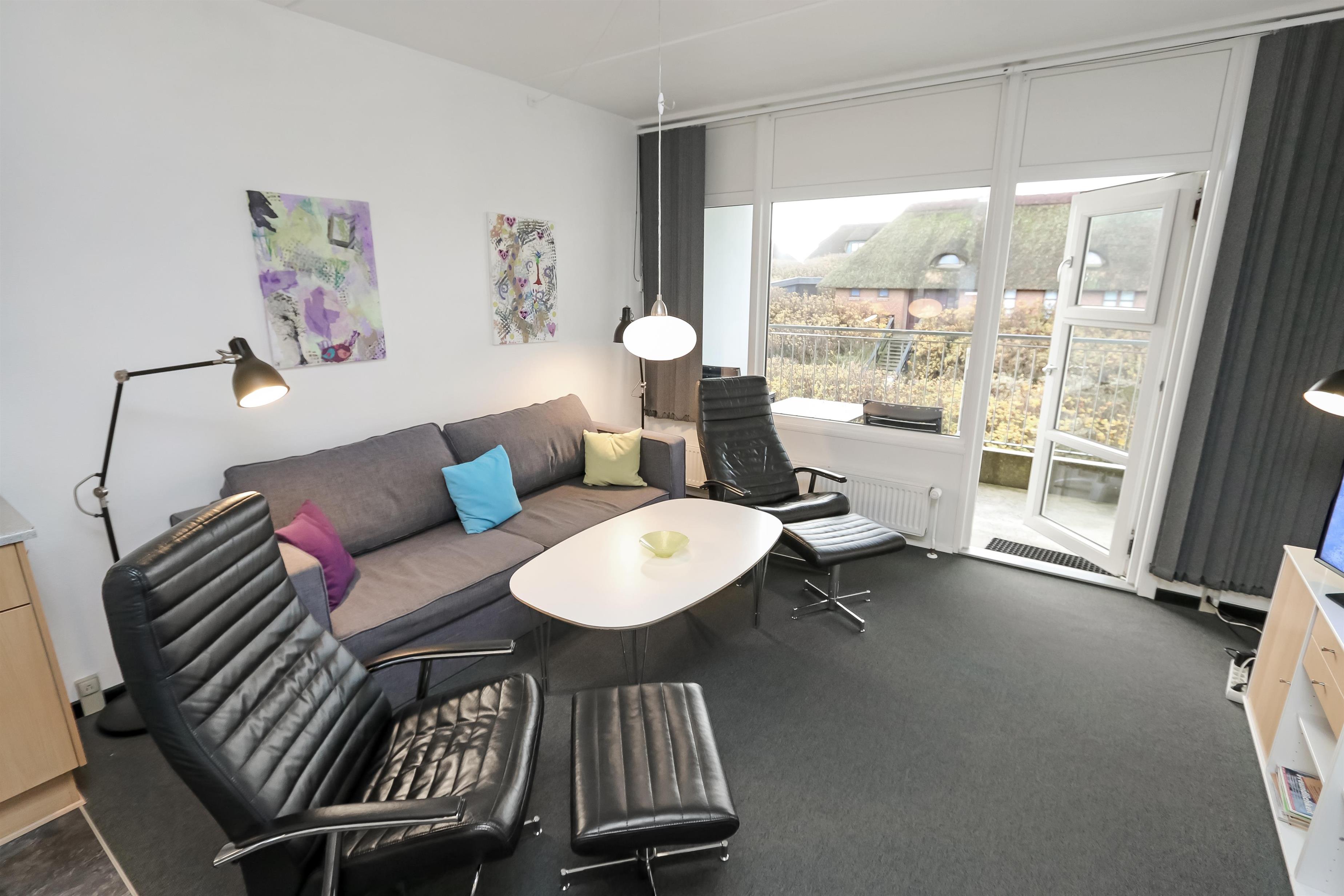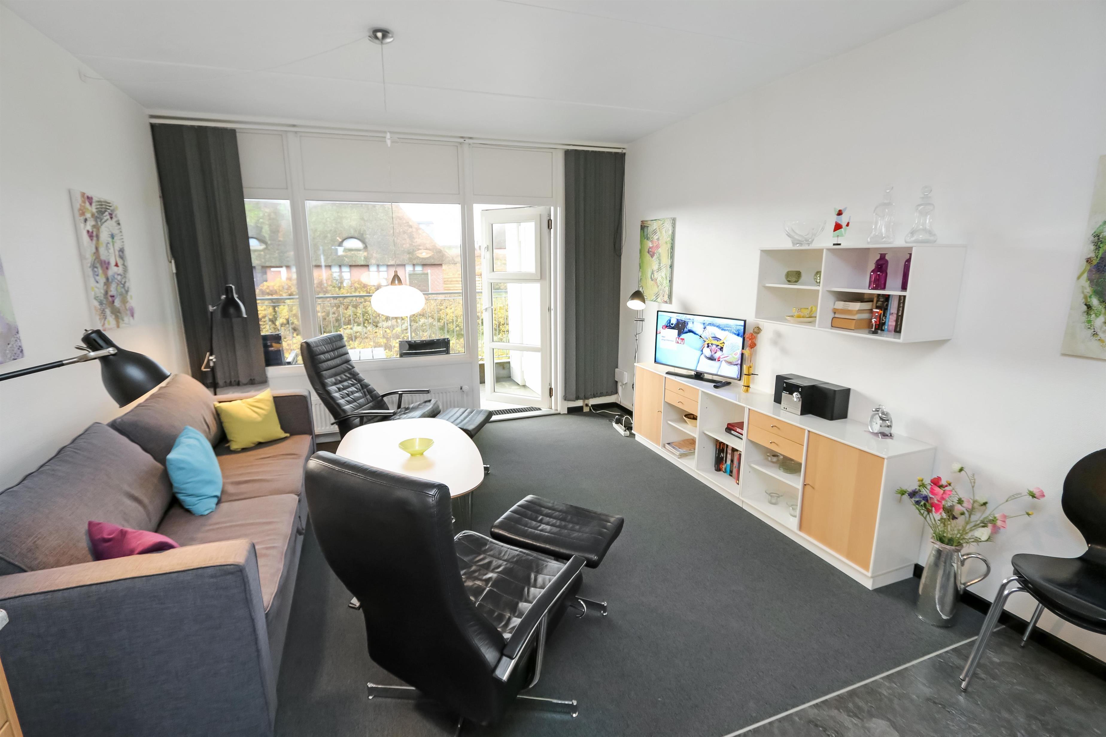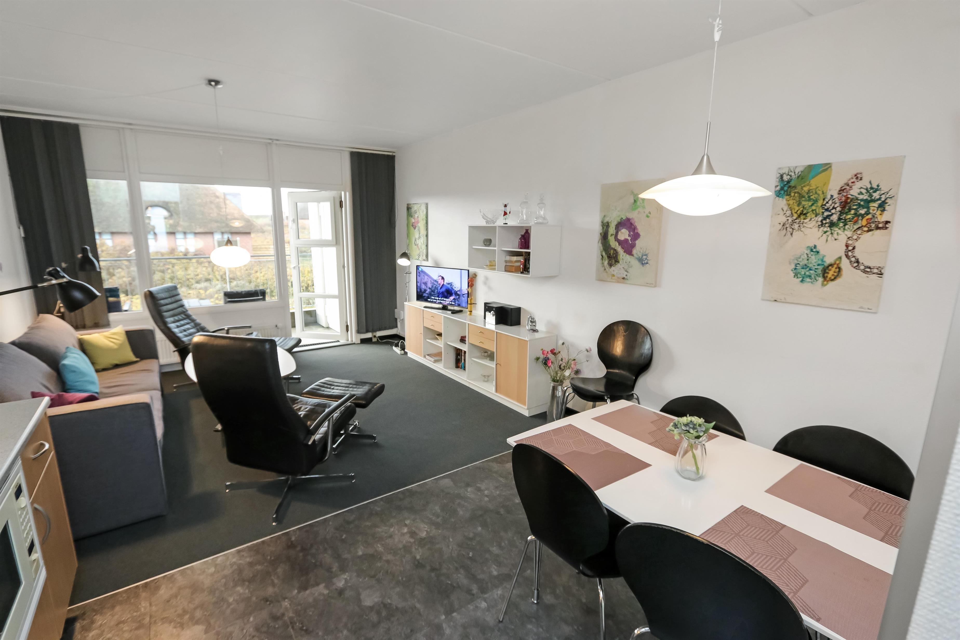 Hyggelig og pæn indrettet ferielejlighed til 4 personer, beliggende på 1. sal med balkon med havemøbler. Kombineret køkken og stue. Køkkenet er indrettet med el-keramisk kogeplade, kombiovn, køleskab med lille frostbox, opvaskemaskine og linoleumsgulv. Stuen er indrettet med polster og lædermøbler, kabel-TV, CD og Radio samt gulvtæppe. Sofa i stuen kan slåes ud så der blir 2 sovepladser. Badeværelse med toilet, håndvask og bruser. 1 Soverum: 1DS + 1S samt gulvtæppe. Trappen til 1. sal består af 21 trappetrin.