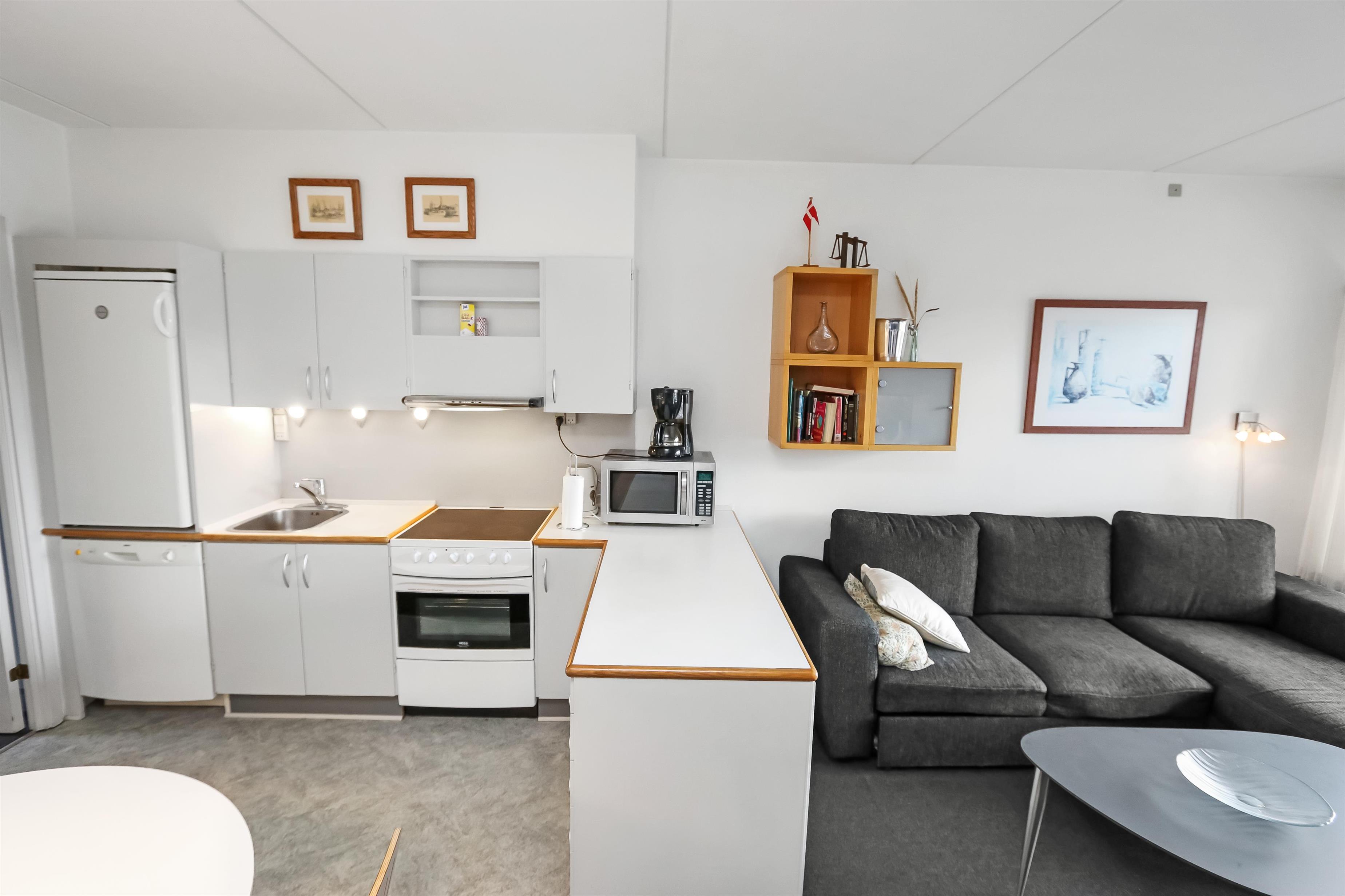 Meget pæn indrettet ferielejlighed beliggende på 1. sal med plads til 4 personer. Kombineret køkken og stue. Køkkenet er indrettet med el-komfur, køleskab med 10 l frostboks, opvaskemaskine, mikroovn og emhætte samt linoleumsgulv. Stuen er indrettet med polster og lædermøbler og sovesofa med plads til 2 personer. Kabel-TV, DVD og gulvtæppe. 1 soverum: 2S samt gulvtæppe. Badeværelse med toilet, håndvask og bruser. Fra stuen er der udgang til lille overdækket balkon med havemøbler. Trappen til 1. sal består af 40 trappetrin.