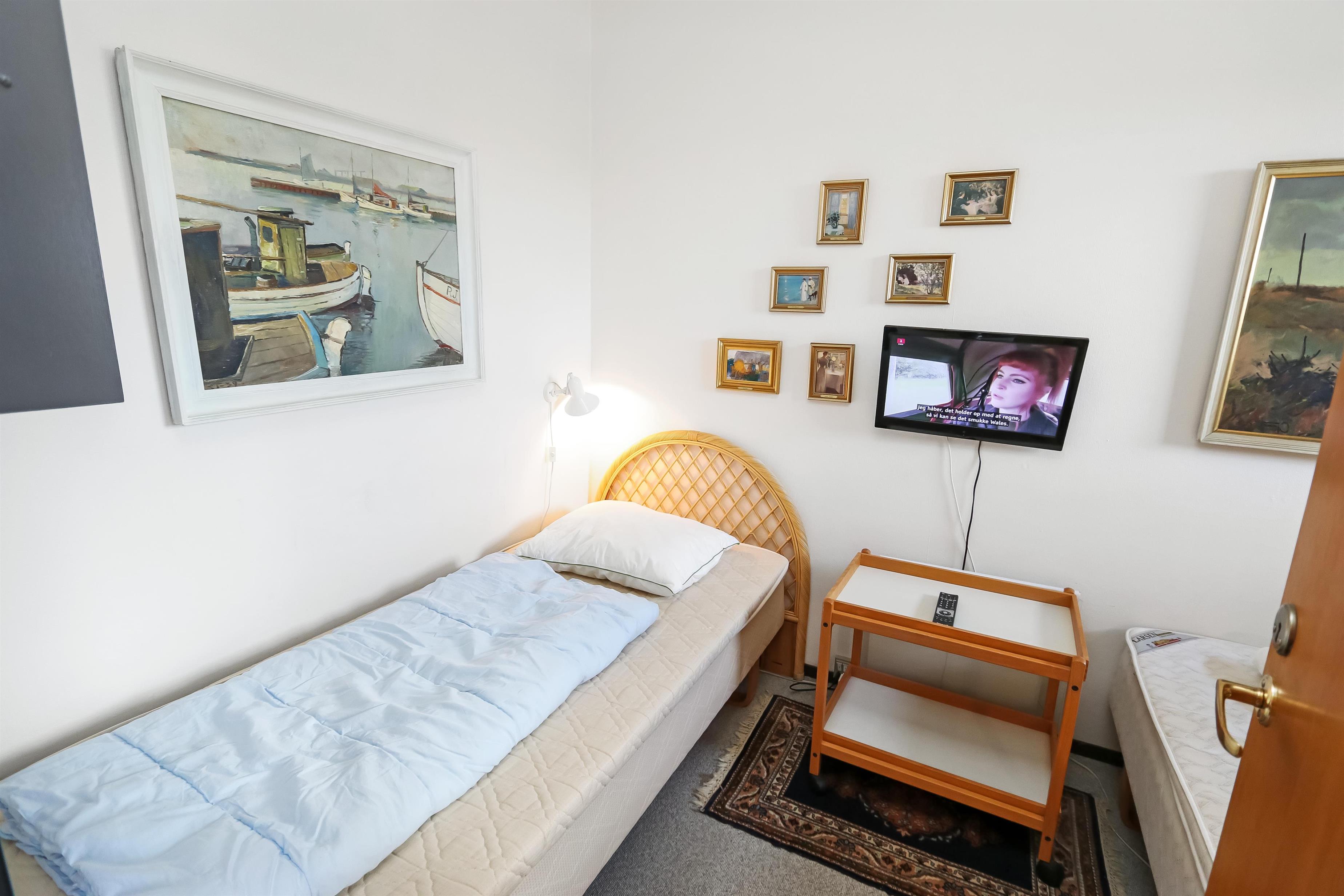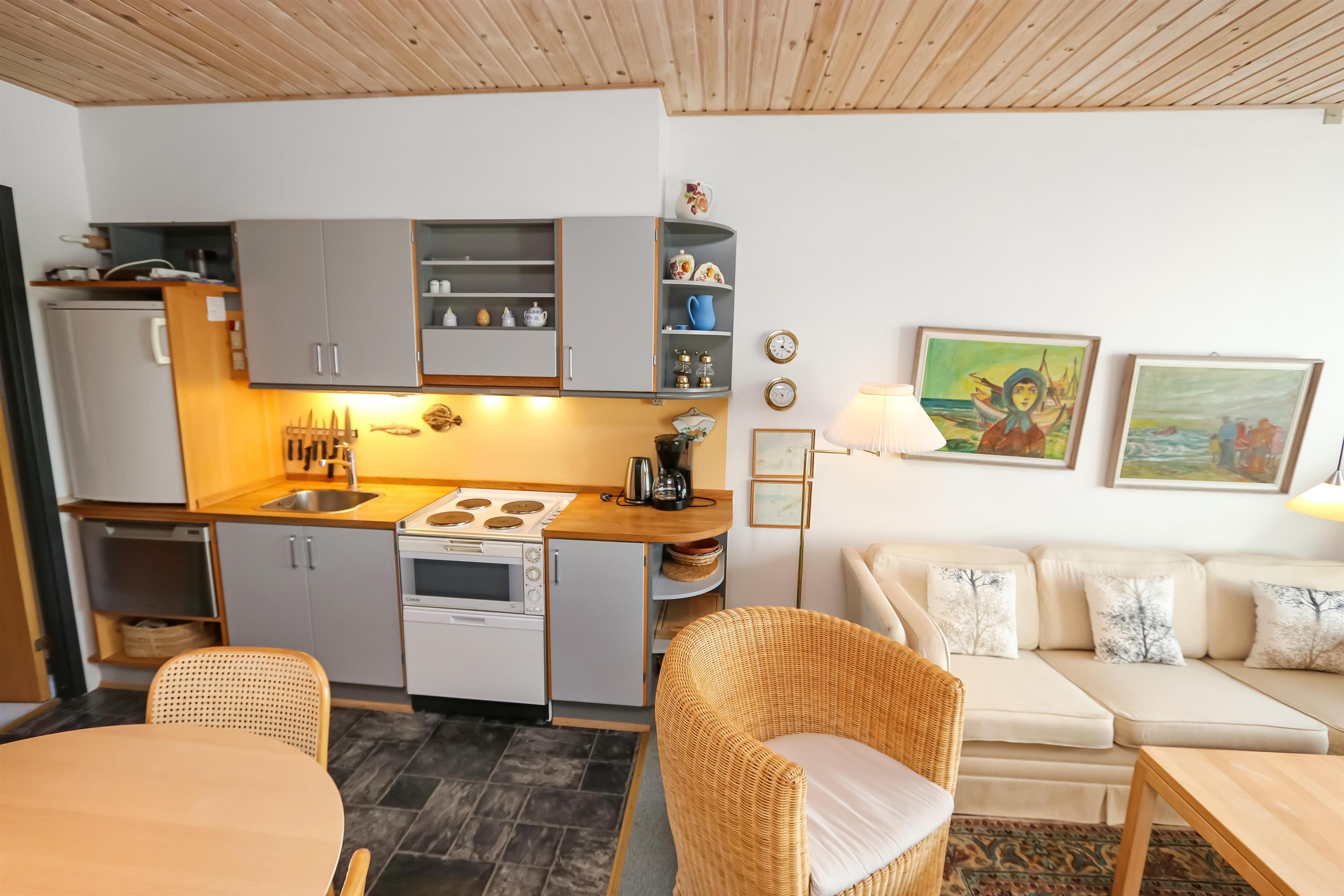 Personlig og pæn indrettet ferielejlighed til 2 personer beliggende på 1. sal. Kombineret stue og køkkenafdeling. Køkkenet er indrettet med el-komfur, køleskab med 10 l frostboks, opvaskemaskine, emhætte og linoleumsgulv. Stuen er indrettet med kabel-TV, DVD, radio, polstermøbler og gulvtæppe. Badeværelse med toilet, håndvask og bruser. 1 soverum: 1DS + 1S og gulvtæppe. Fra stuen er der udgang til overdækket balkon med havemøbler. Trappen til 1. sal består af 40 trappetrin.