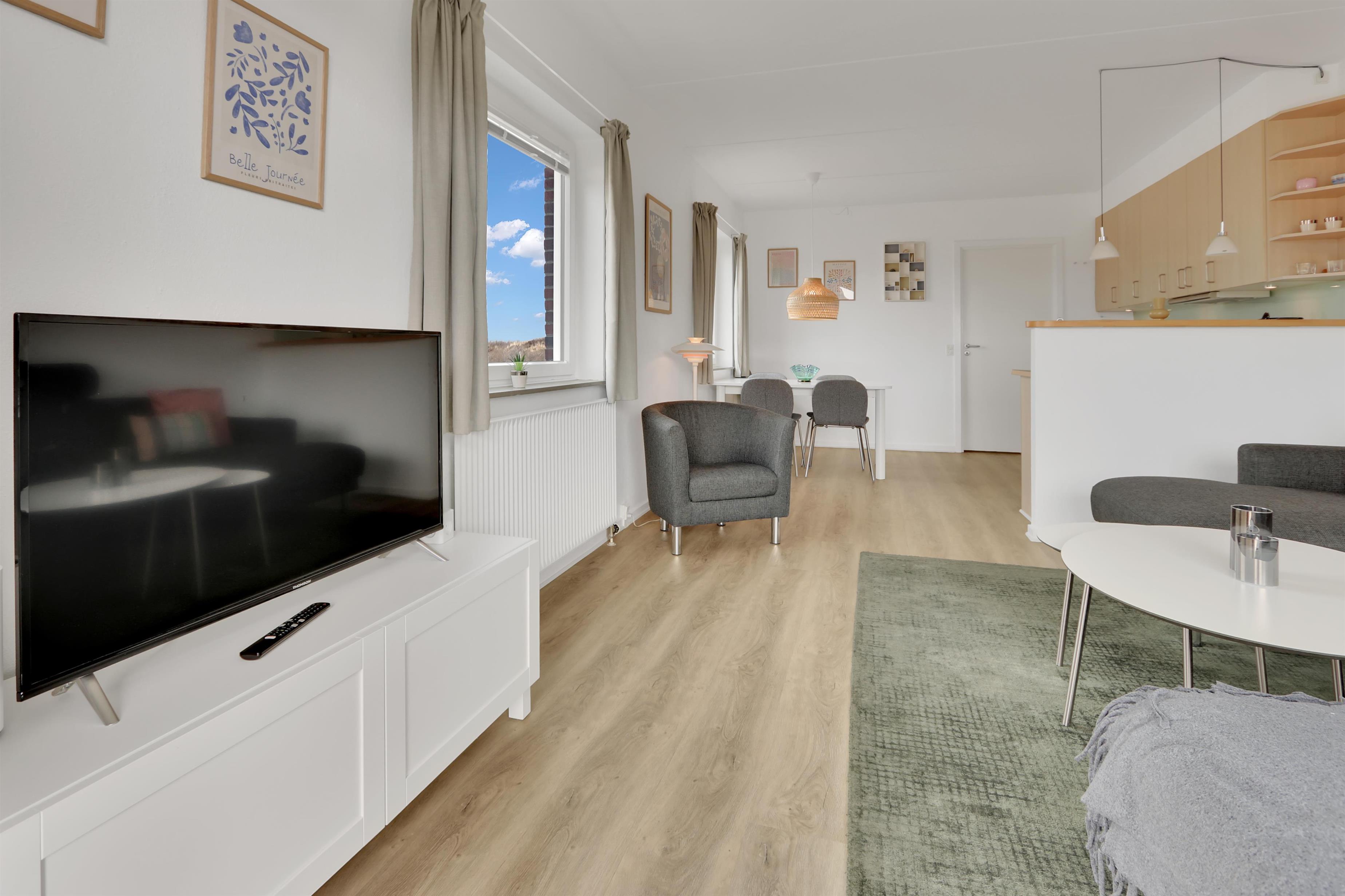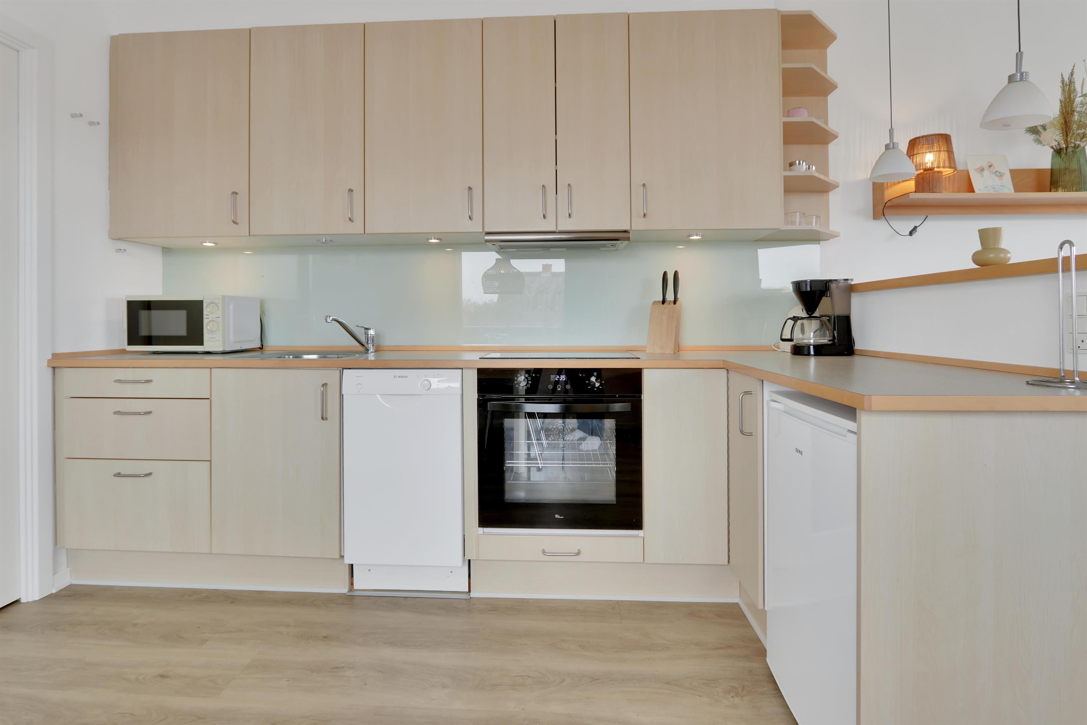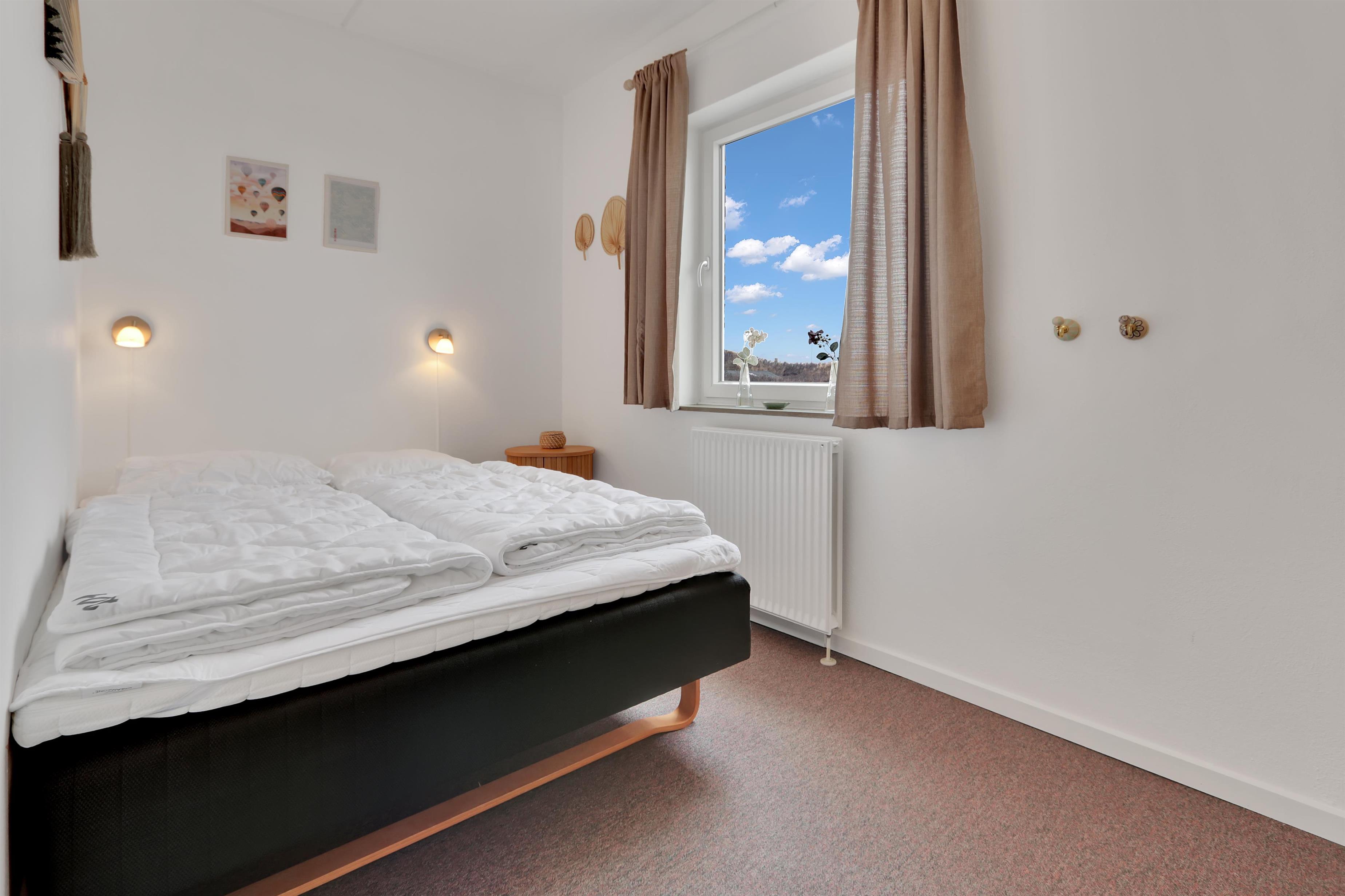 Pæn og hyggelig indrettet ferielejlighed til 5 personer beliggende på 1. sal. Kombineret stue og køkken. Stuen er indrettet med polstermøbler, kabel-TV og laminatgulv. Køkkenet er indrettet med glaskeramisk komfur, køleskab, mikroovn, emhætte, opvaskemaskine og laminatgulv. 2 soverum: 1DS + 1S og 1DS, gulvtæppe. Badeværelse med toilet, håndvask og bruser. Fra stuen er der udgang til overdækket balkon med havemøbler. Trappen til 1. sal består af 21 trappetrin. Ikke-ryger lejlighed. Det er ikke tilladt at medbringe husdyr i lejligheden. Vi gør dog opmærksom på, at lejligheden ikke er allergivenlig, og at vi ikke kan garantere, at der udenfor udlejningsperioderne ikke kommer husdyr i lejligheden.