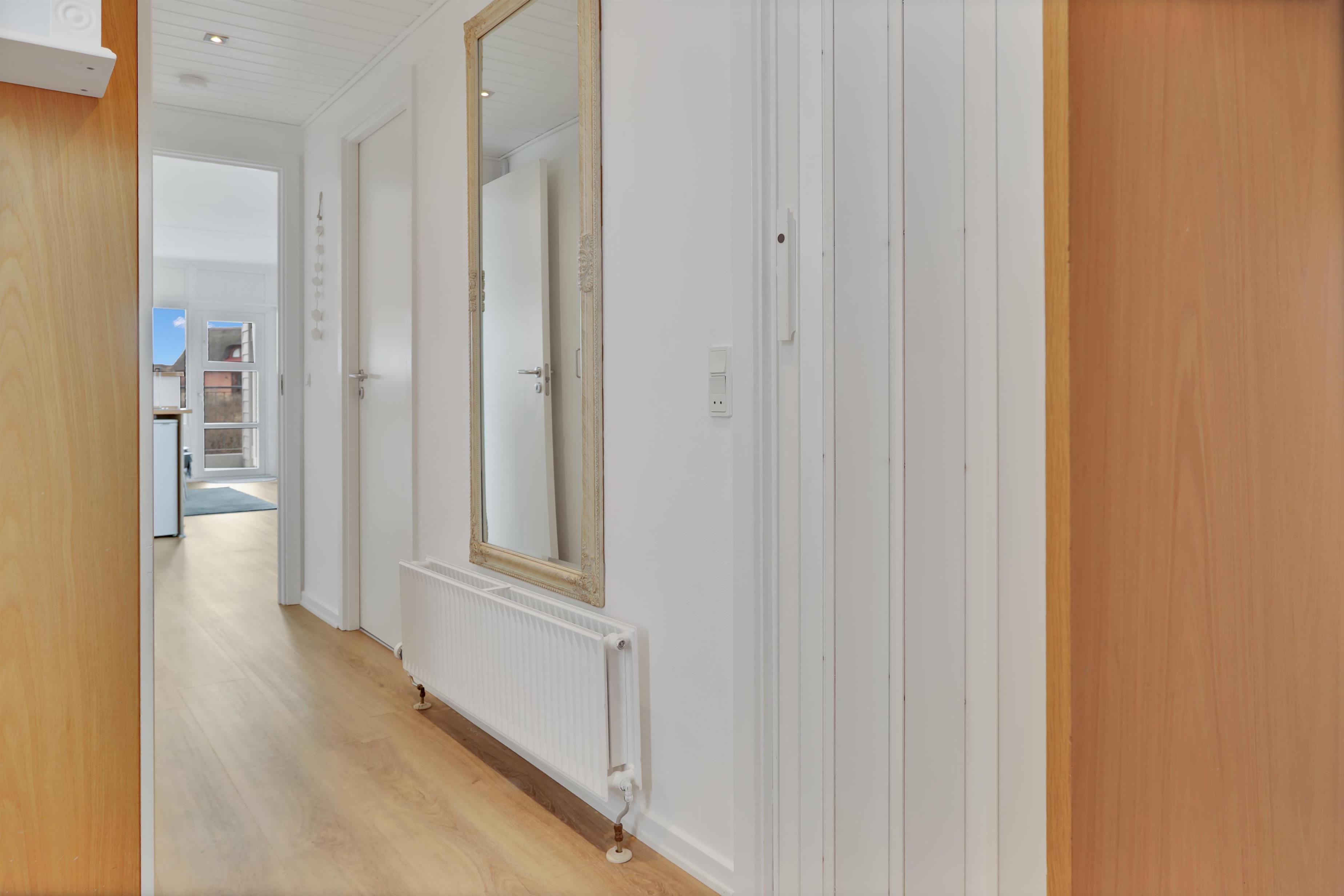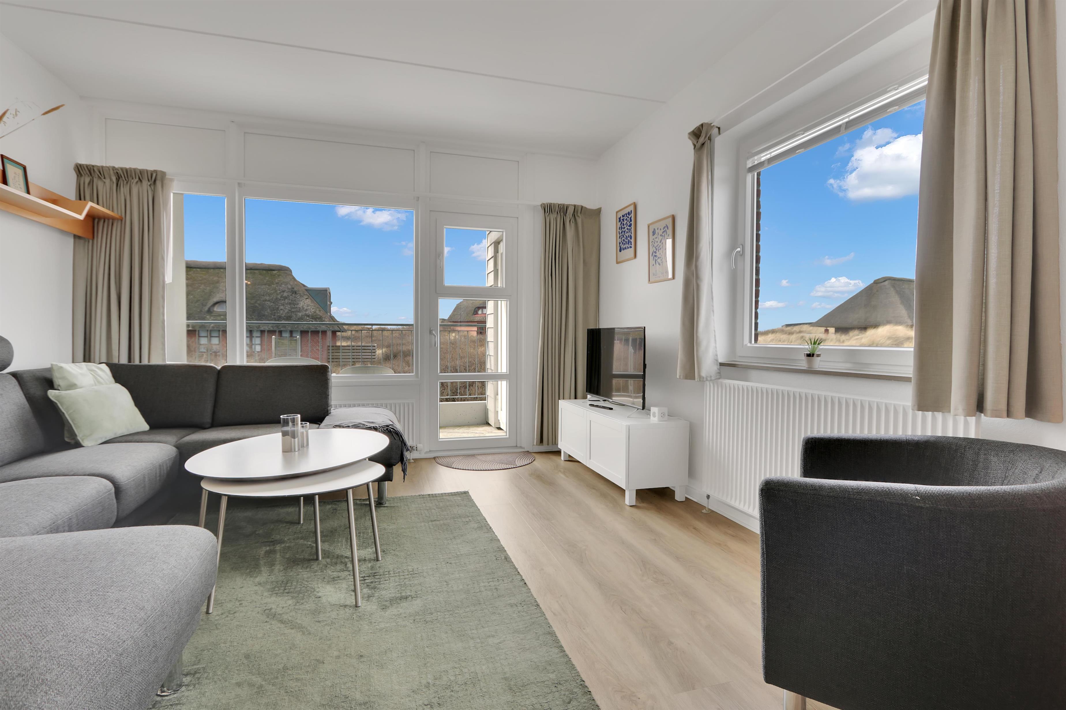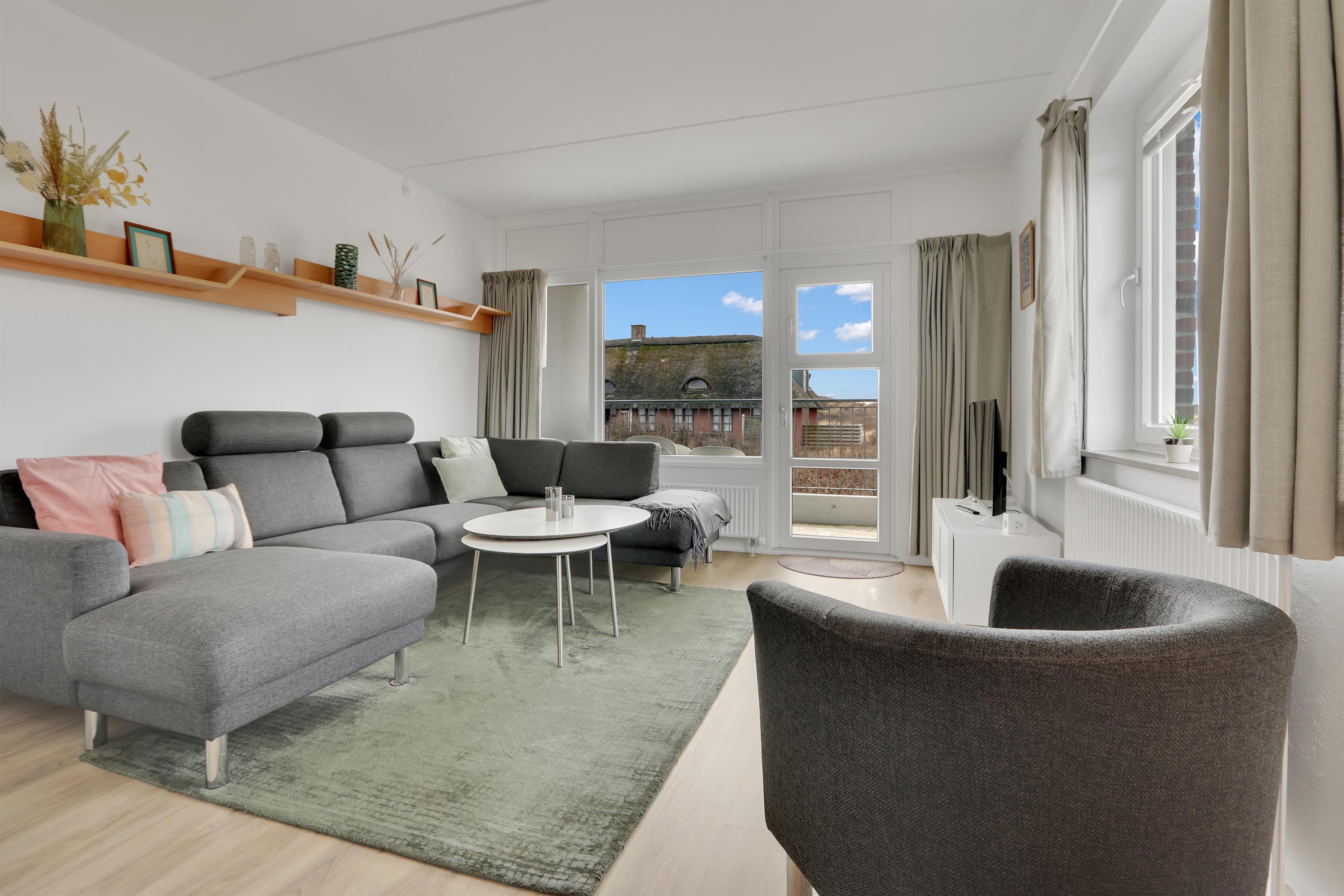 Pæn og hyggelig indrettet ferielejlighed til 5 personer beliggende på 1. sal. Kombineret stue og køkken. Stuen er indrettet med polstermøbler, kabel-TV og laminatgulv. Køkkenet er indrettet med glaskeramisk komfur, køleskab, mikroovn, emhætte, opvaskemaskine og laminatgulv. 2 soverum: 1DS + 1S og 1DS, gulvtæppe. Badeværelse med toilet, håndvask og bruser. Fra stuen er der udgang til overdækket balkon med havemøbler. Trappen til 1. sal består af 21 trappetrin. Ikke-ryger lejlighed. Det er ikke tilladt at medbringe husdyr i lejligheden. Vi gør dog opmærksom på, at lejligheden ikke er allergivenlig, og at vi ikke kan garantere, at der udenfor udlejningsperioderne ikke kommer husdyr i lejligheden.