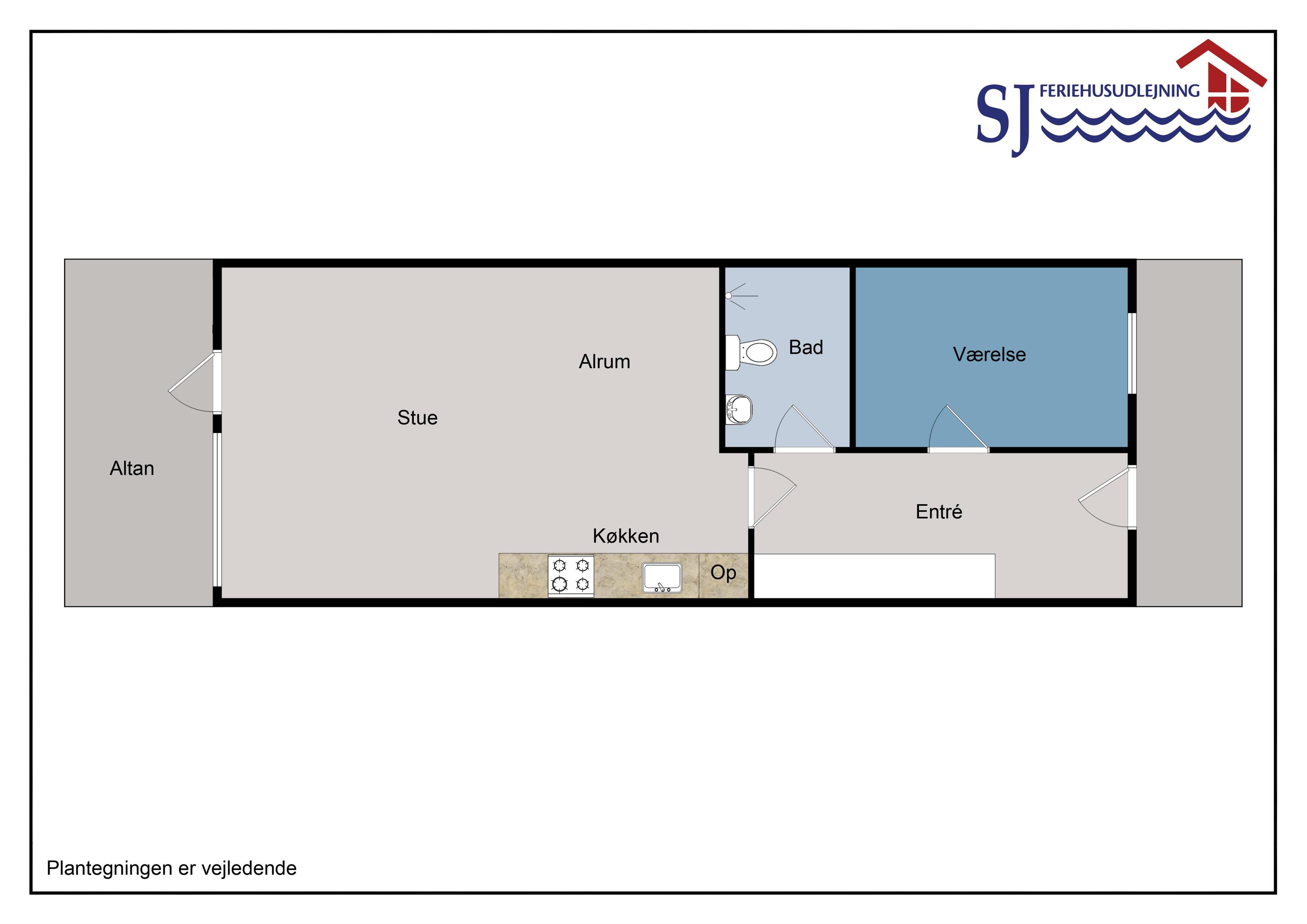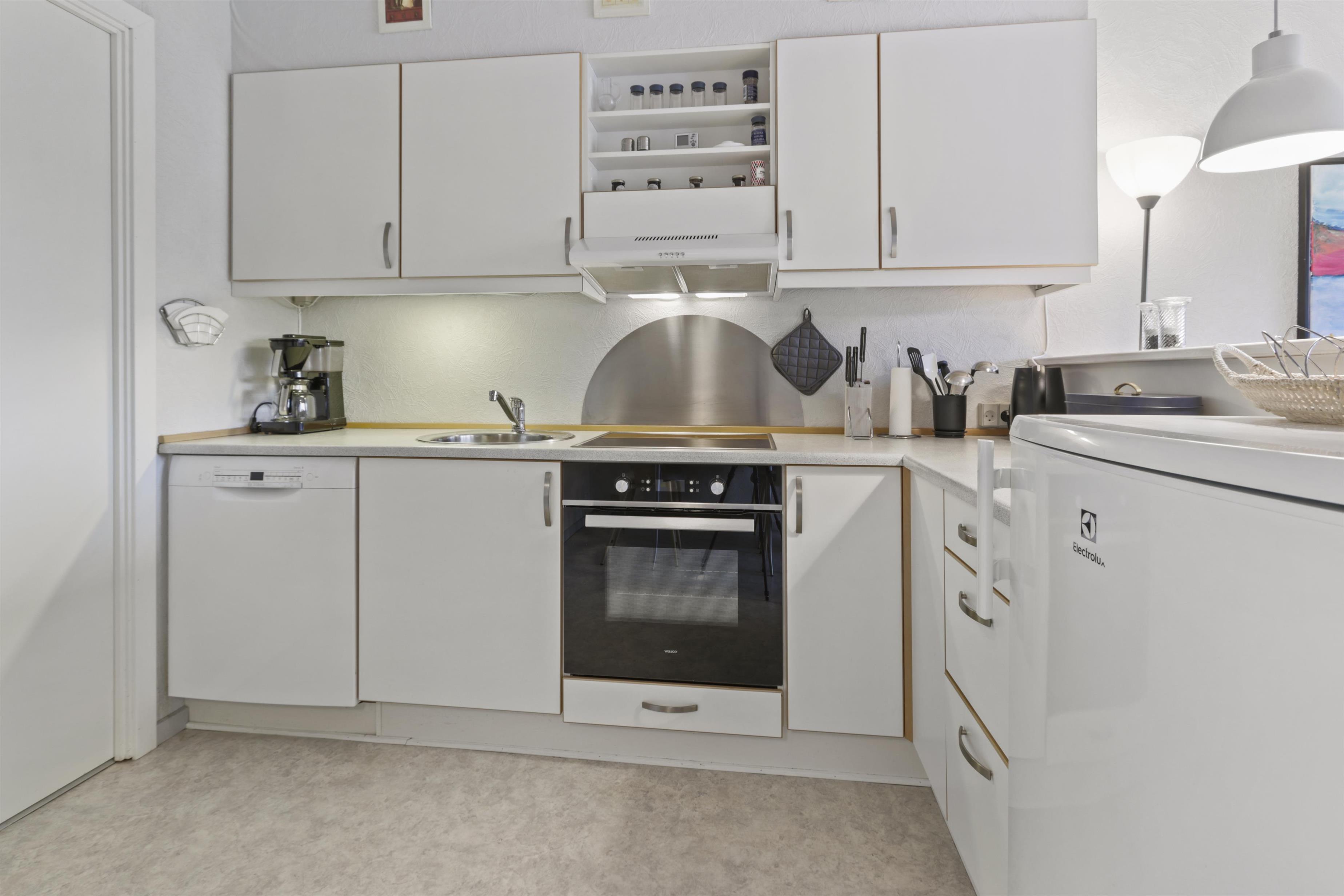 Nyrenoveret ferielejlighed til 4 personer beliggende på 1. sal. Indeholder soveværelse med en dobbeltseng og 1 enkeltseng, og kombineret køkken og stue. Stuen er indrettet med polster- og lædermøbler og sovesofa, radio og TV og nye spisestuestole. Køkkenet har keramisk el-kogeplade, stort køleskab med frostboks, emhætte samt ny indbygget ovn. Badeværelse med toilet, håndvask, brusekabine og gulvvarme.