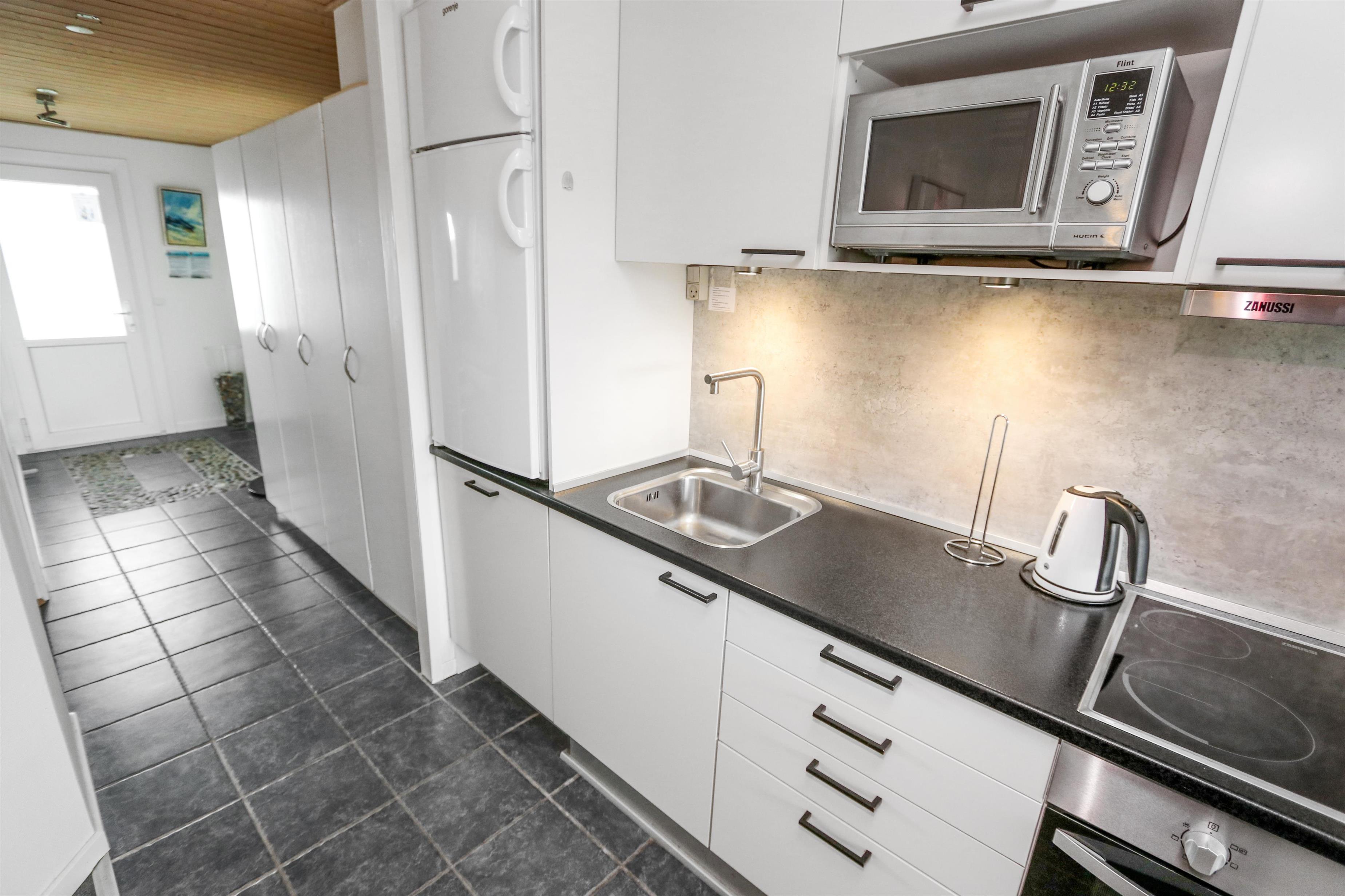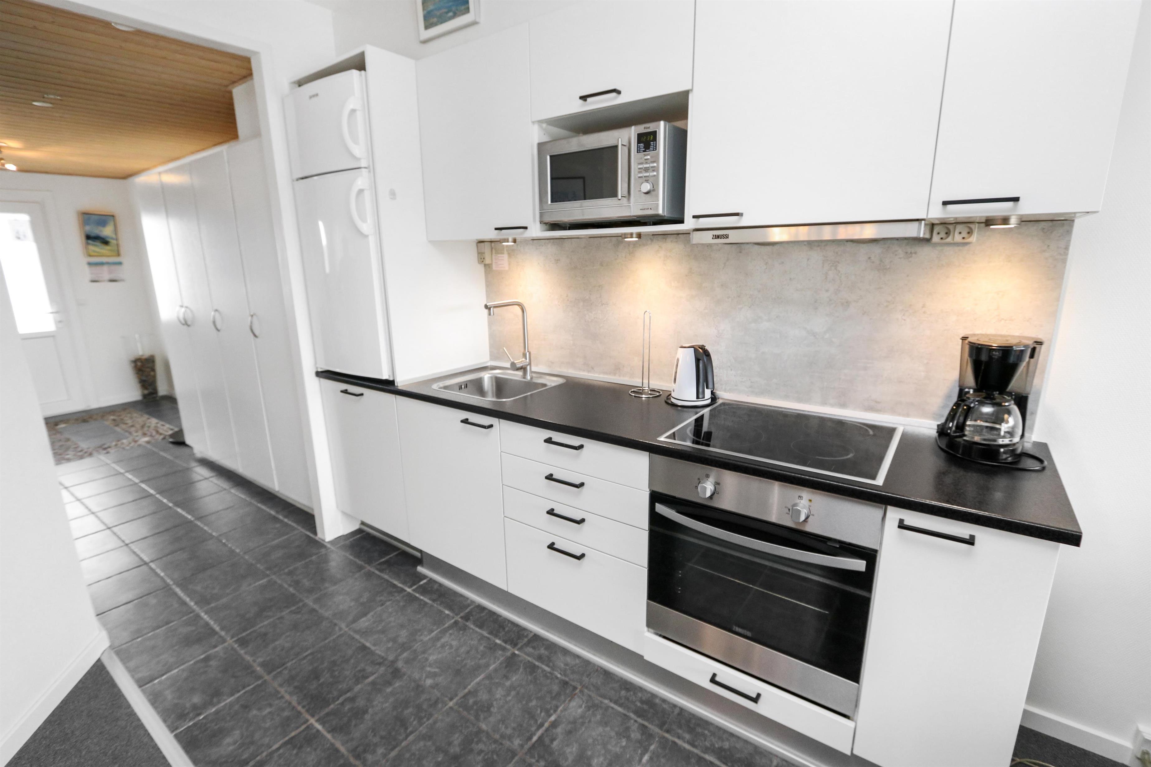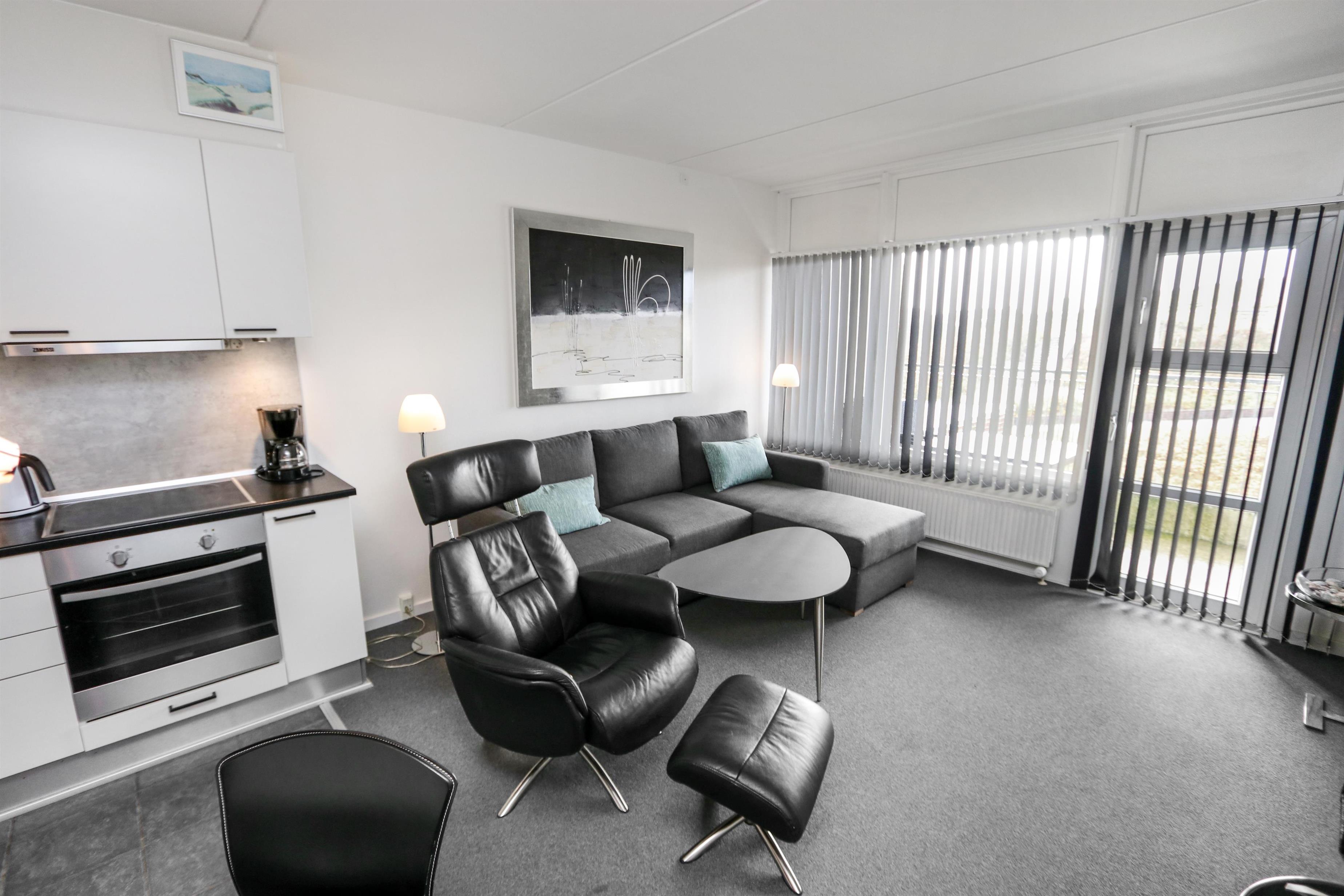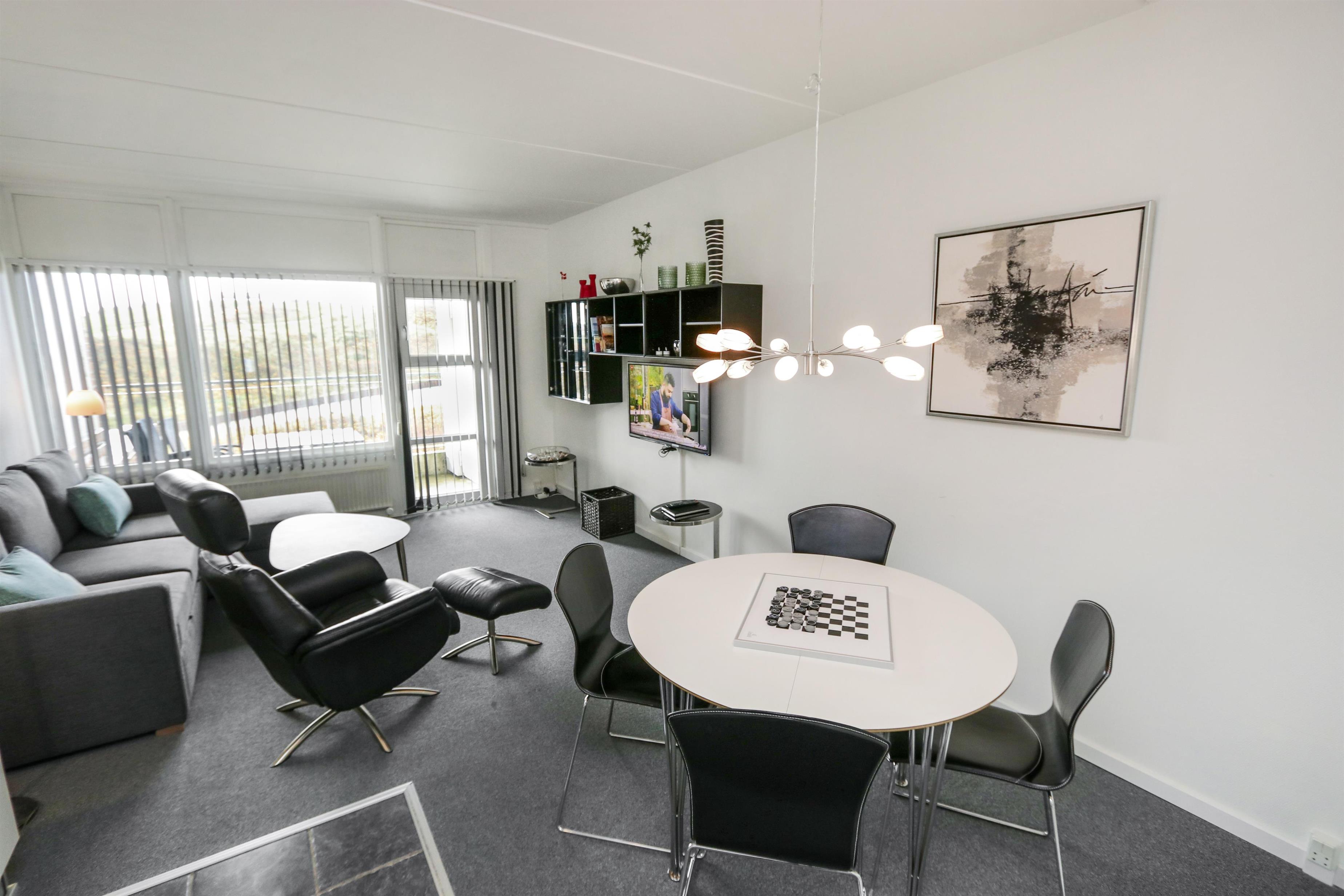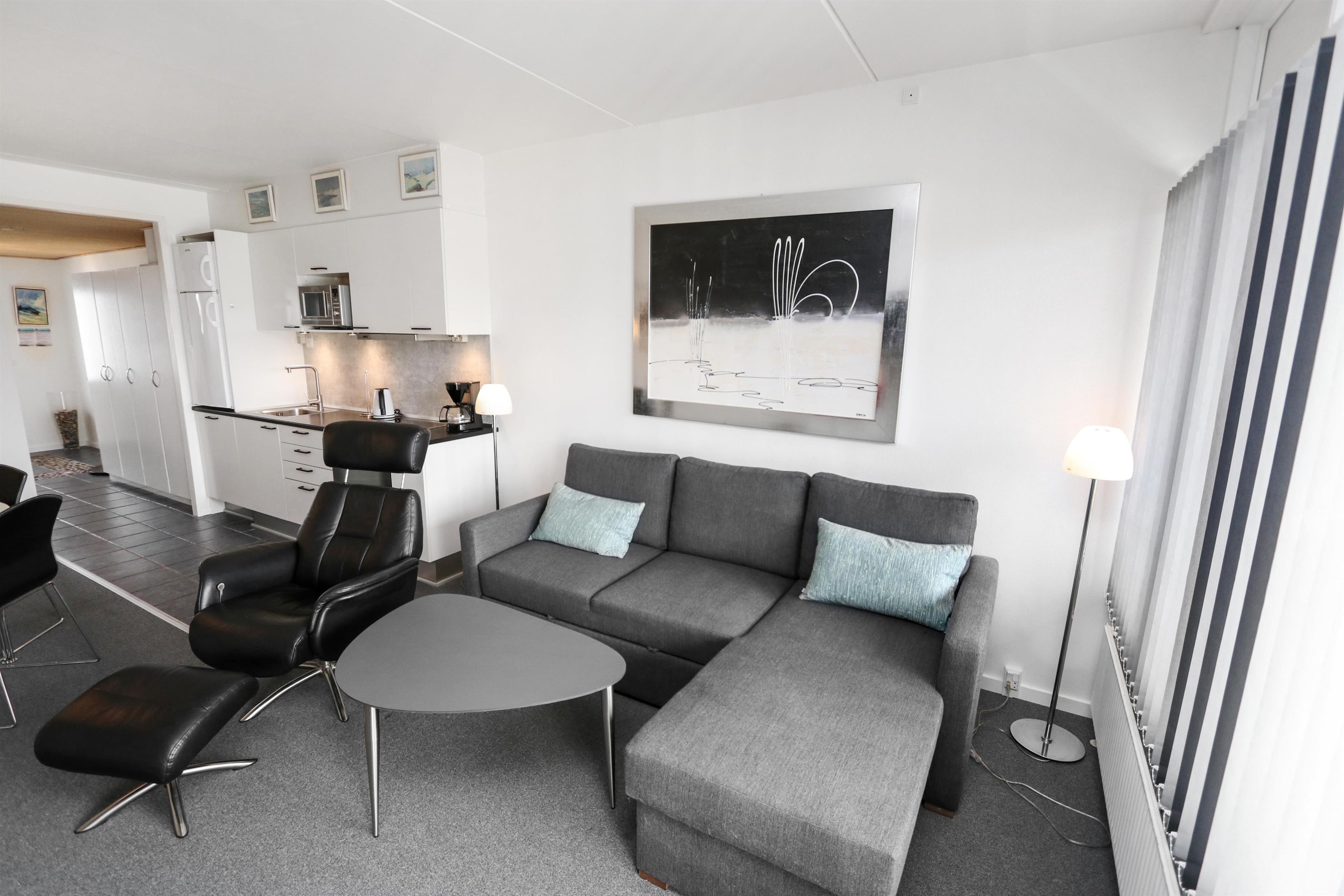 Flot og moderne indrettet ferielejlighed til 4 personer. Kombineret stue og køkken. Stuen er indrettet med flotte læder og polstermøbler, kabel-TV og gulvtæppe. I stuen er der desuden sovesofa med plads til 2 personer. Køkkenet er med glaskeramisk komfur, emhætte, køle-/fryseskab, mikroovn, opvaskemaskine. Flot nyt badeværelse med toilet, håndvask og bruser samt klinker. 1 soverum: 2S og gulvtæppe. Fra stuen er der udgang til overdækket balkon med havemøbler. Trappen til 1. sal består af 40 trappetrin.