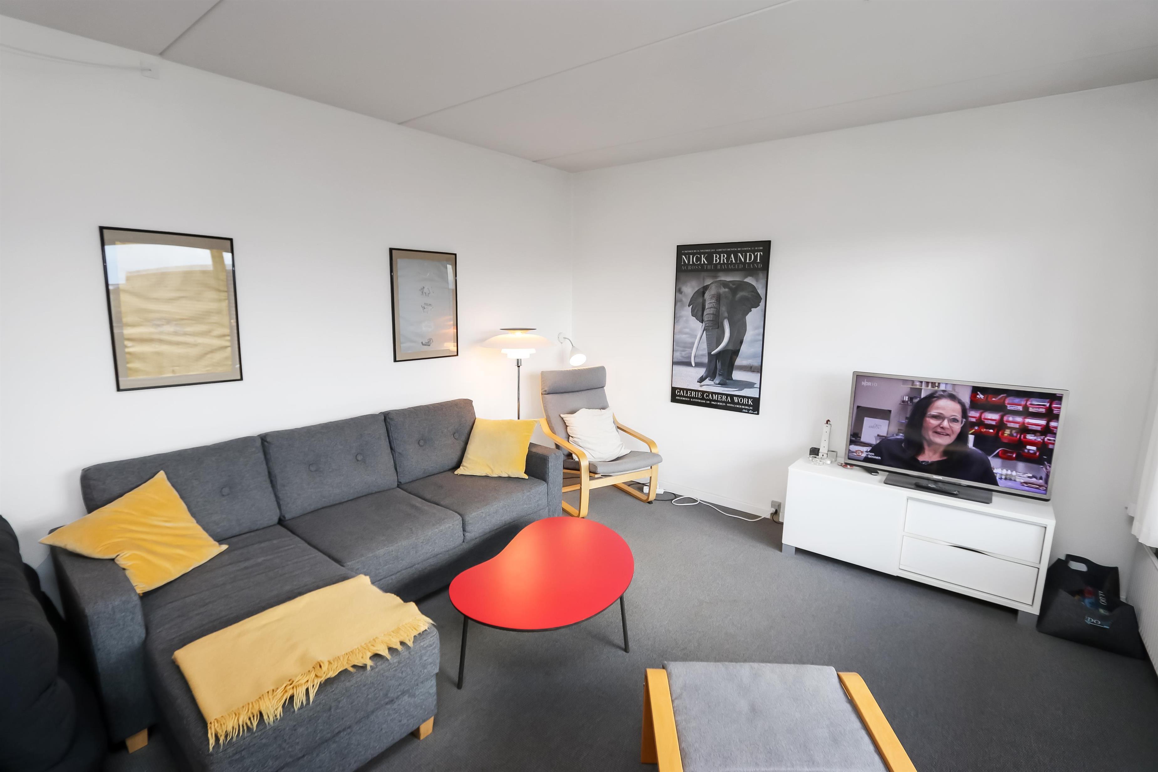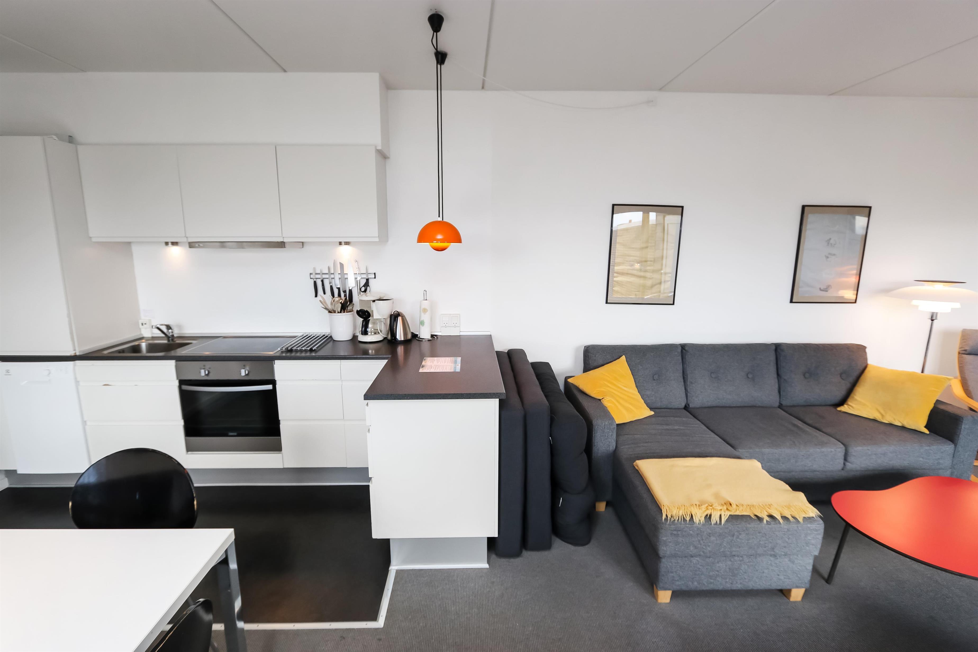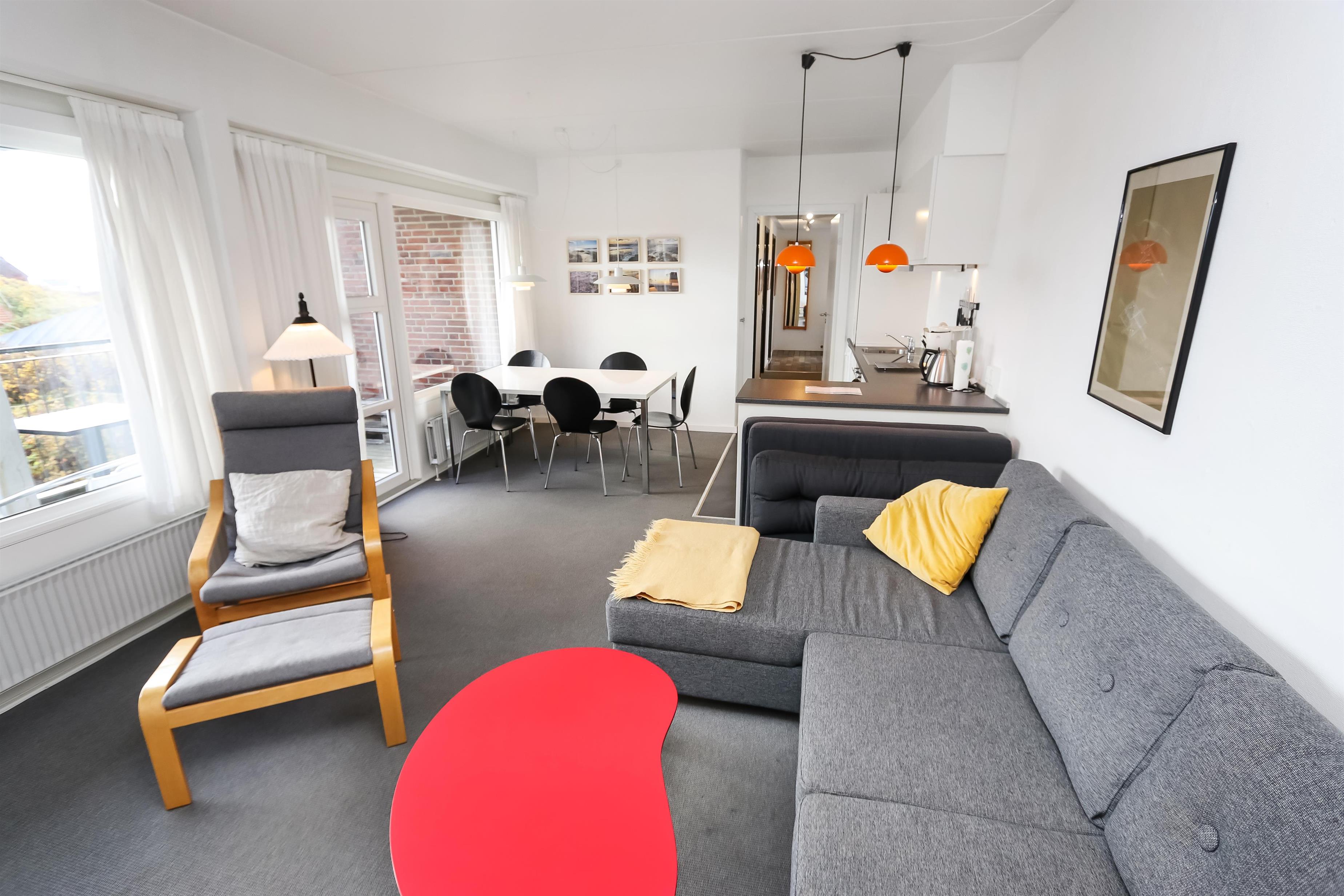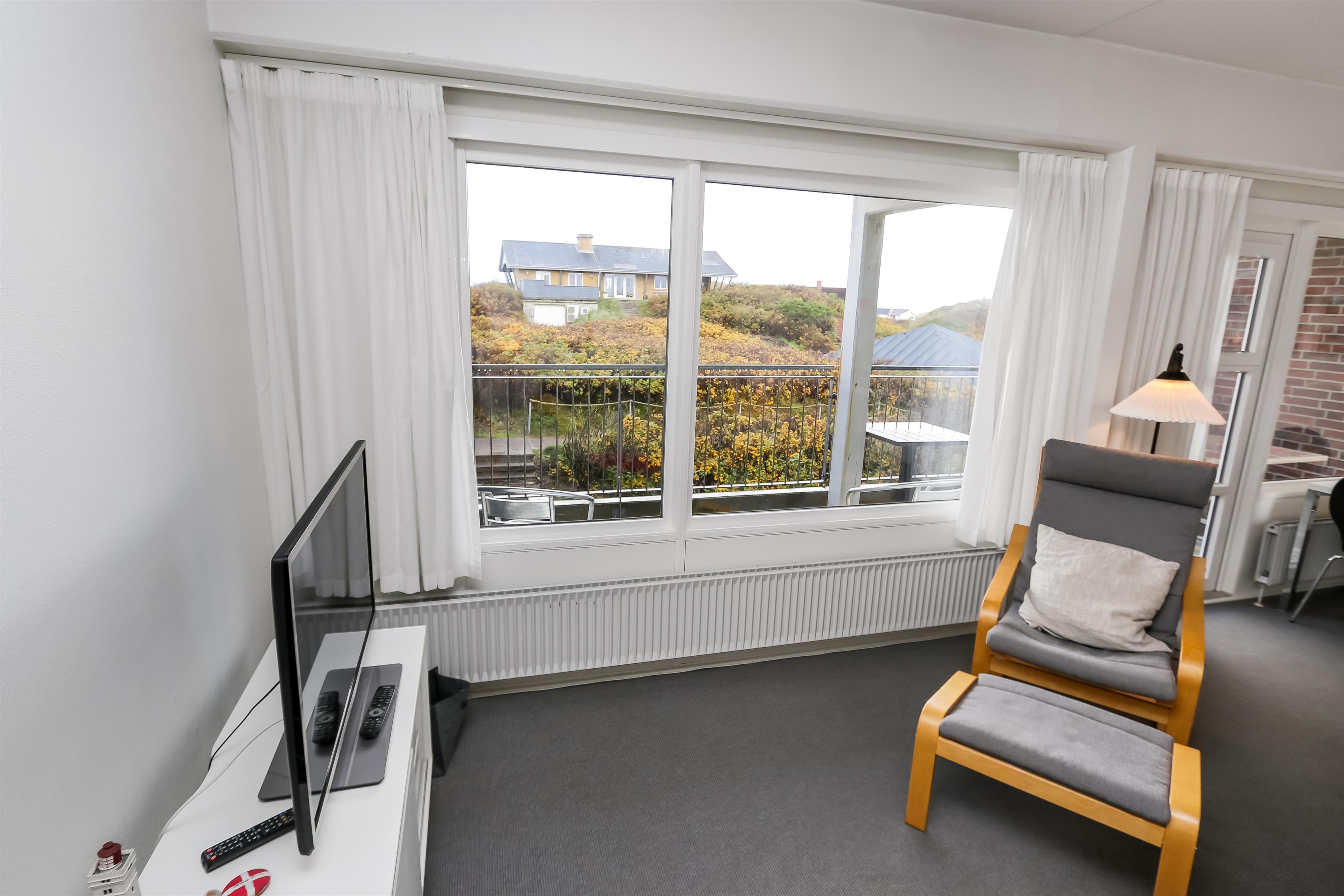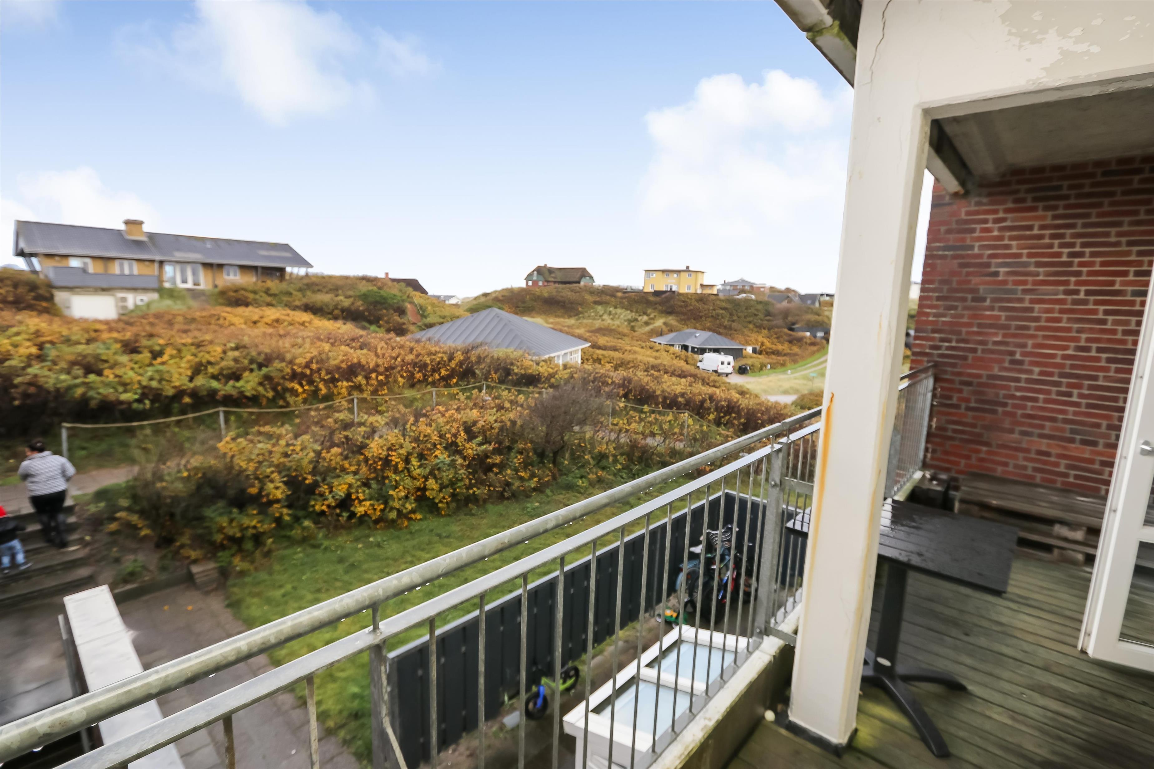 Dejlig hjørne lejlighed med god beliggenhed på 1. sal med balkon og havemøbler. Fra stuen og balkonen kan man se havet mellem klitterne. Kombineret stue og køkken. Køkkenet er indrettet med glaskeramisk komfur, emhætte, køleskab med lille frostbox, opvaskemaskine, mikroovn og linoleumsgulv. Pæn indrettet stue med kabel-TV, DVD, polstermøbler og gulvtæppe. Sofaen i stuen kan slåes ud så der blir 2 sovepladser. 2 soverum: 1S og 1 3/4 seng med en overkøje, 1DS der er gulvtæpper i begge værelser. Badeværelse med toilet, håndvask og bruser. Trappen til 1. sal består af 40 trappetrin.