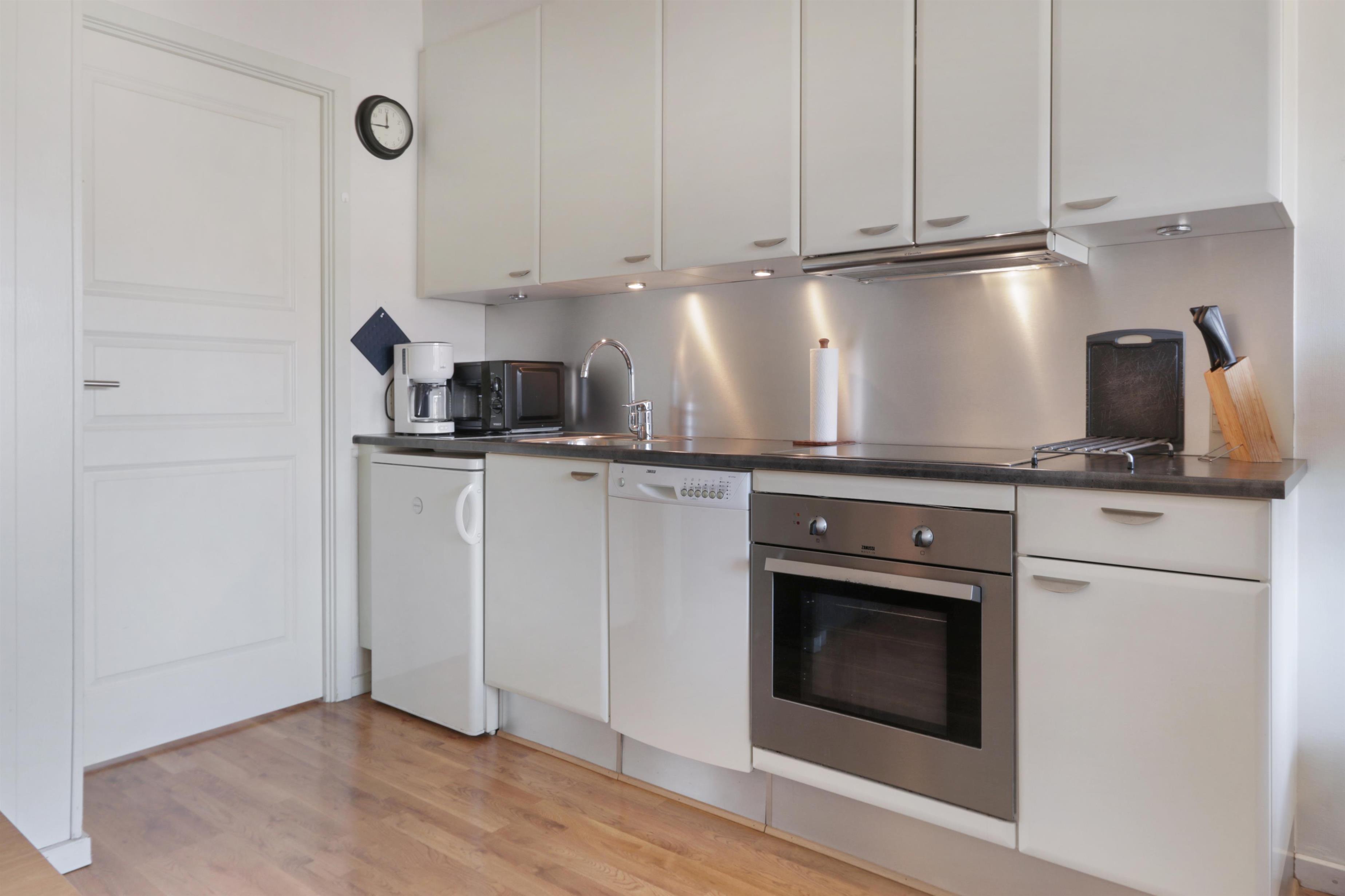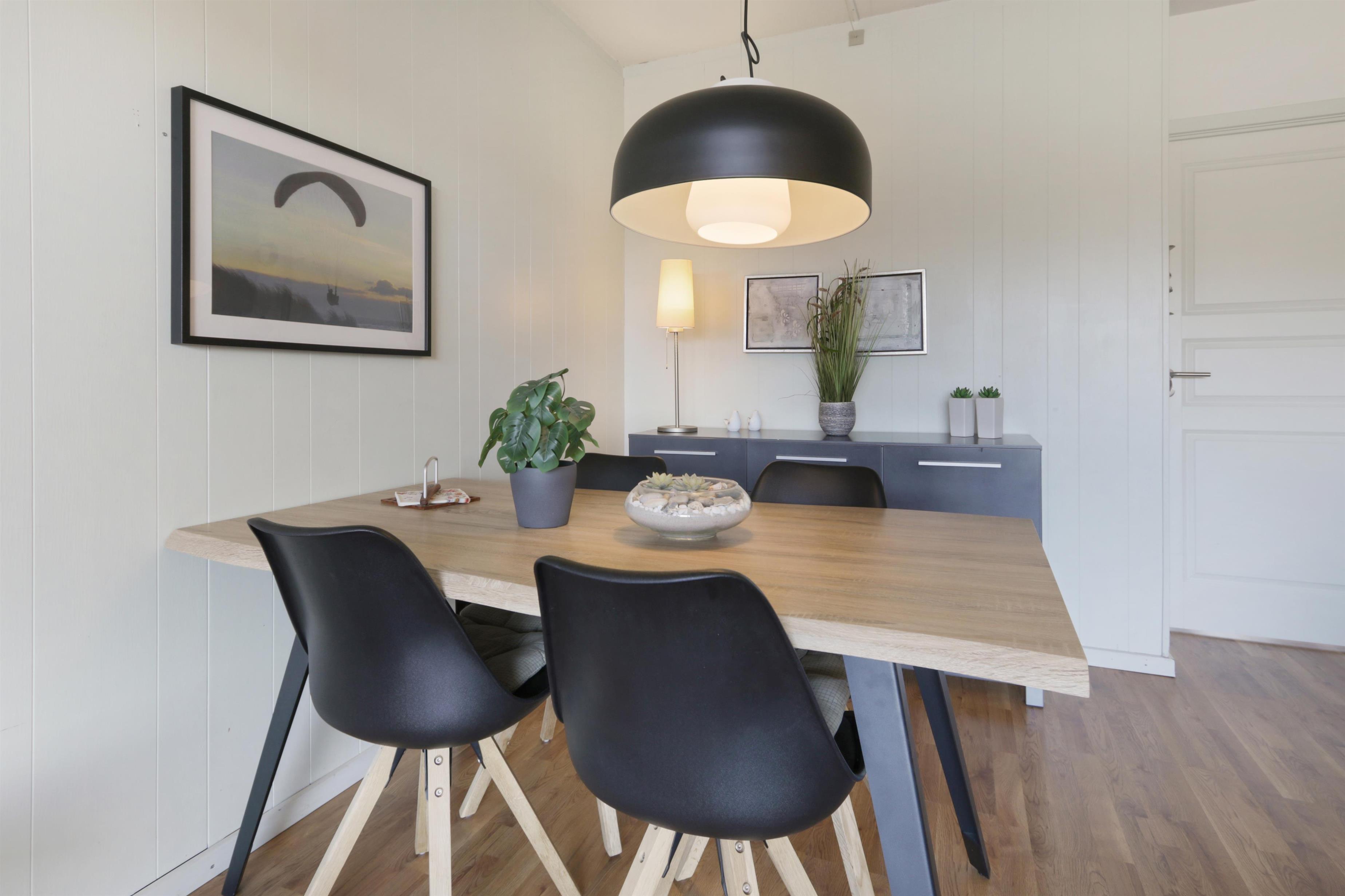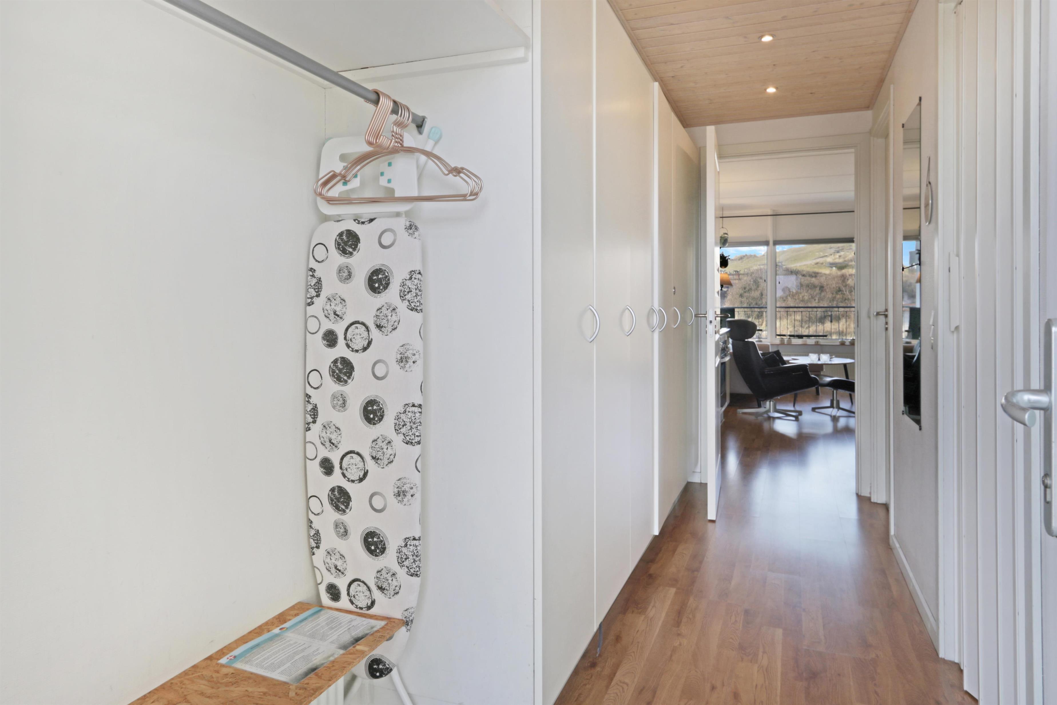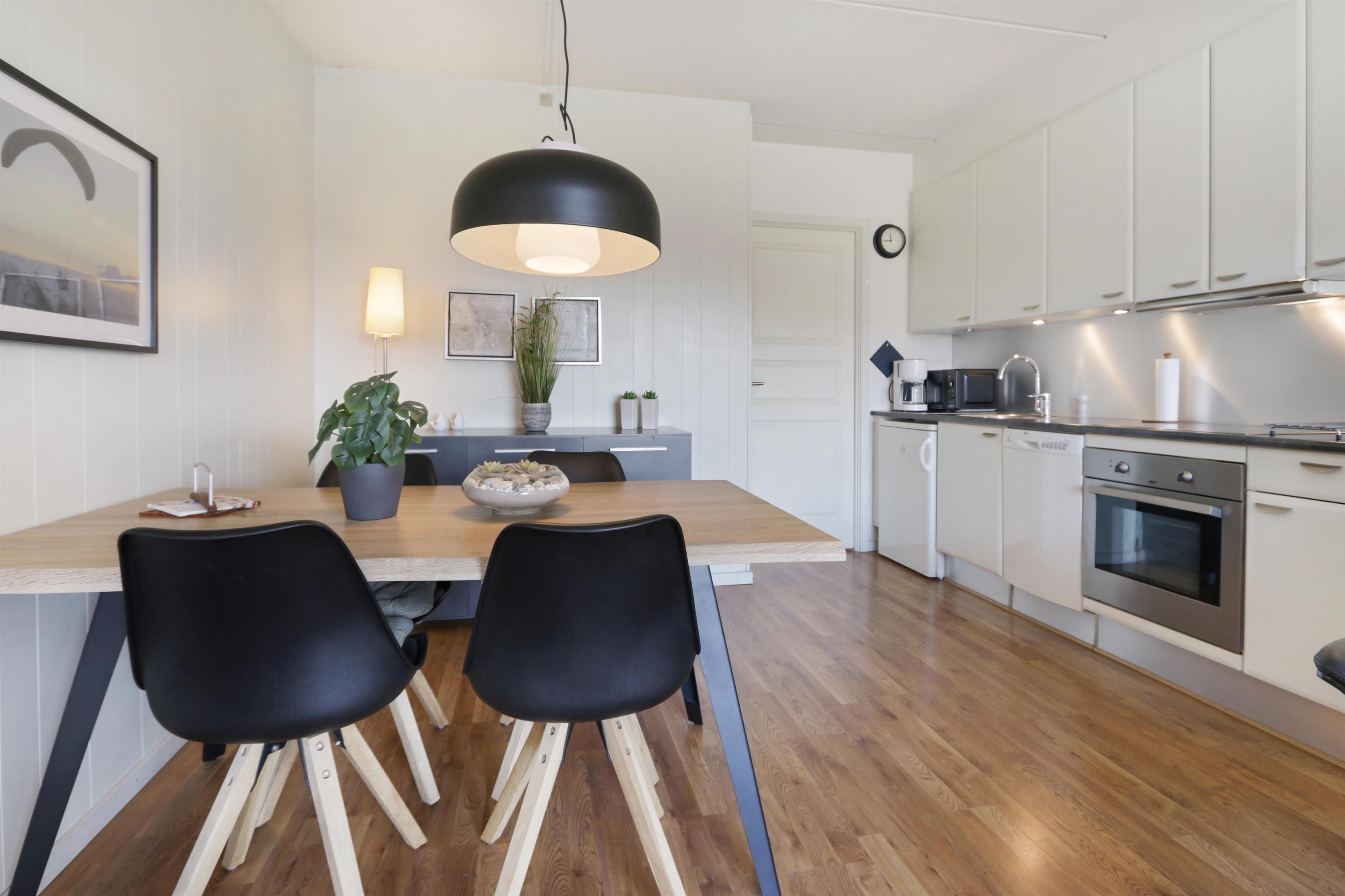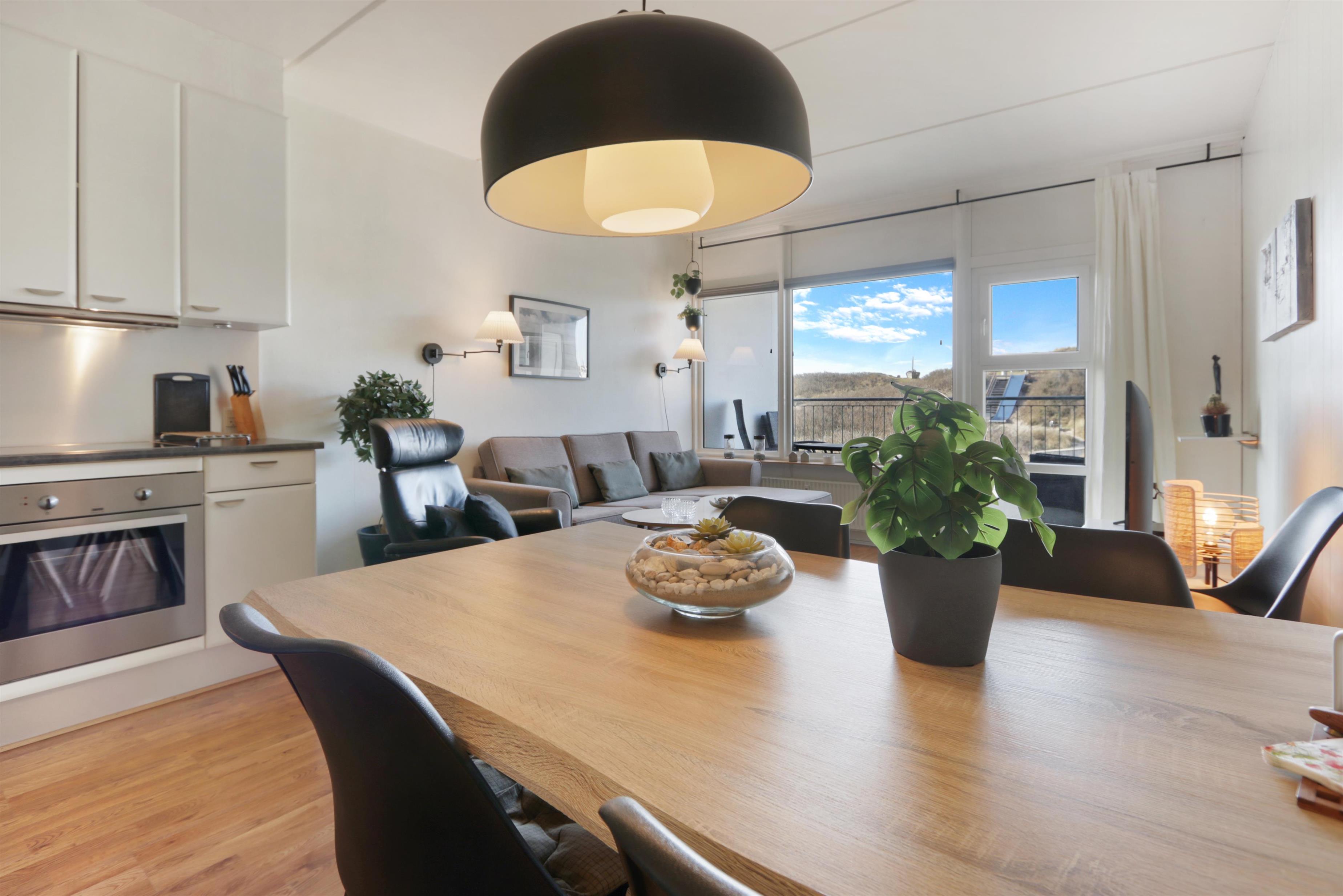 Meget pæn og moderne indrettet ferielejlighed beliggende på 1. sal. Kombineret stue og køkken. Stuen er indrettet med læder og polstermøbler, Kabel-TV, DVD og pergogulv. Køkkenet er med glaskeramisk komfur, køleskab med 10 l frostboks, mikroovn, opvaskemaskine, emhætte og pergogulv. 1 soverum: 1DS og pergogulv. Badeværelse med toilet, håndvask og bruser. Fra stuen er der udgang til overdækket balkon med havemøbler. Trappen til 1. sal består af 24 trappetrin.