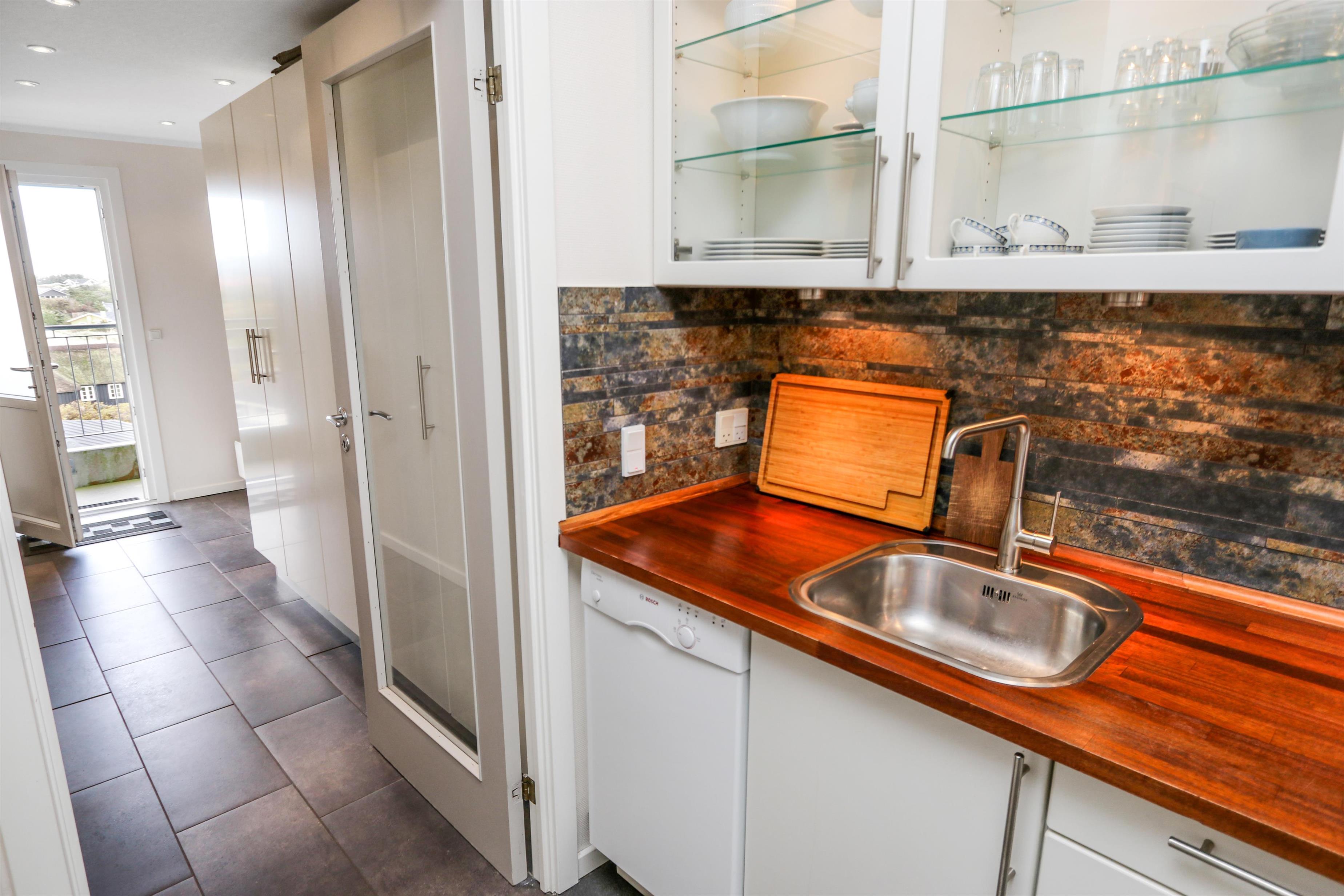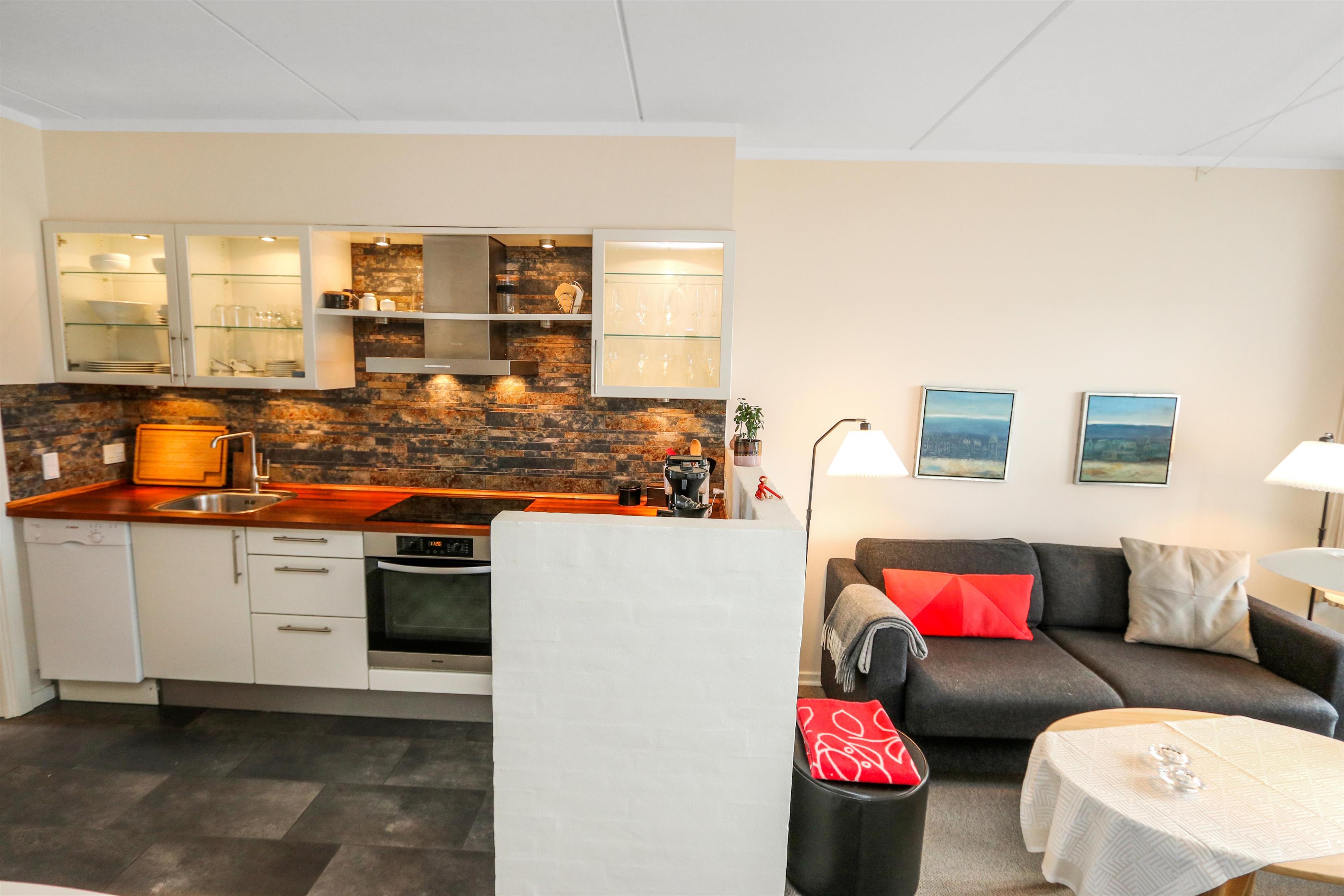 Ferielejlighed beliggende på 1. sal til 2 personer. Kombineret køkken og stue. Flot nyt køkken som er indrettet med glaskeramisk komfur, køleskab, opvaskemaskine, emhætte og klinkegulv. Stuen er indrettet med polster og lædermøbler, kabel-tv, radio, gulvtæppe. 1 soverum: 2S og gulvtæppe. Badeværelse er med toilet, håndvask og bruser. Fra stuen er der udgang til overdækket balkon med havemøbler. Trappen til 1. sal består af 40 trappetrin.