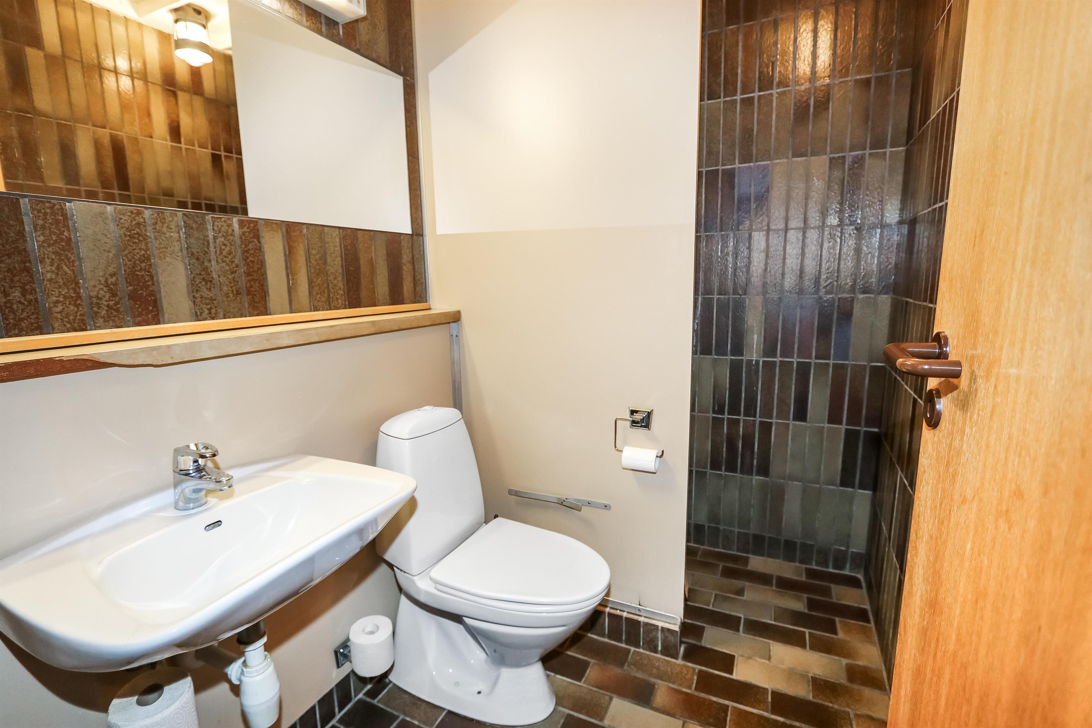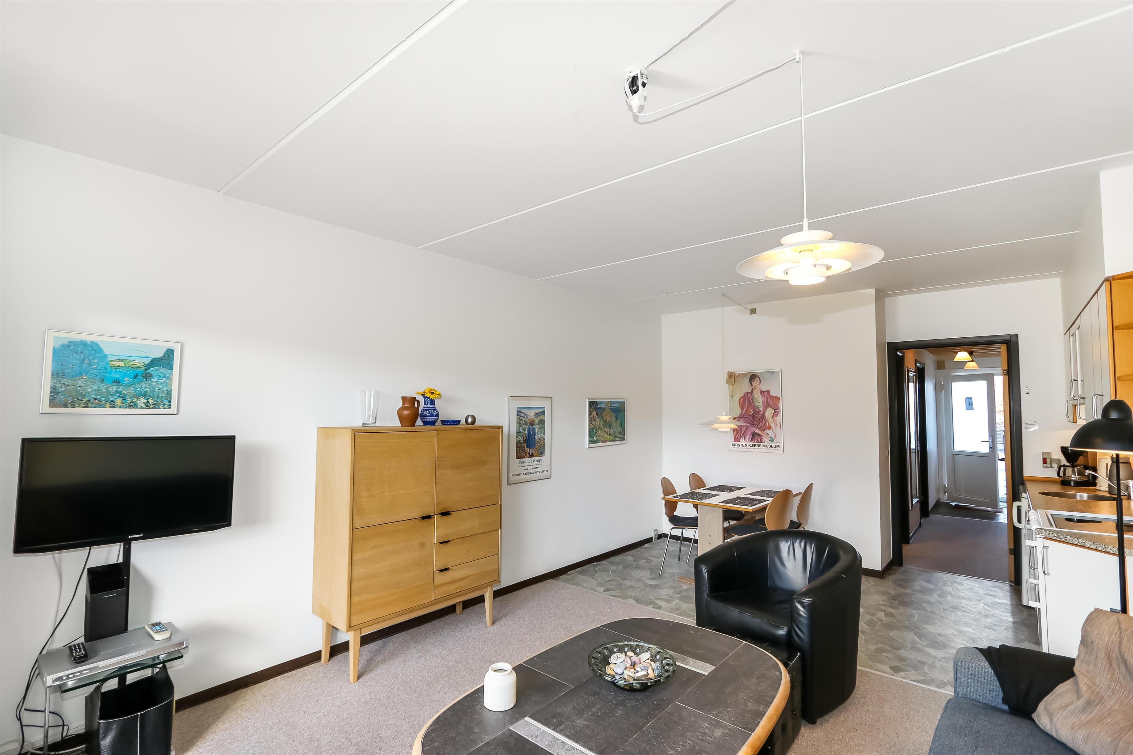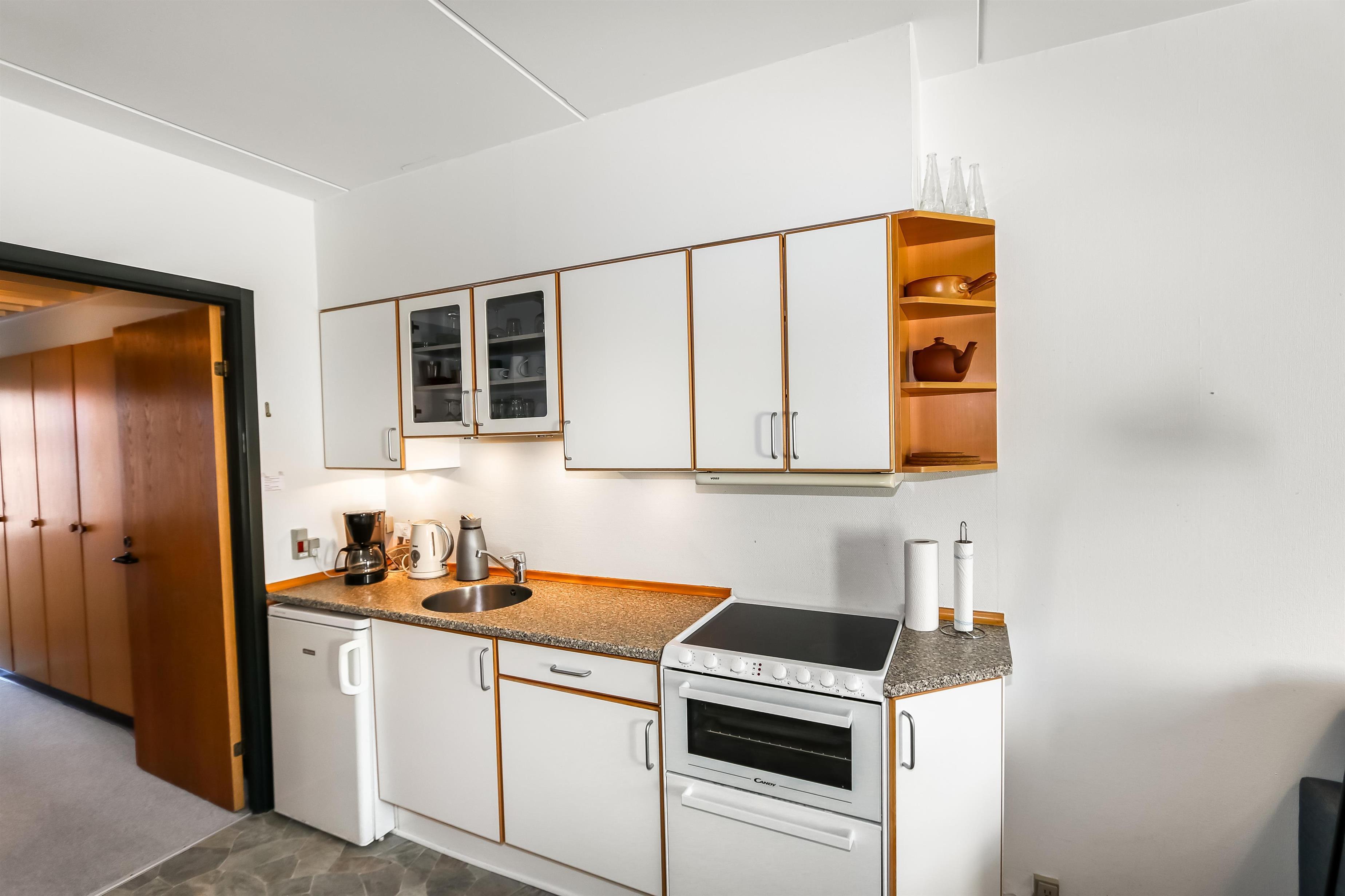 Enkel indrettet ferielejlighed til 4 personer. Køkken og stue er kombineret og der er laminat i køkkenafdelingen og tæppe i stuen. Stuen er indrettet med læder og polstermøbler og 1 sovesofa med plads til 2 personer, kabel-tv, radio og internet. Badeværelse med toilet, håndvask, bruser samt klinkegulv. Køkkenet er indrettet med kombineret komfur og opvaskemaskine, køleskab med lille frostboks, emhætte. 1 soverum: 1DS + 1S. Fra stuen er der udgang til lille delvis overdækket terrasse med havemøbler.