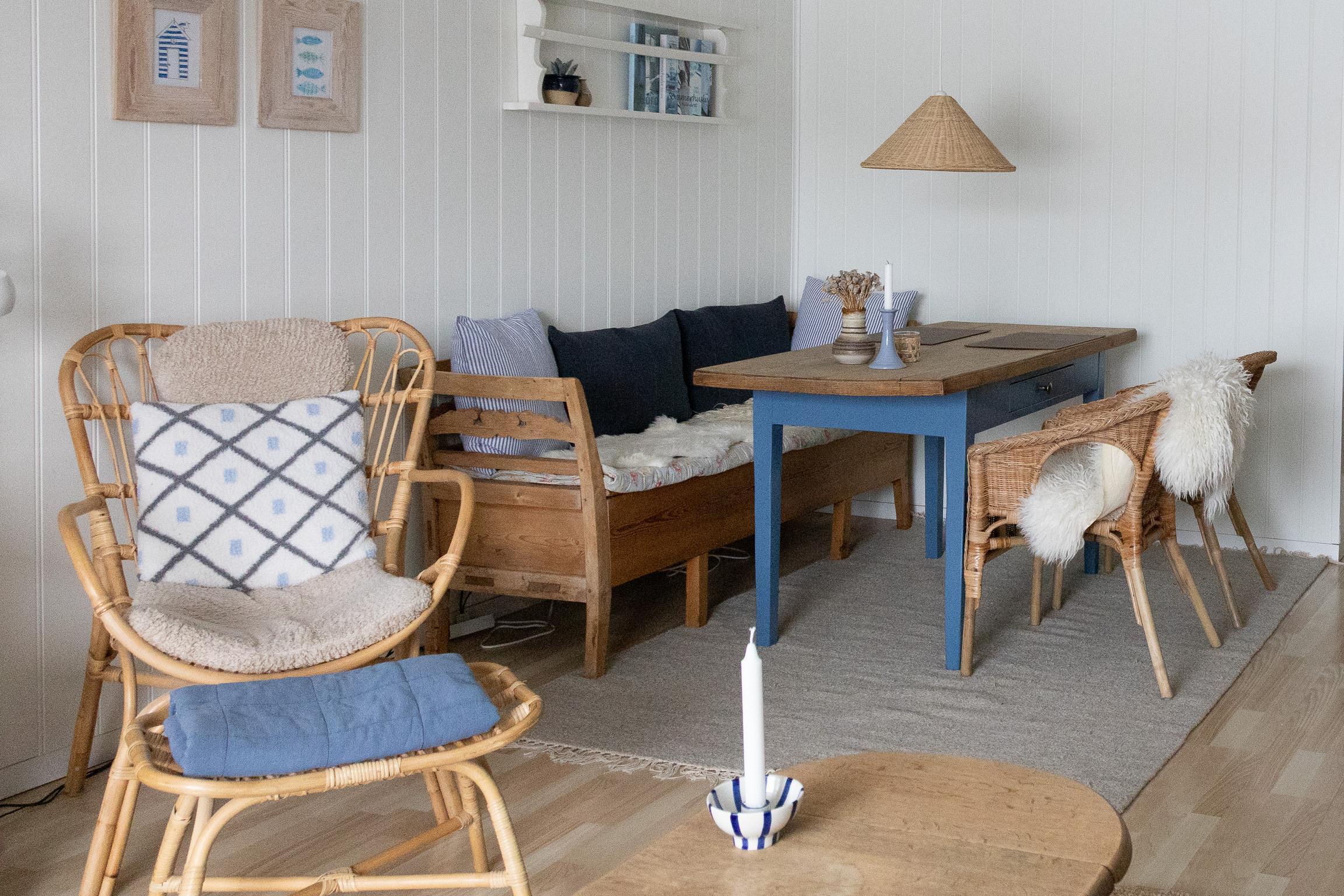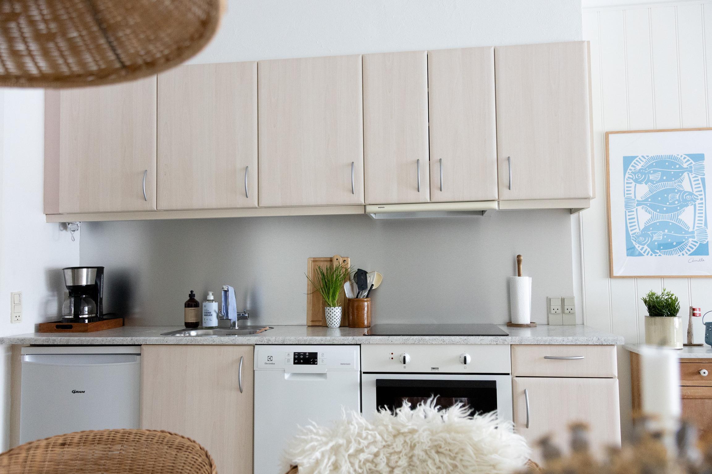 Køkken og stue ligger i åben forbindelse og danner rammen om feriens fælles stunder. Køkkenet er funktionelt indrettet med glaskeramisk komfur, emhætte, køleskab med fryseboks og opvaskemaskine. Spisepladsen ligger i forlængelse af køkkenet og indbyder til rolige morgenmåltider og afslappede aftener.