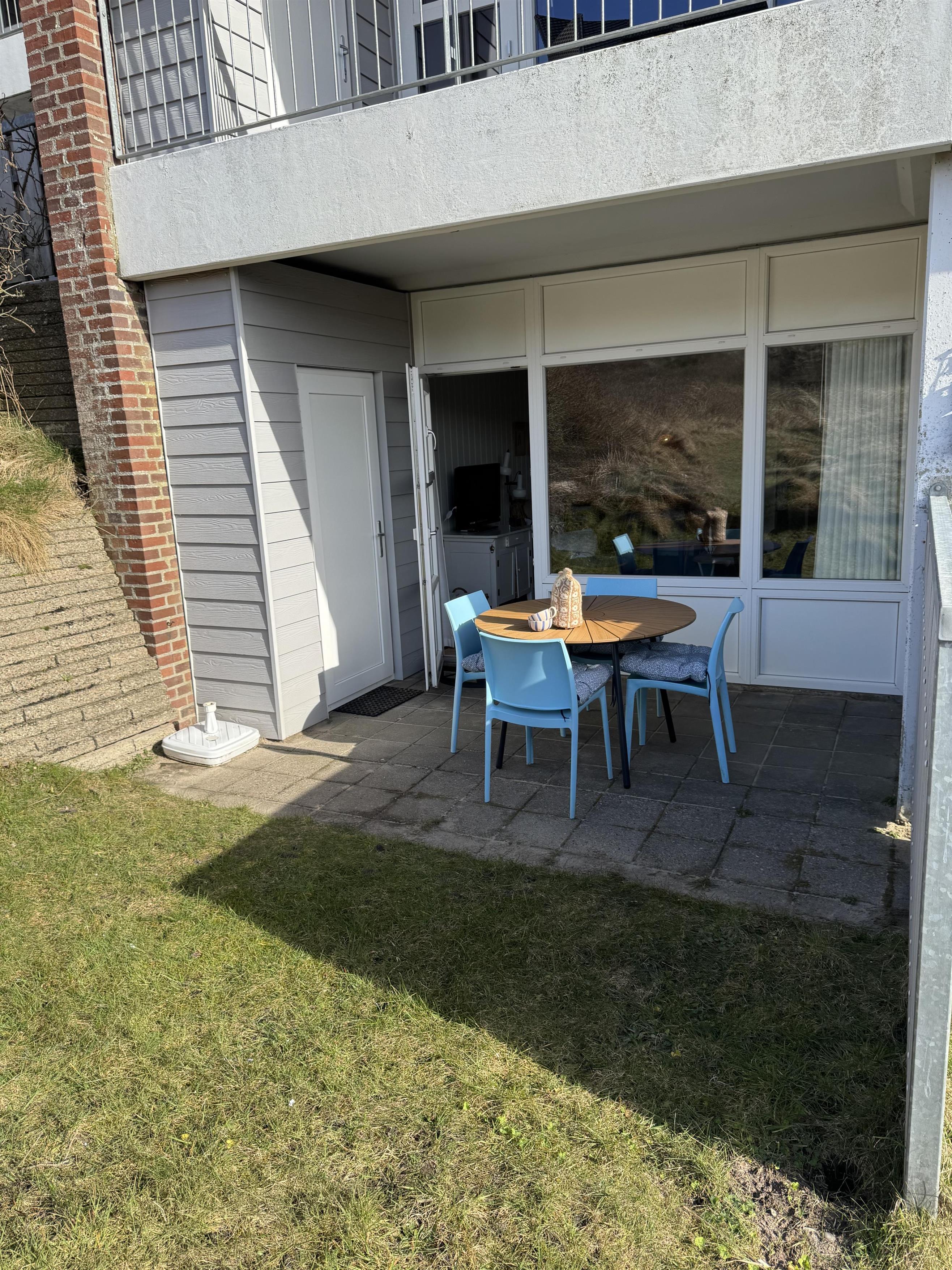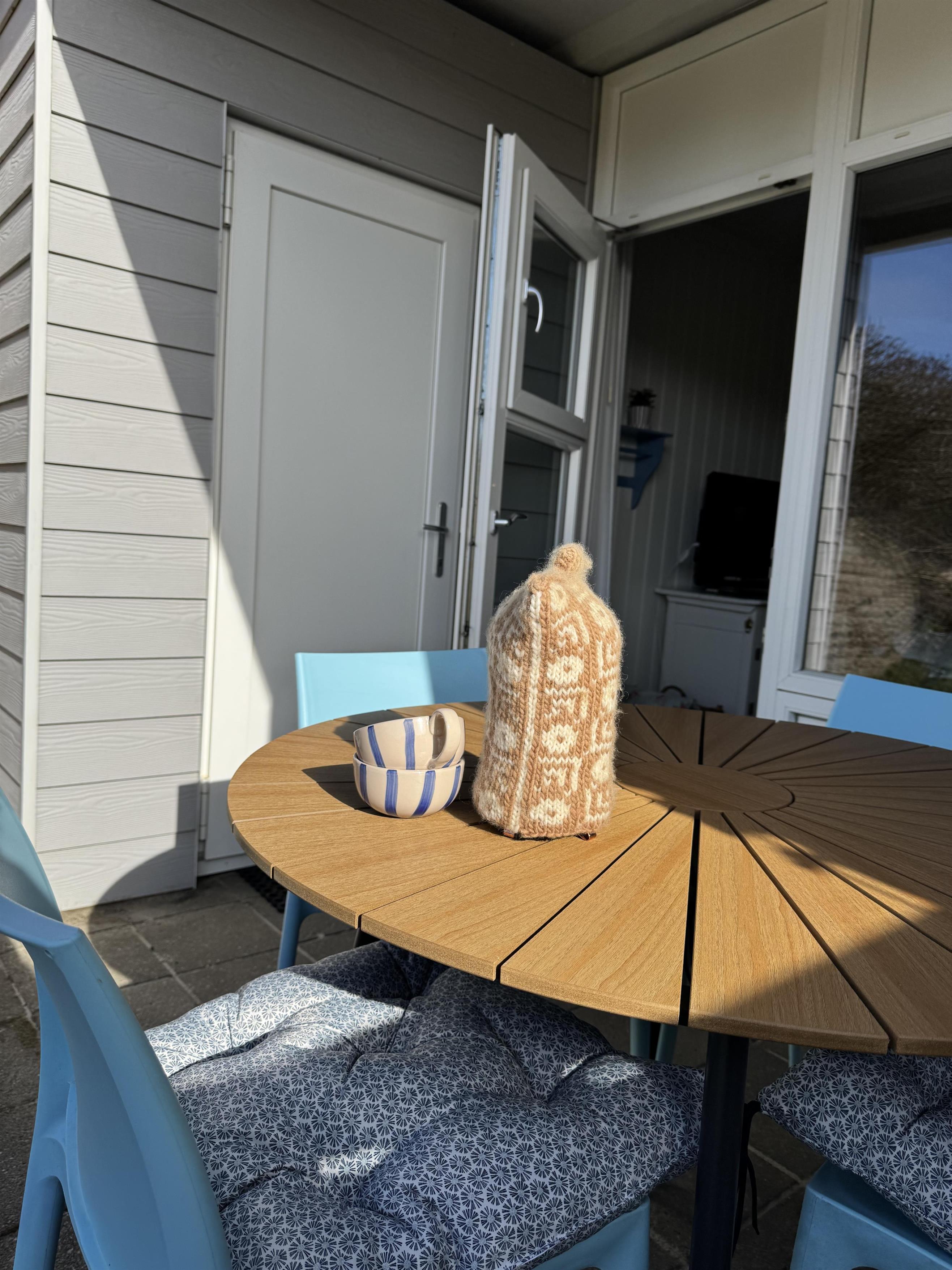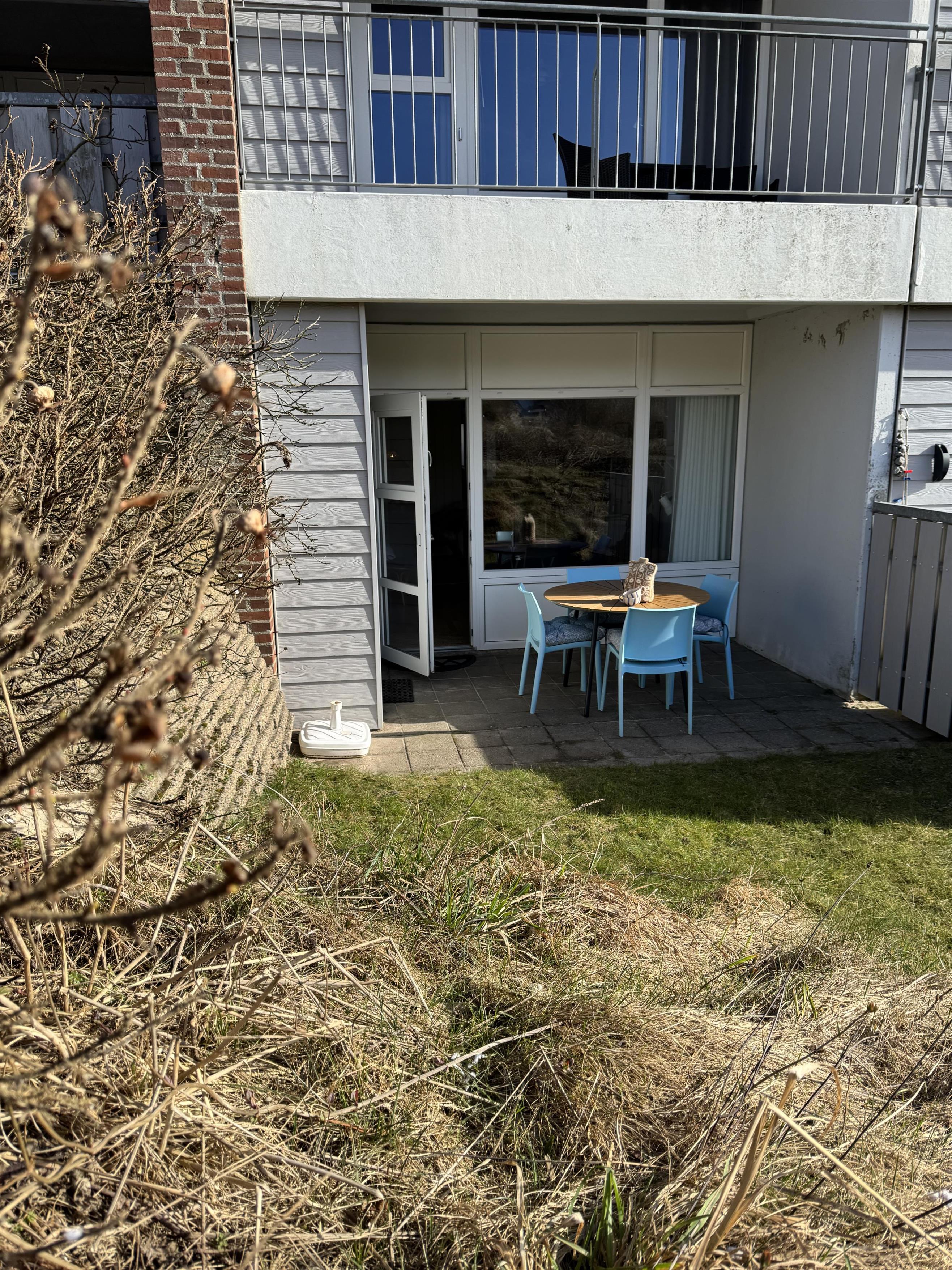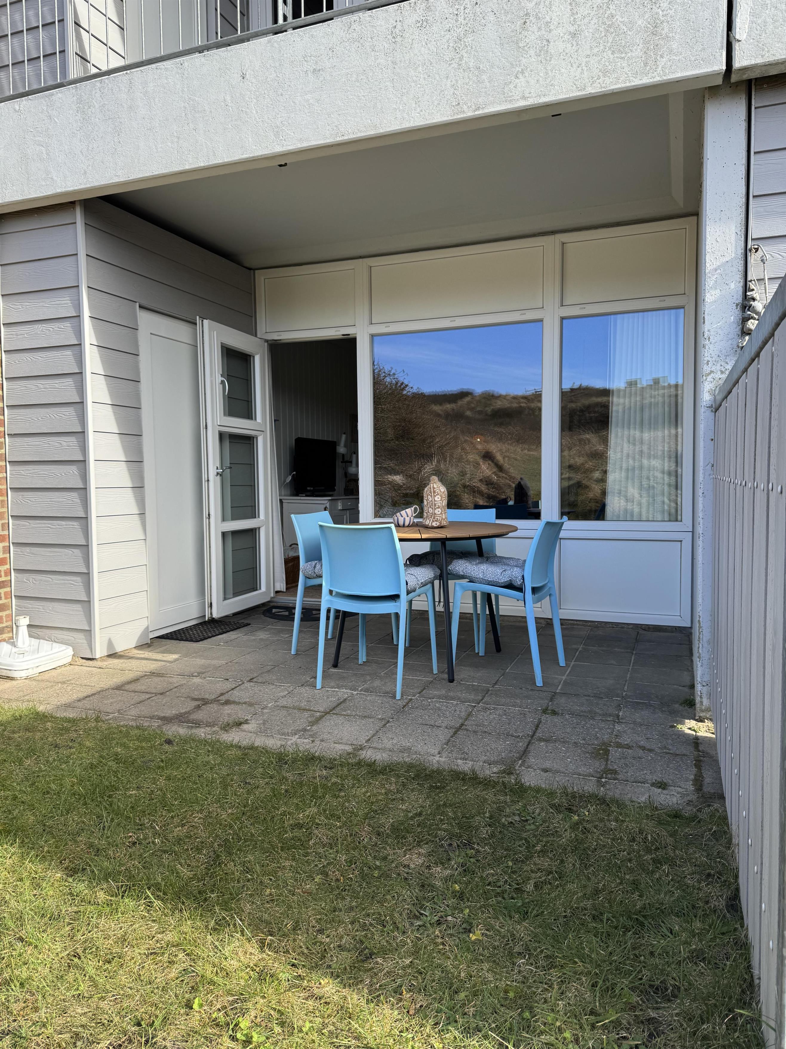 Fra lejligheden er der adgang til en lille, delvist overdækket terrasse med havemøbler – perfekt til morgenkaffen, en stille stund i solen eller et glas vin efter en dag ved Henne Strand.