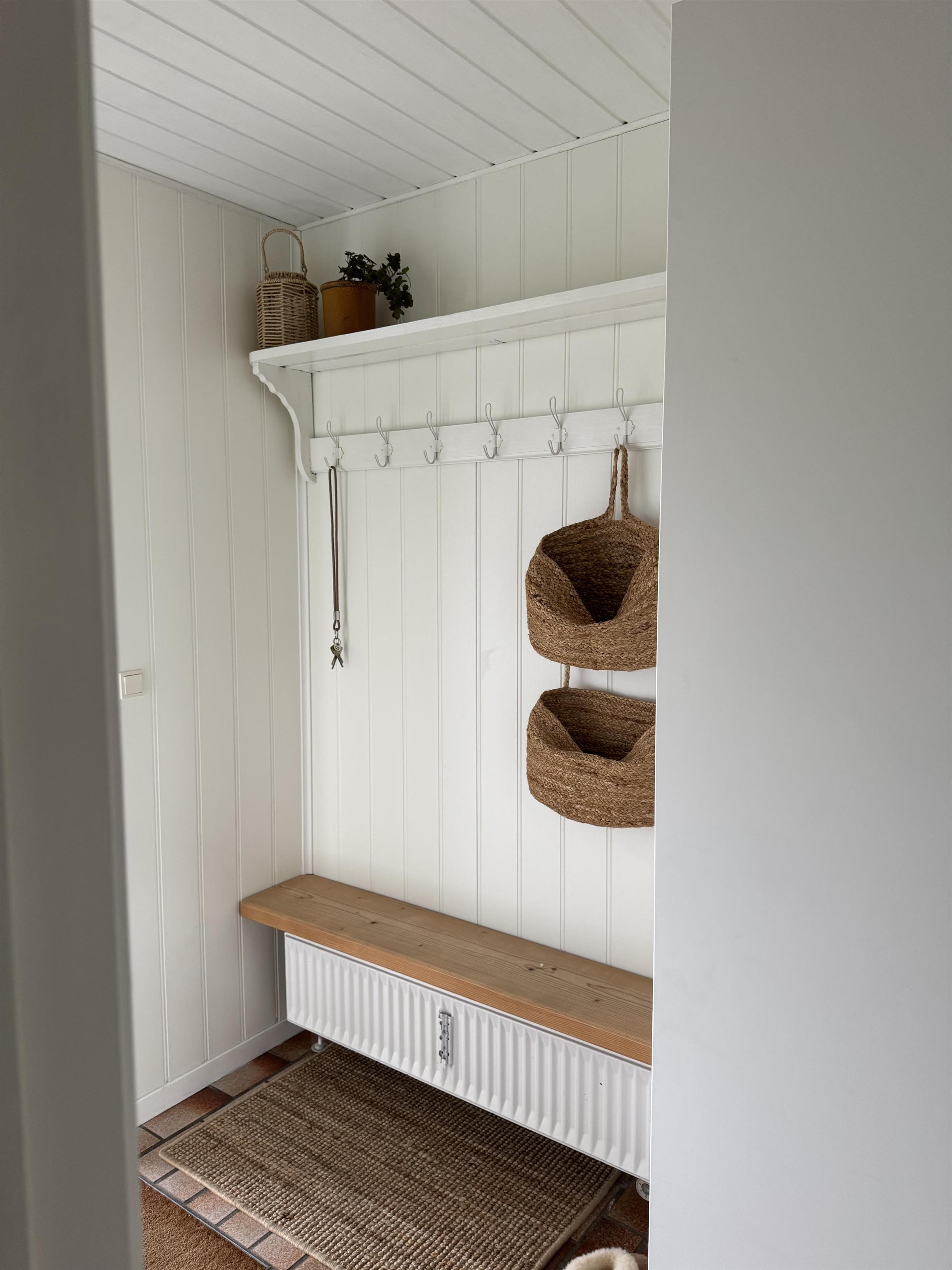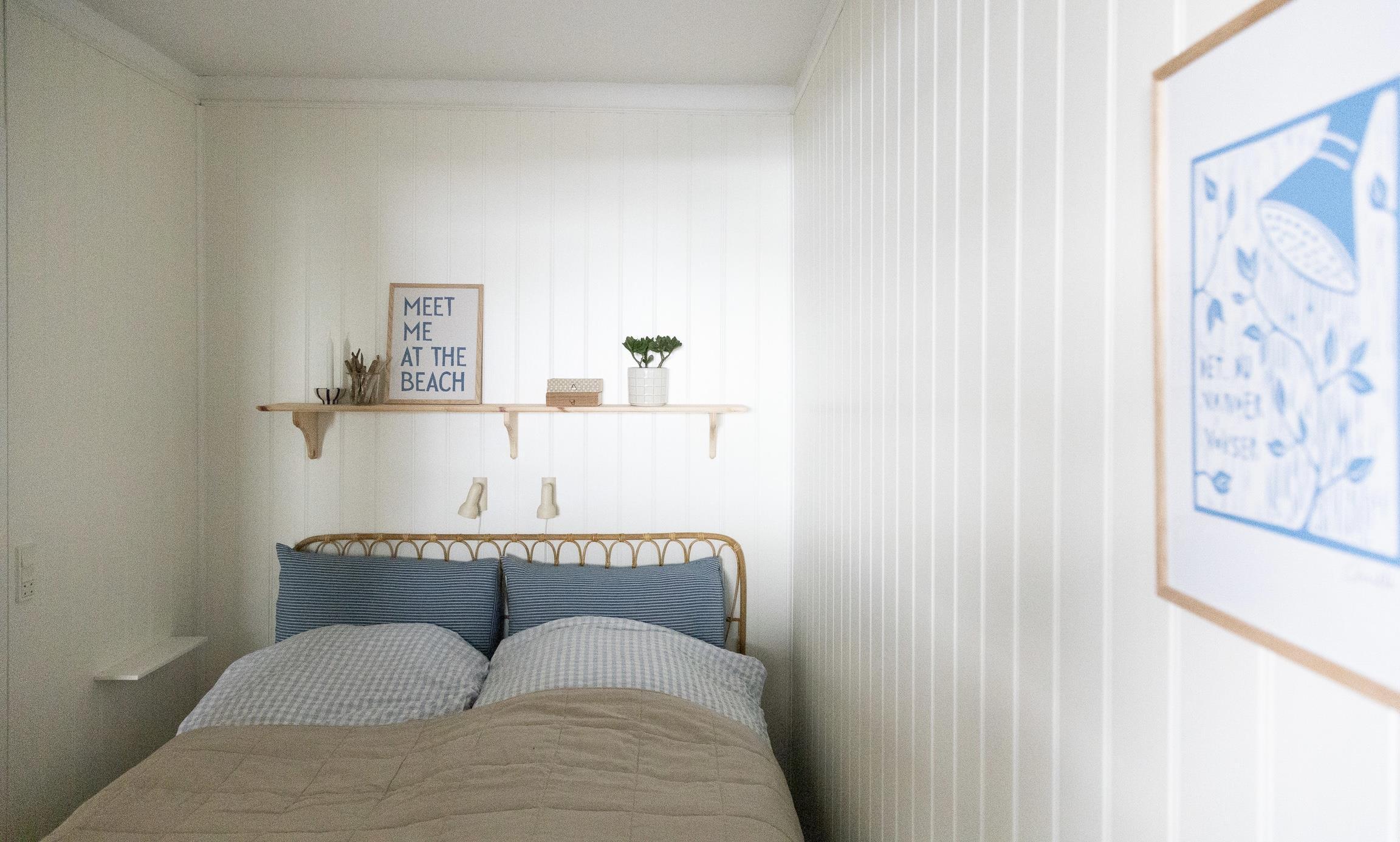 Soveværelset er indrettet i samme lyse og rolige stil med 160 cm bred seng, bløde tekstiler og hyggelige detaljer.