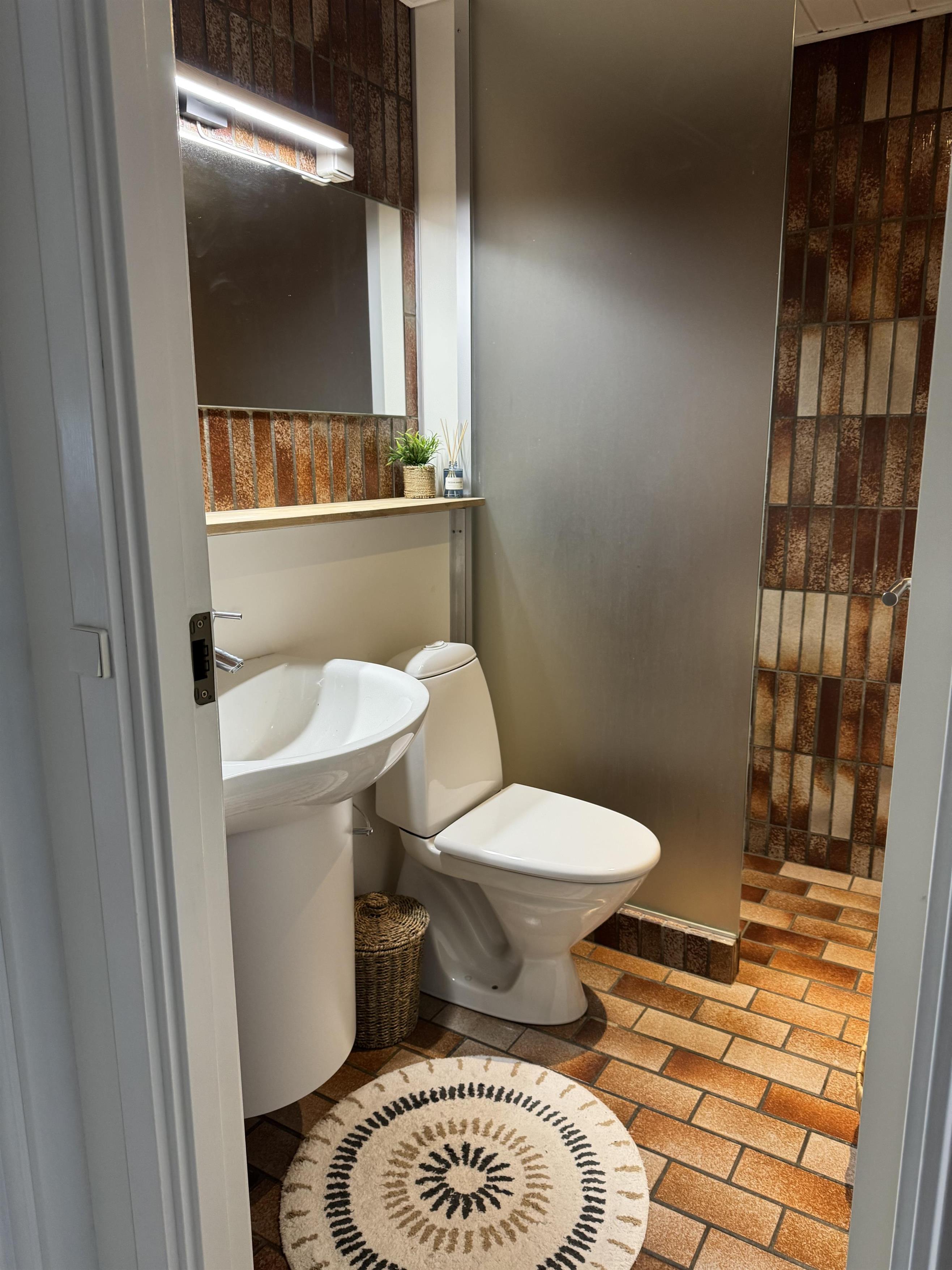 Badeværelset er pænt og funktionelt med bruser, toilet og håndvask.
