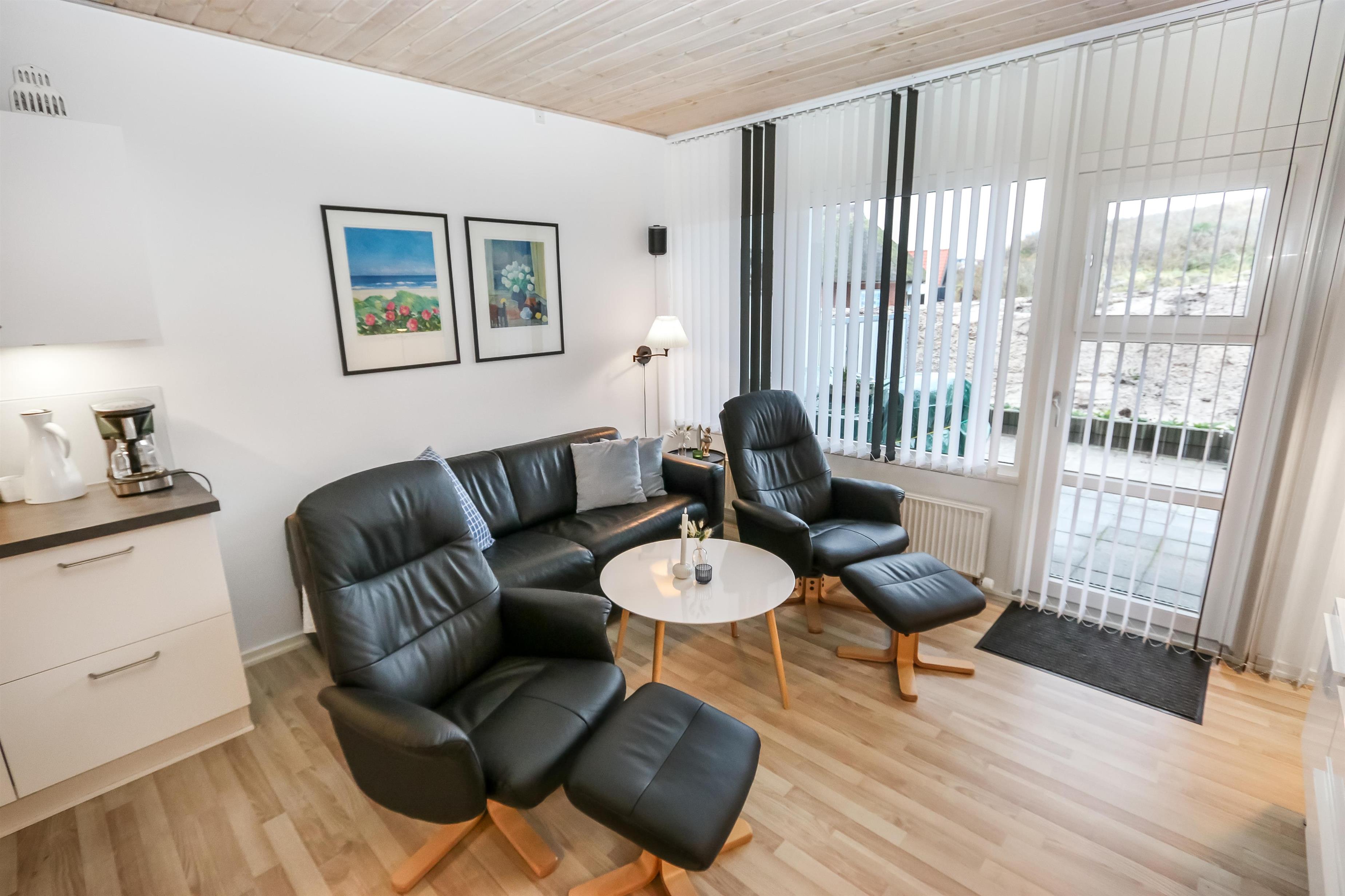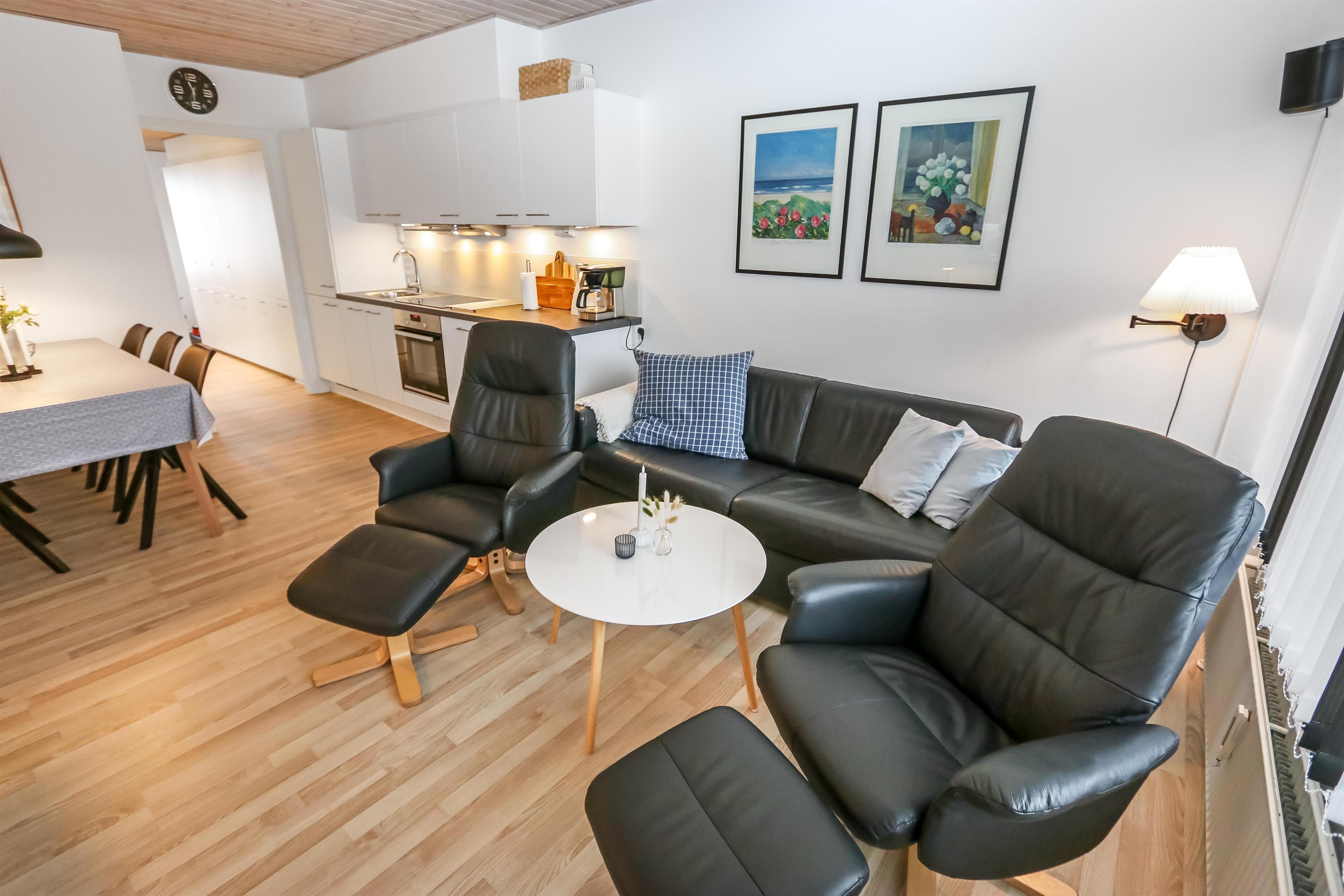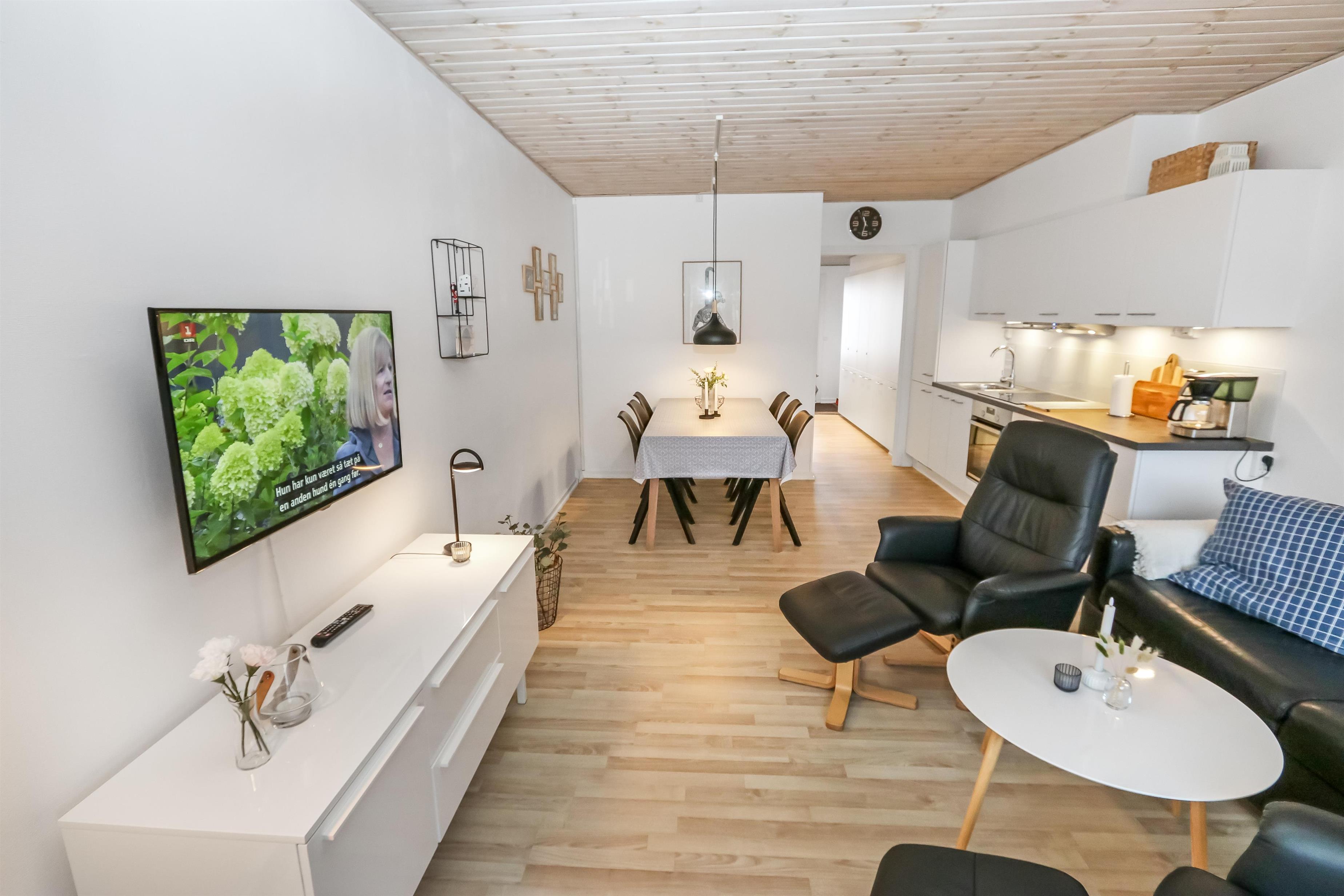 Flot renoveret ferielejlighed til 2 personer beliggende i stueplan. Kombineret stue og køkken med laminatgulv. Stuen er indrettet med gode lædermøbler, kabel-TV. Køkkenet er med el-keramisk kogeplade, indbygningsovn, emhætte, køleskab med 40 l fryseboks, opvaskemaskine. Badeværelse med toilet, håndvask og bruser. 1 soverum med 1DS + 1S ekstra TV og laminatgulv. Fra stuen er der udgang til lille delvis overdækket terrasse med havemøbler.