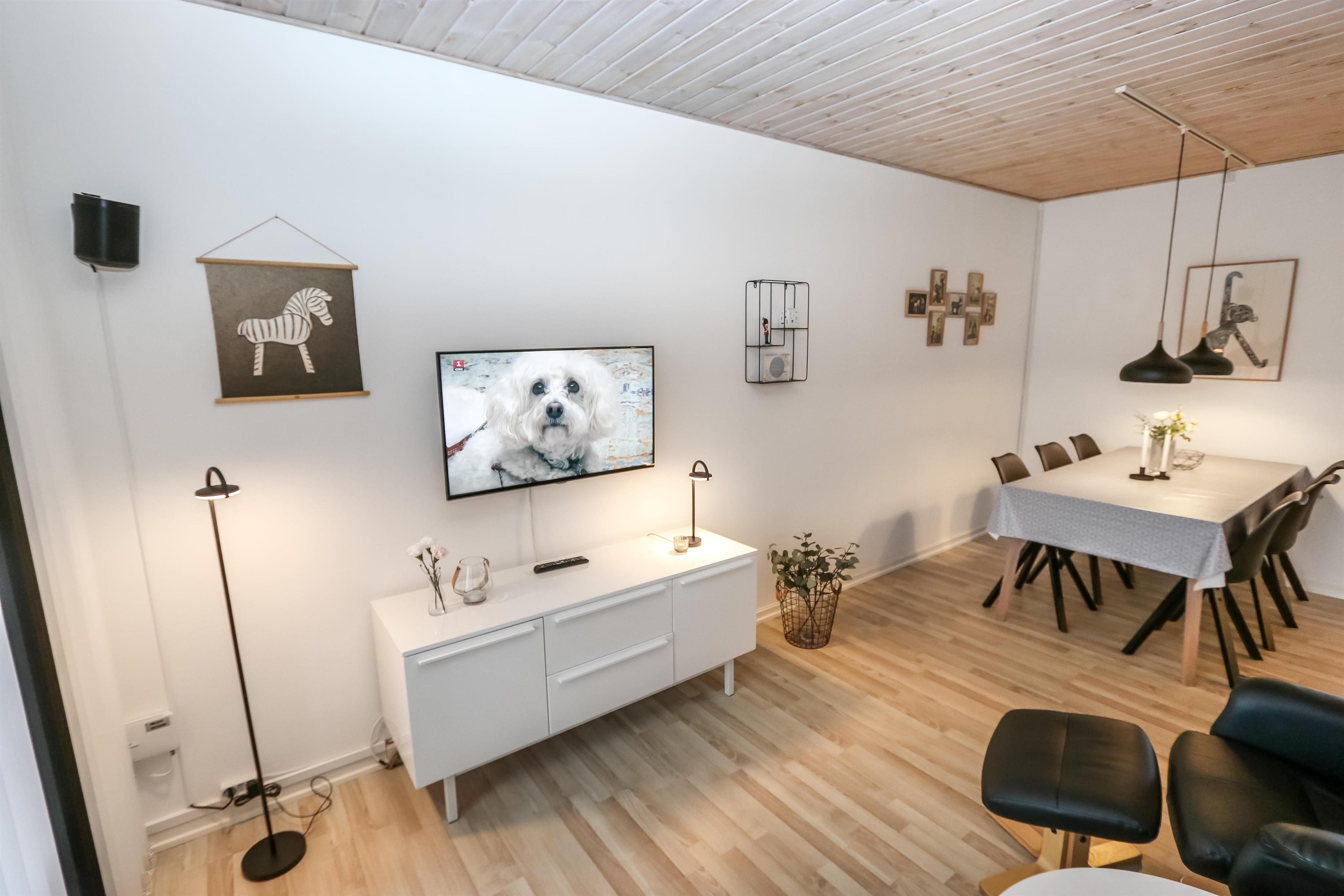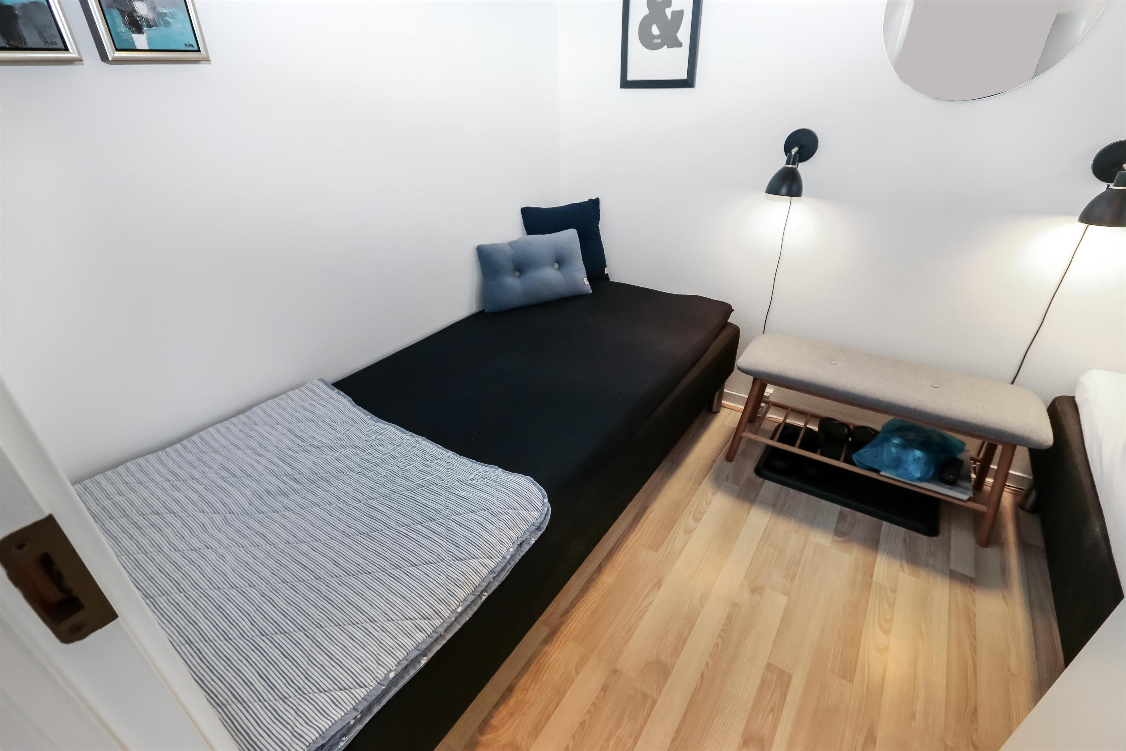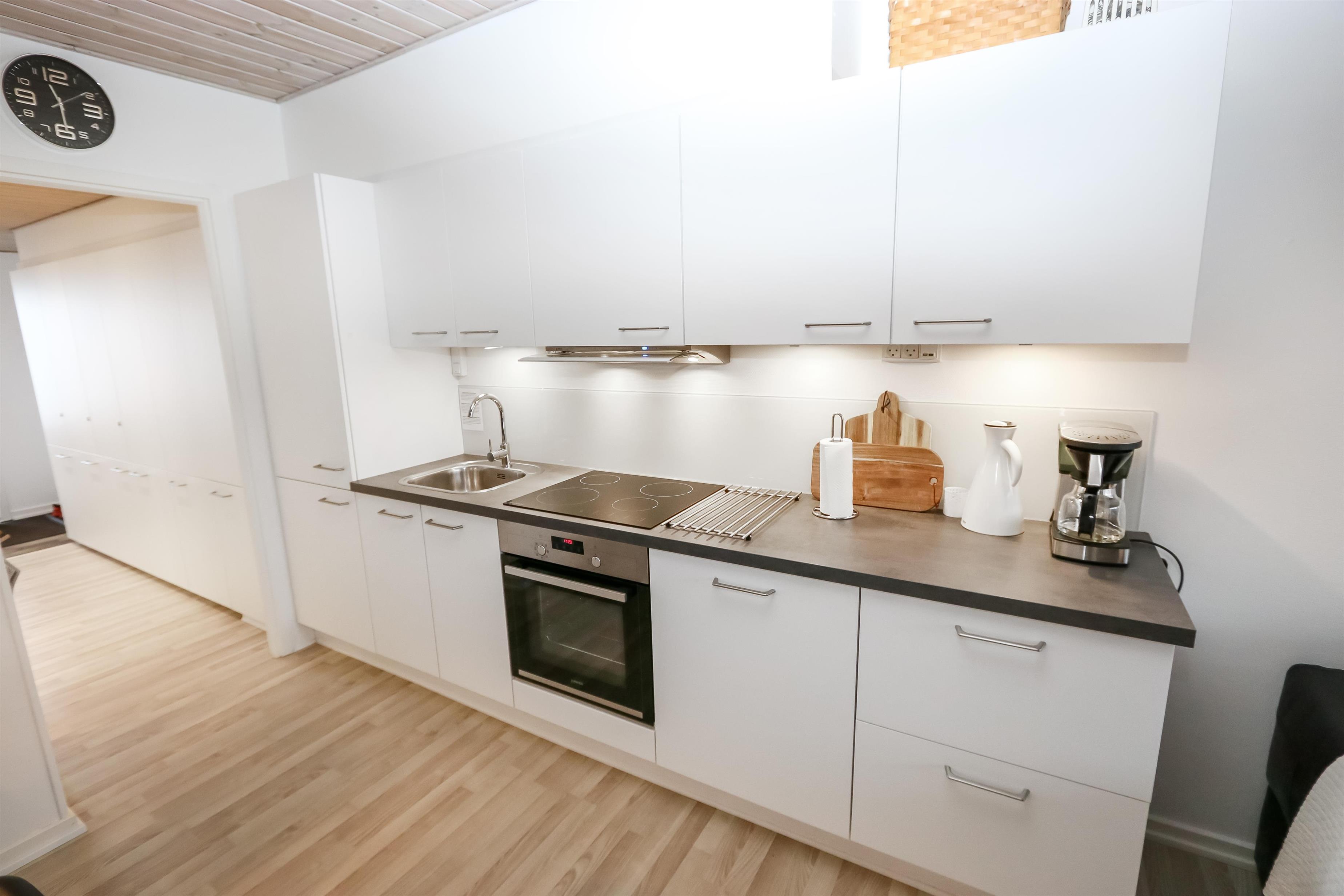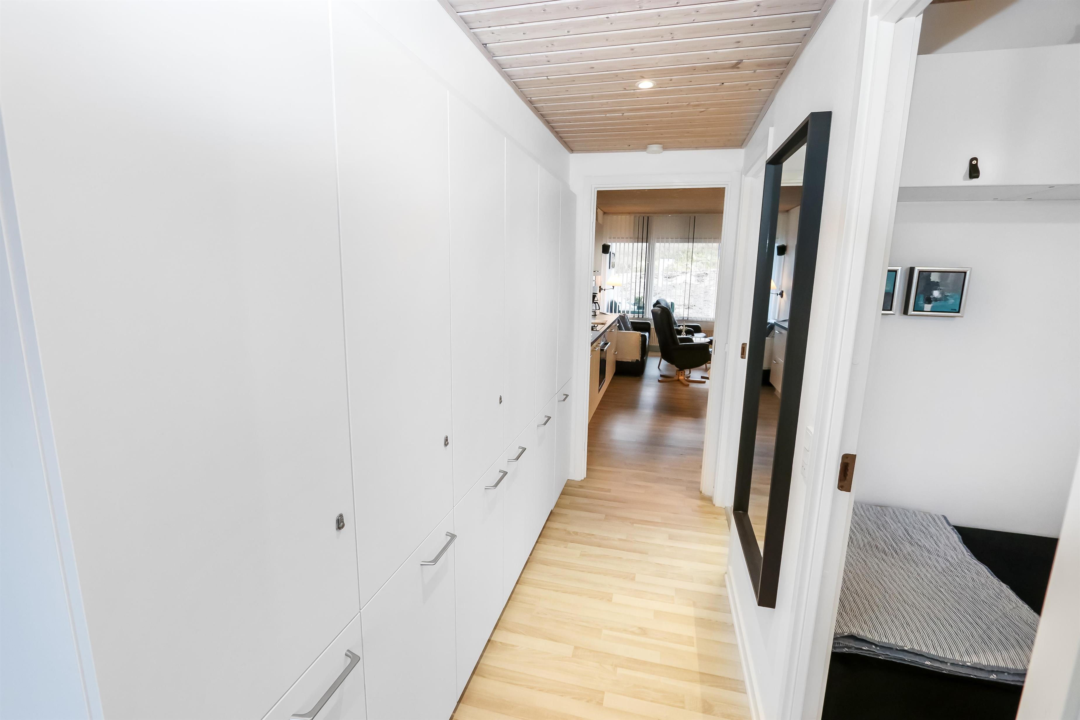 Flot renoveret ferielejlighed til 2 personer beliggende i stueplan. Kombineret stue og køkken med laminatgulv. Stuen er indrettet med gode lædermøbler, kabel-TV. Køkkenet er med el-keramisk kogeplade, indbygningsovn, emhætte, køleskab med 40 l fryseboks, opvaskemaskine. Badeværelse med toilet, håndvask og bruser. 1 soverum med 1DS + 1S ekstra TV og laminatgulv. Fra stuen er der udgang til lille delvis overdækket terrasse med havemøbler.