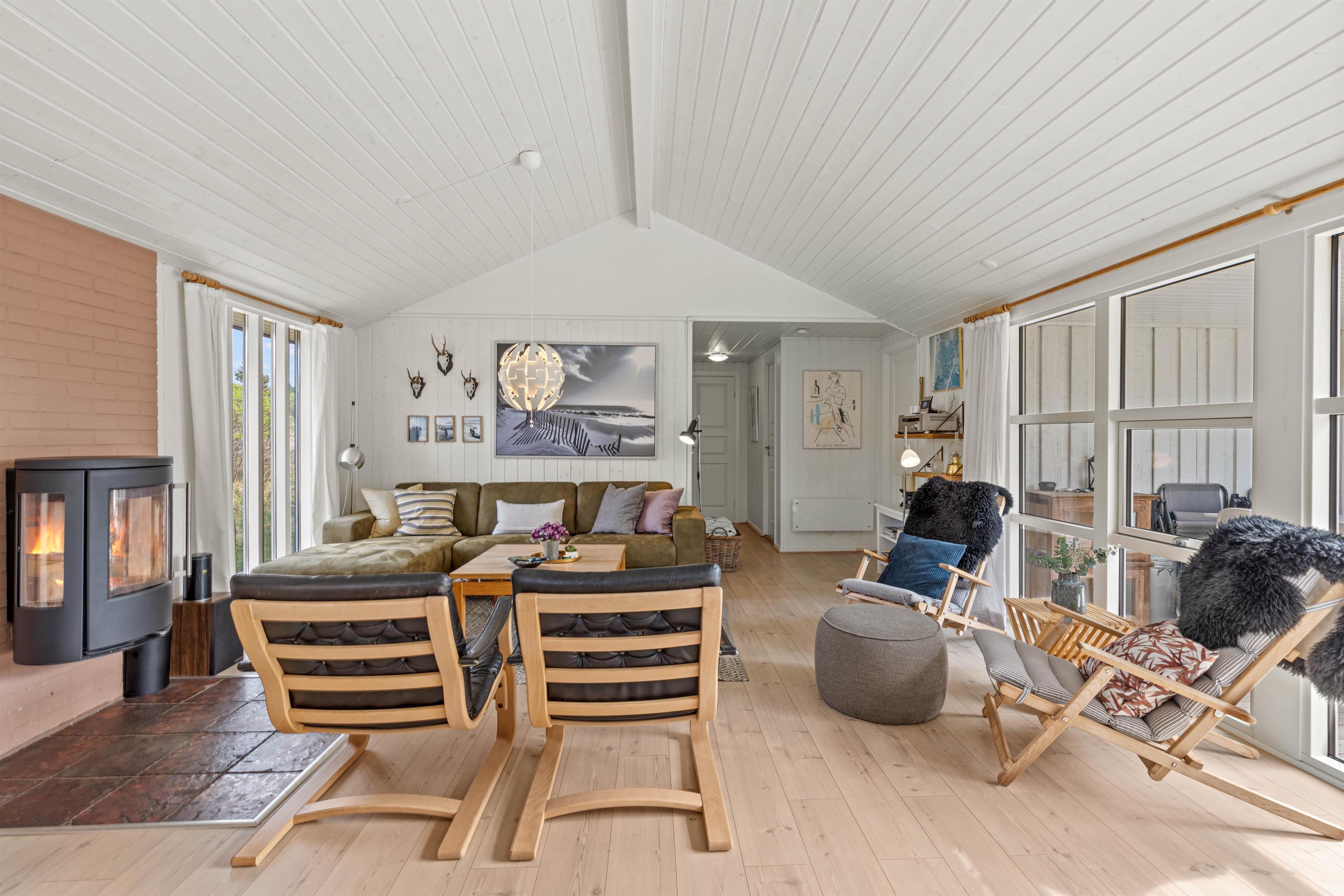 I dette feriehus på Hjelmevej 73 i Henne Strand vil I helt sikkert føle jer hurtigt tilpas. Feriehuset, der er blevet renoveret i 2019, fremstår indbydende, lyst og hyggeligt. Og især alrummet, der forener stuen, spiseplads og det veludstyrede køkken danner rammen for mange hyggelige feriestunder sammen, imens brændeovnen spreder varme i hele rummet. Foruden brændeovnen sørger den energivenlige varmepumpe for en behagelig temperatur i hele feriehuset.