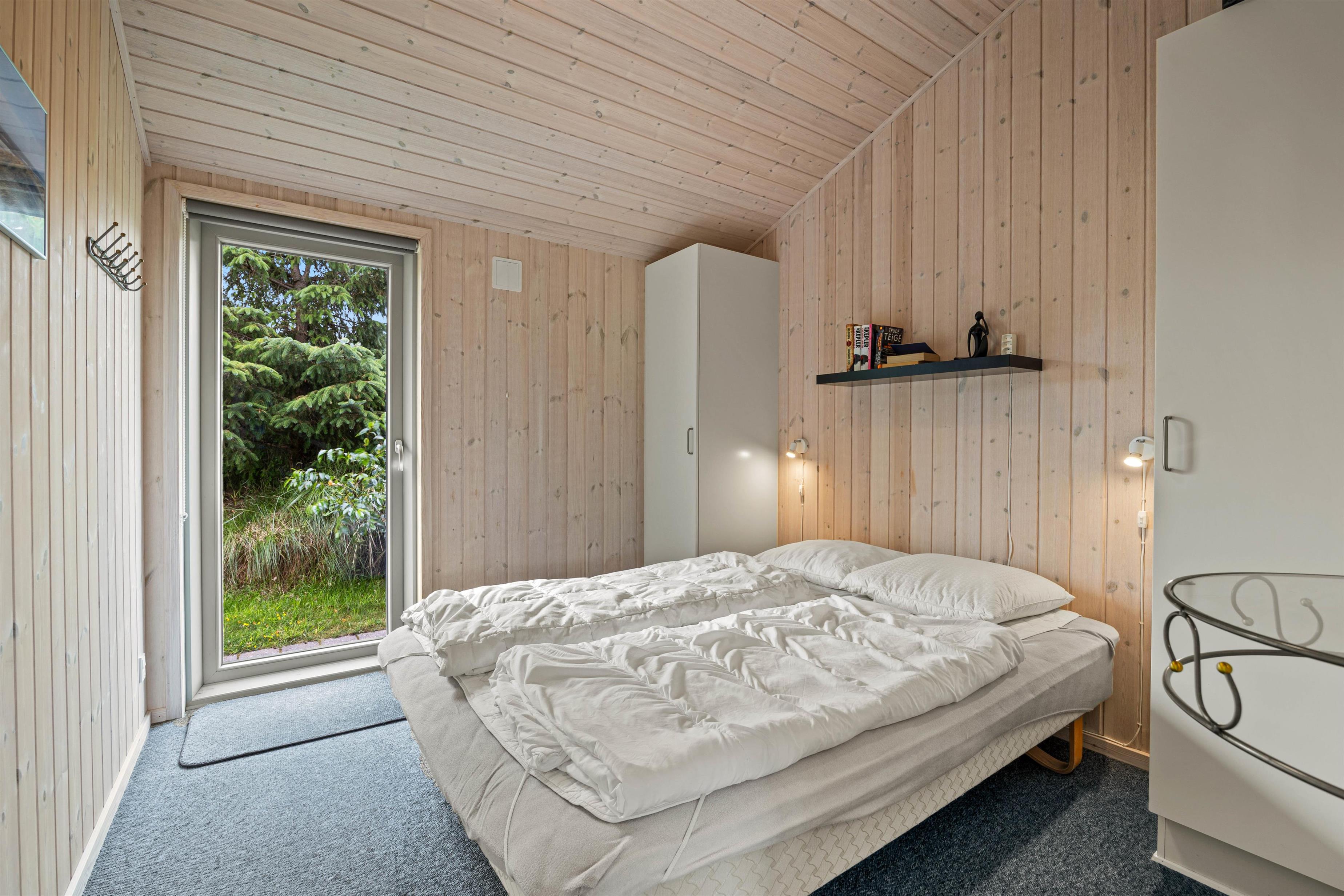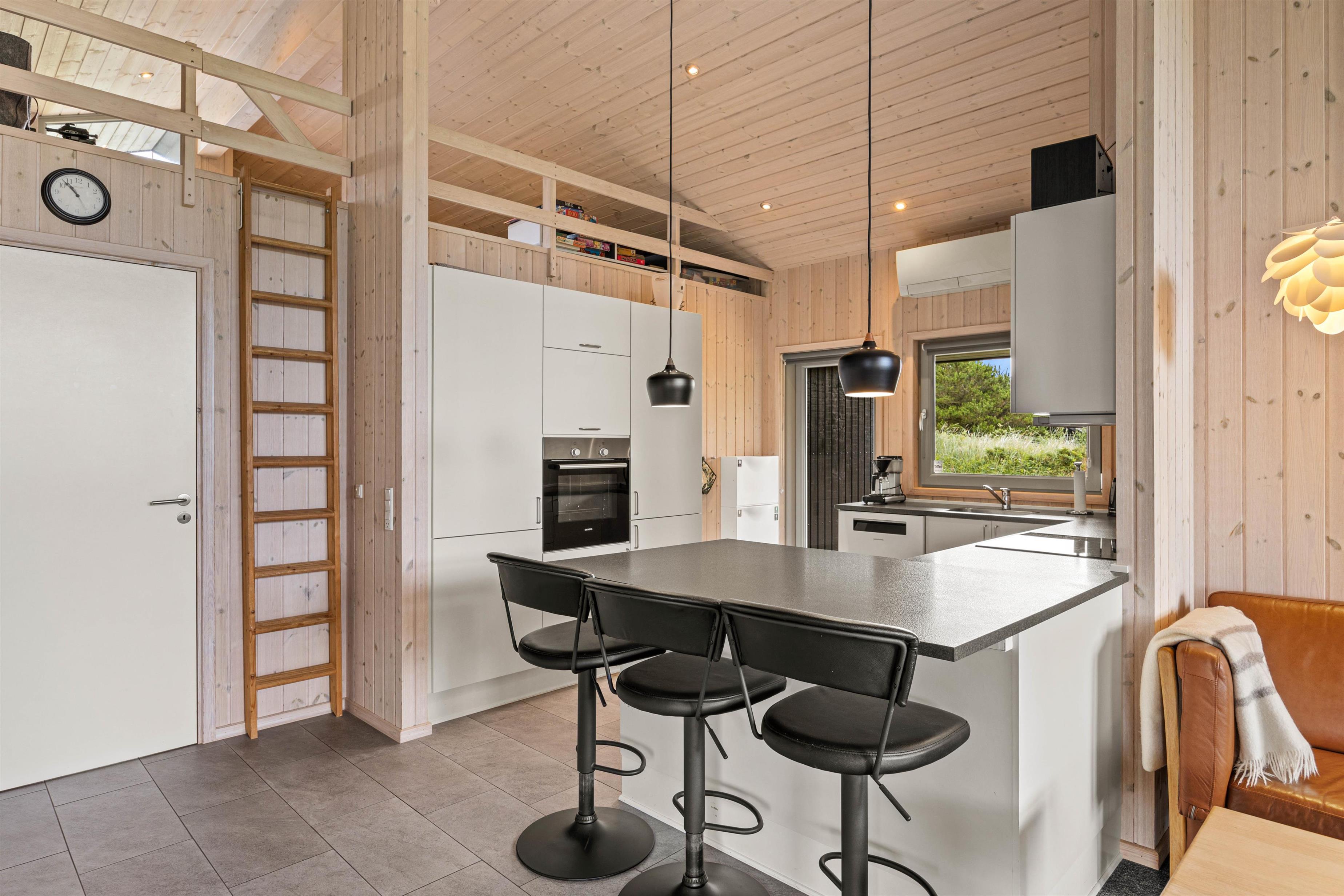 Sommerhuset har 2 badeværelser med gulvvarme, 4 soveværelser med dobbeltsenge og det store alrum, der forener køkken, stue og spisestue. I alrummet er der en brændeovn, der sætter prikken over i’et for feriestemningen. Fra alrummet kan I også kravle op på en hems, som børnene helt sikkert vil elske.
