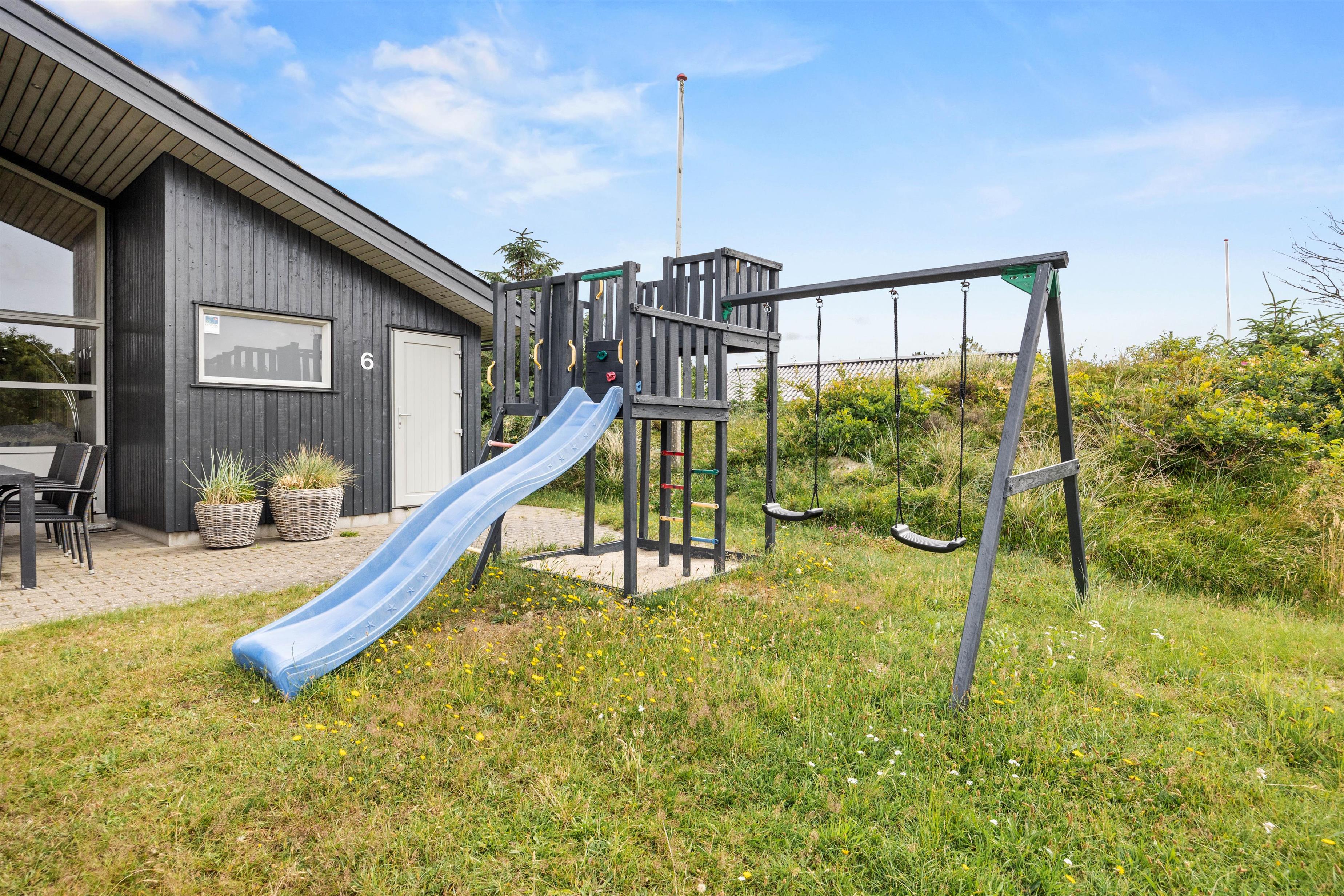 I haven er der tænkt på de mindste. Både et gyngestativ og en sandkasse står klar til dem, hvor de kan hygge sig og lege hele dagen. Om aftenen kan I samle familien på terrassen til en lækker middag på grillen som en dejlig afslutning på en skøn feriedag.