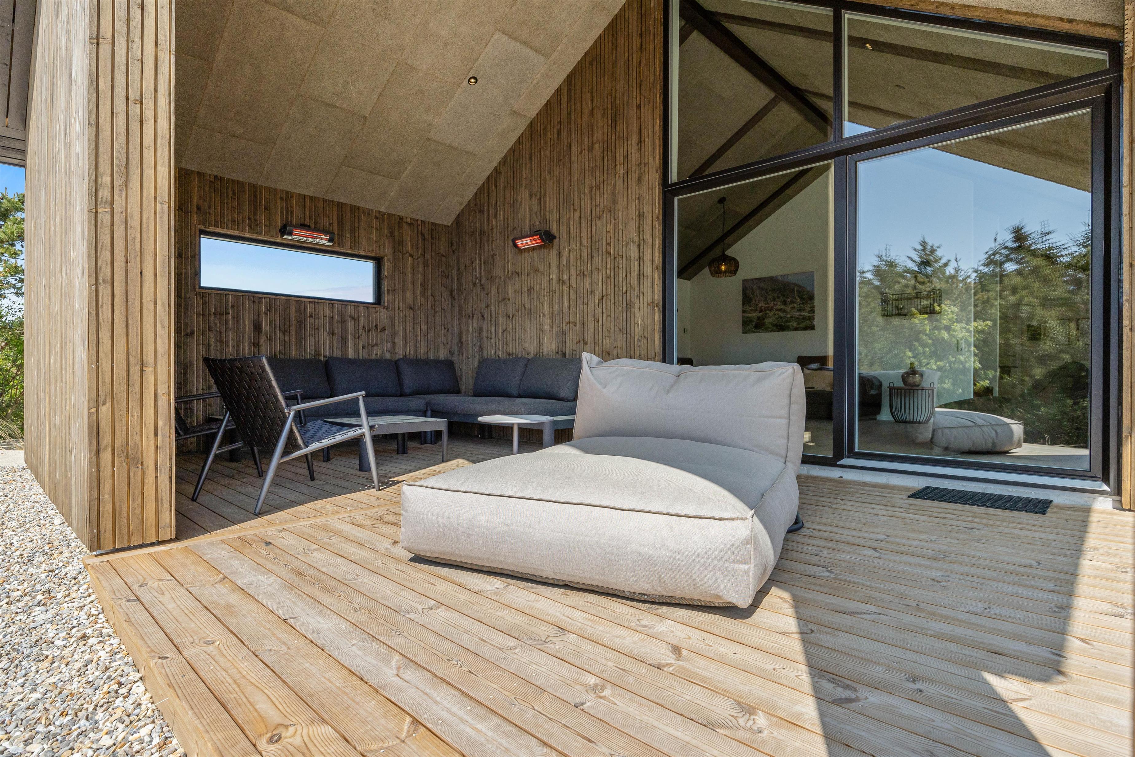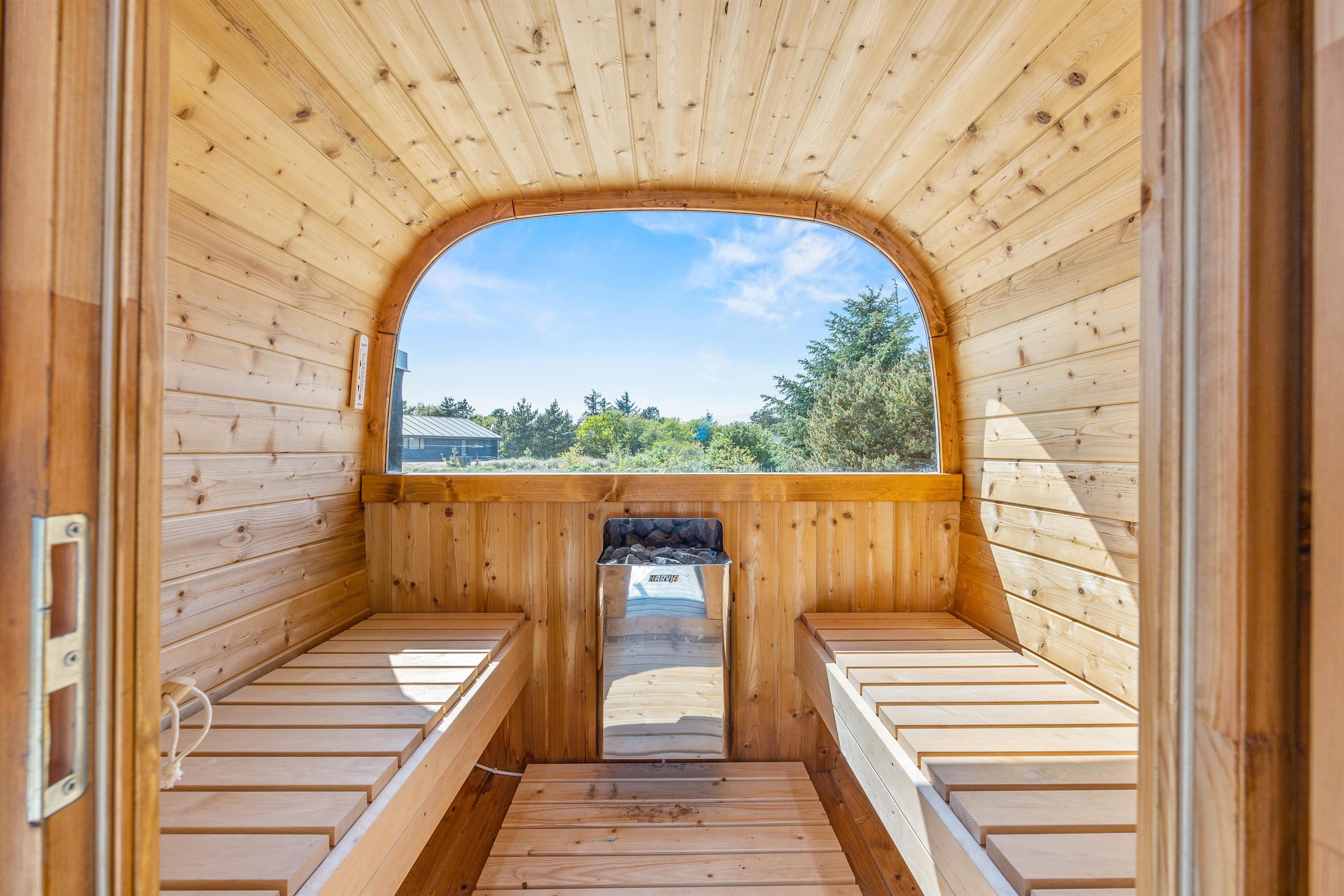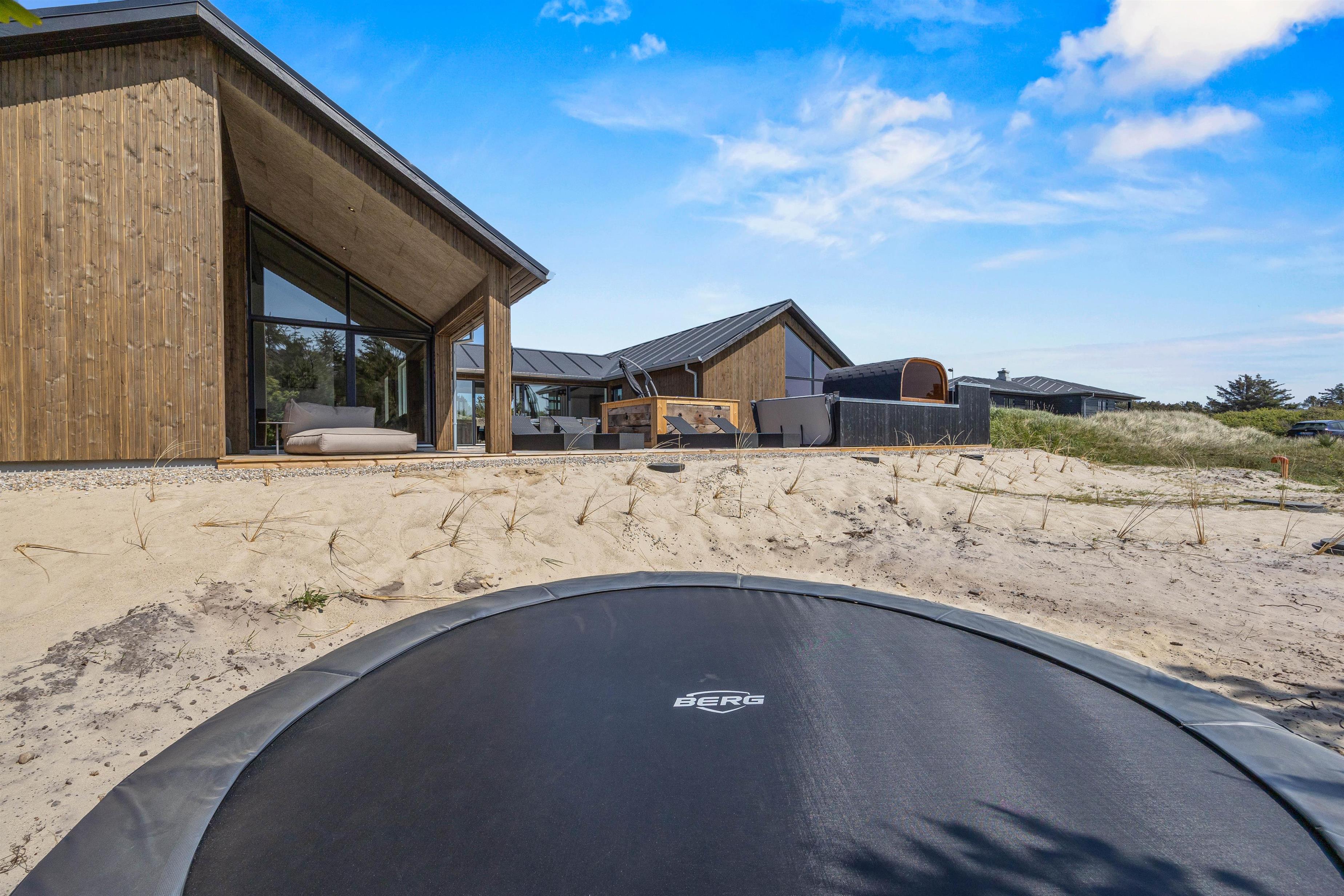 På den vidunderlige terrasse har I rigelig med plads til at nyde solen. Der er komfortable havemøbler og liggestole til rådighed, så I kan slappe af, imens børnene brænder energi af på trampolinen. I wellness-området, som ligger i tæt forbindelse med swimmingpoolen, finder I en udendørs sauna og det udendørs boblebad. Med udsigt over den smukke naturgrund kan I svede igennem i saunaen, afkøle jer under udendørsbruseren* og derefter nyde stjernehimlen over Henne i det boblende vand i spaen. Hvad mere kan man ønske sig?