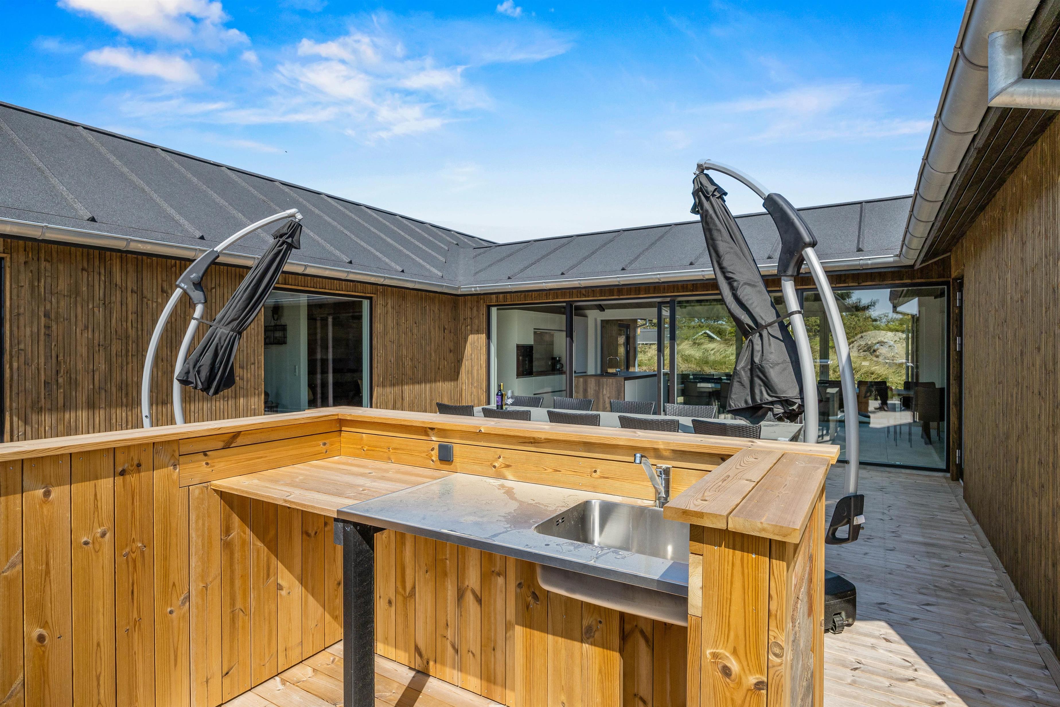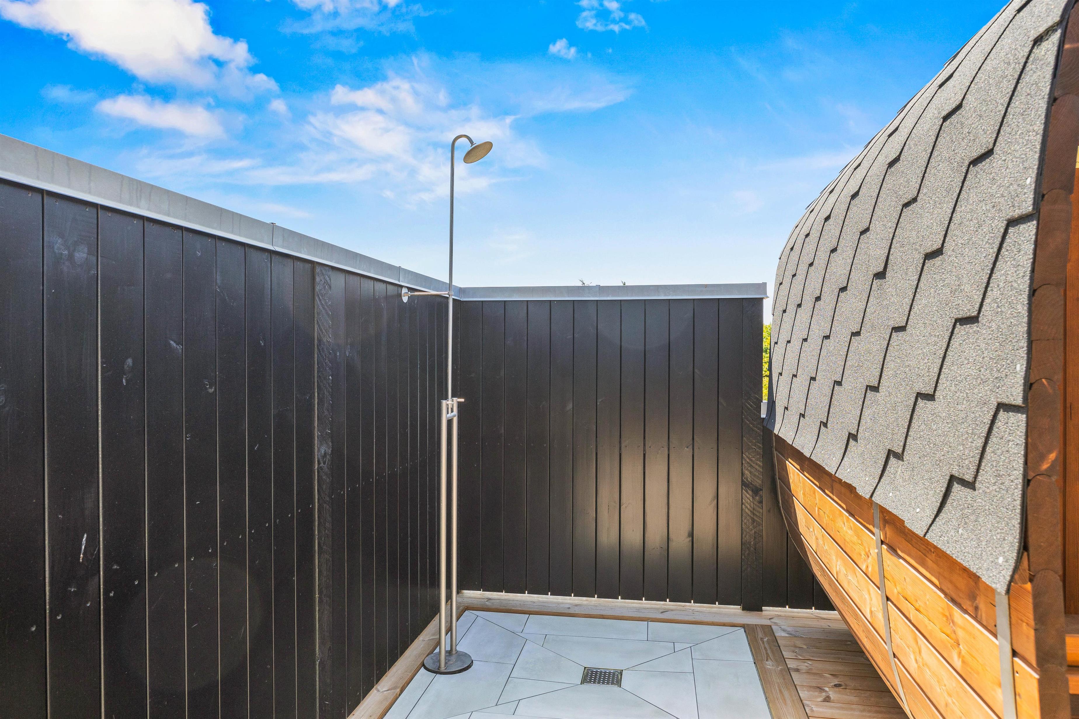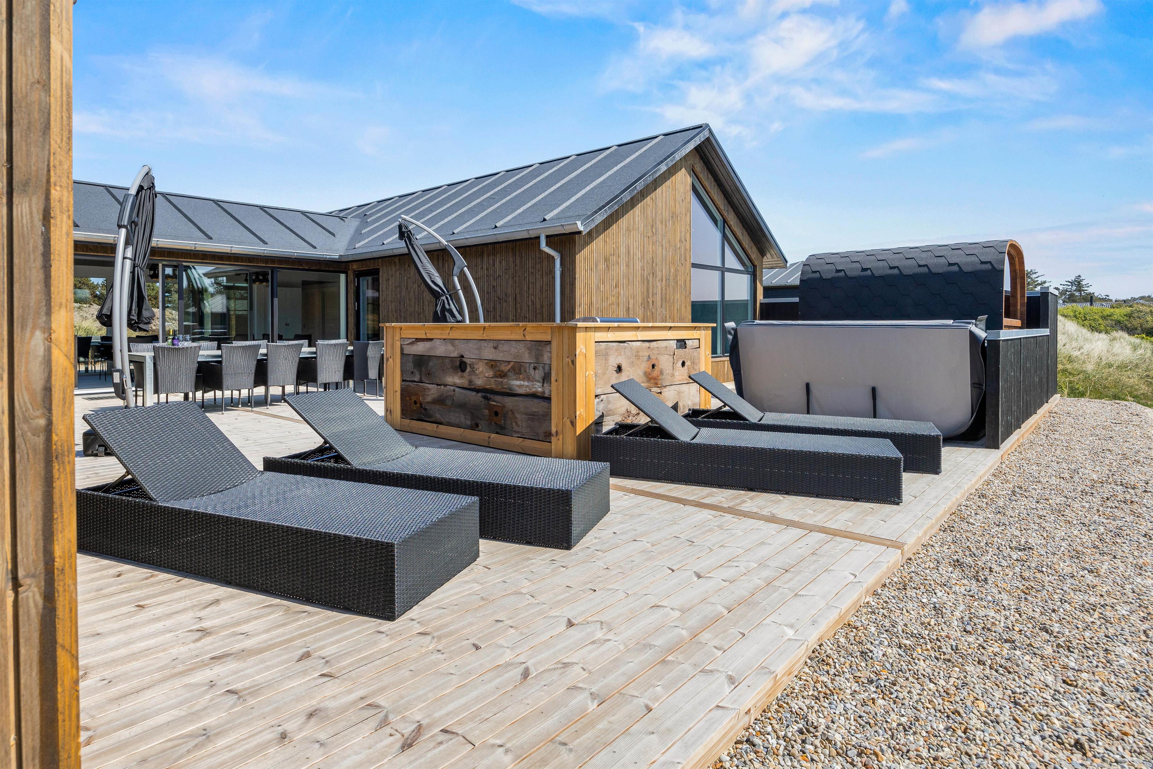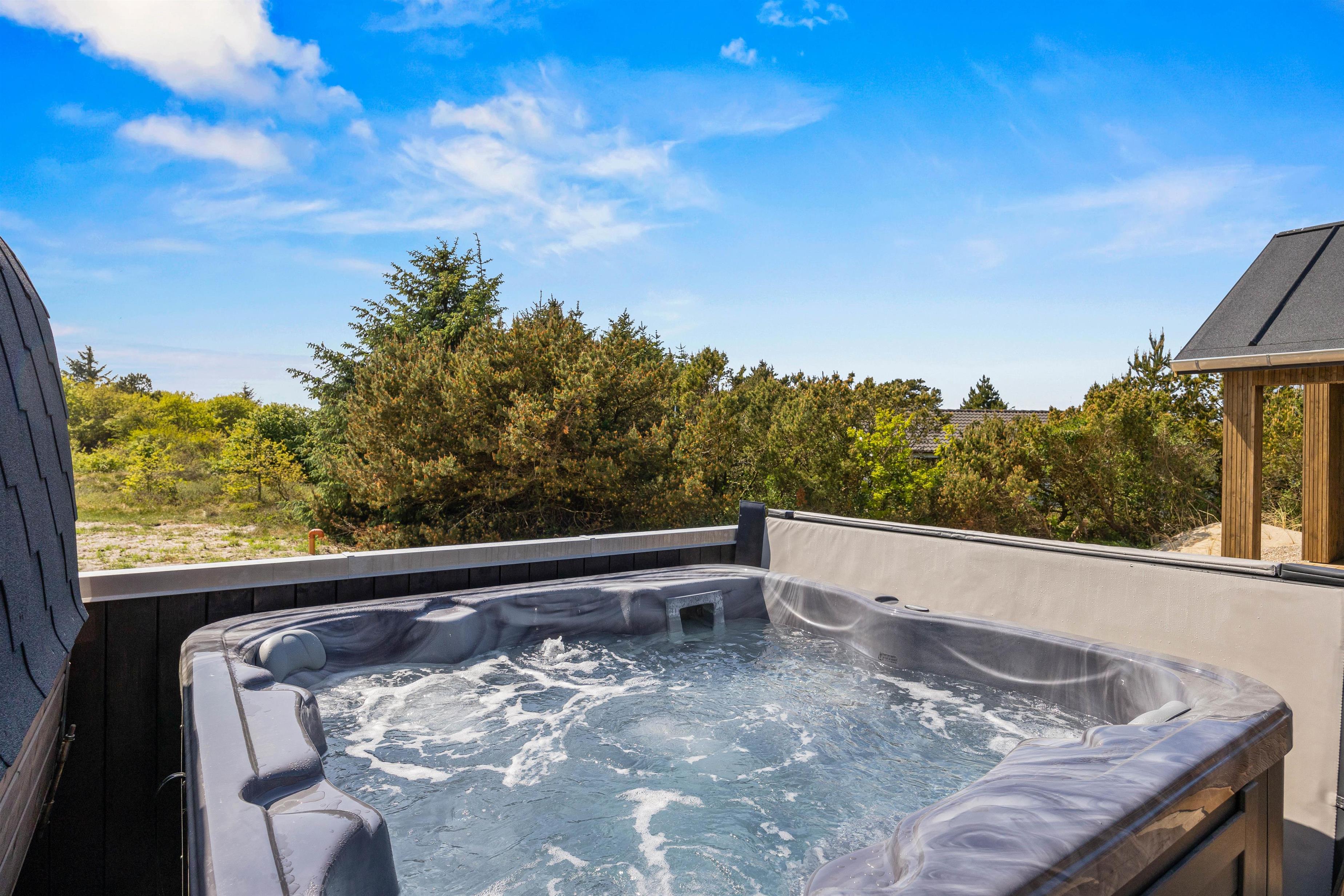 På den vidunderlige terrasse har I rigelig med plads til at nyde solen. Der er komfortable havemøbler og liggestole til rådighed, så I kan slappe af, imens børnene brænder energi af på trampolinen. I wellness-området, som ligger i tæt forbindelse med swimmingpoolen, finder I en udendørs sauna og det udendørs boblebad. Med udsigt over den smukke naturgrund kan I svede igennem i saunaen, afkøle jer under udendørsbruseren* og derefter nyde stjernehimlen over Henne i det boblende vand i spaen. Hvad mere kan man ønske sig?