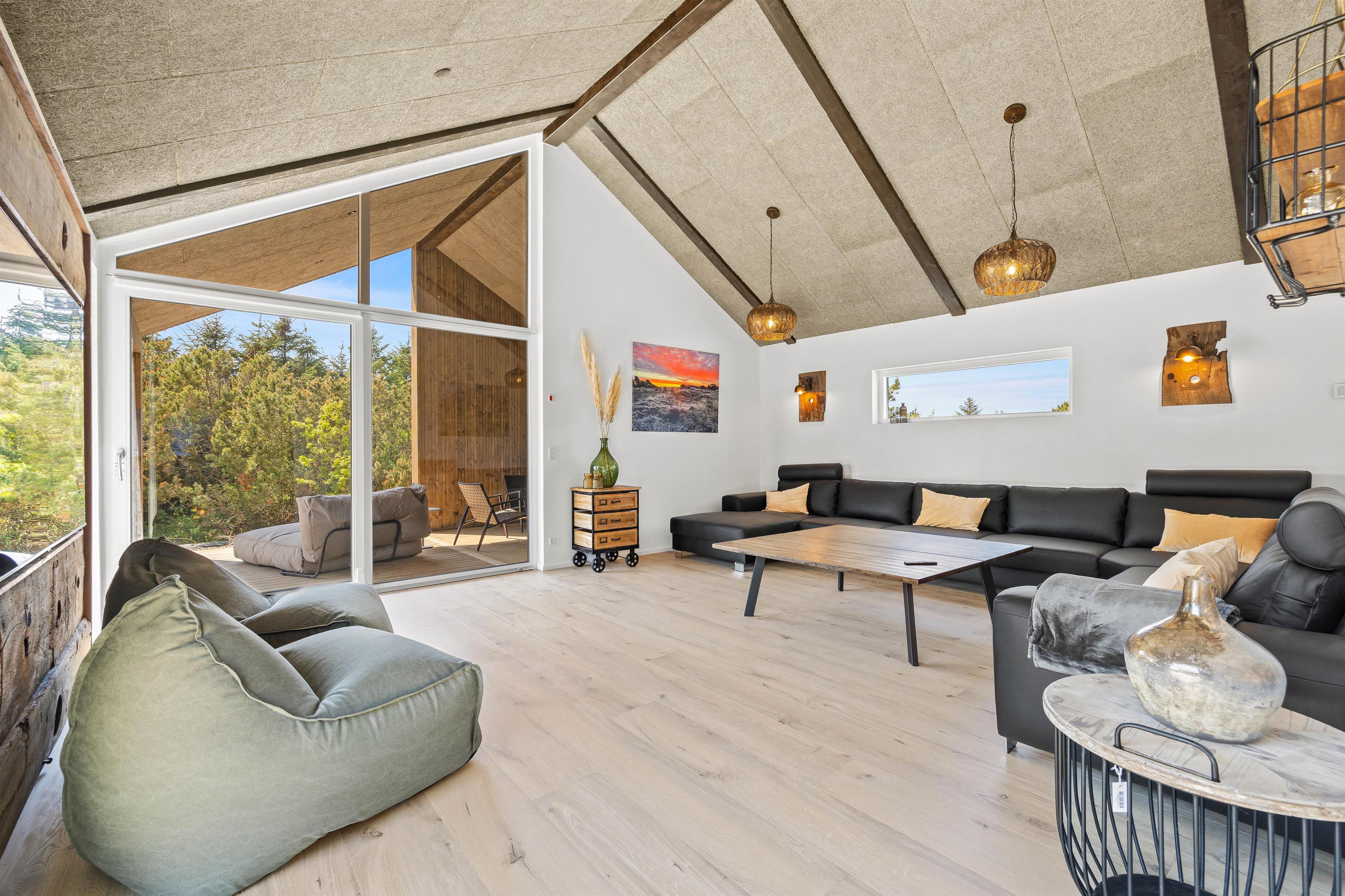 I feriehusets indretning er der lagt vægt på luksus, kvalitet og komfort, så I vil straks føle jer hjemme dette feriehus. Loft op i kip og panoramavinduer booster feriestemningen og gør sommerhuset til en oase af velvære. Det naturlige samlingssted bliver opholdsrummet, som er åbent i forbindelse med det veludstyrede køkken med induktionskogeplade og opvaskemaskine. Her er god plads til, at I kan mødes og hygge med at lave mad sammen, som bagefter kan nydes ved det flotte spisebord og den smukke udsigt gennem det store vinduesparti. Den store lækre sofa indbyder til fælles hygge eller I kan streame jeres yndlingsfilm via cromecast til en hyggelig filmaften.