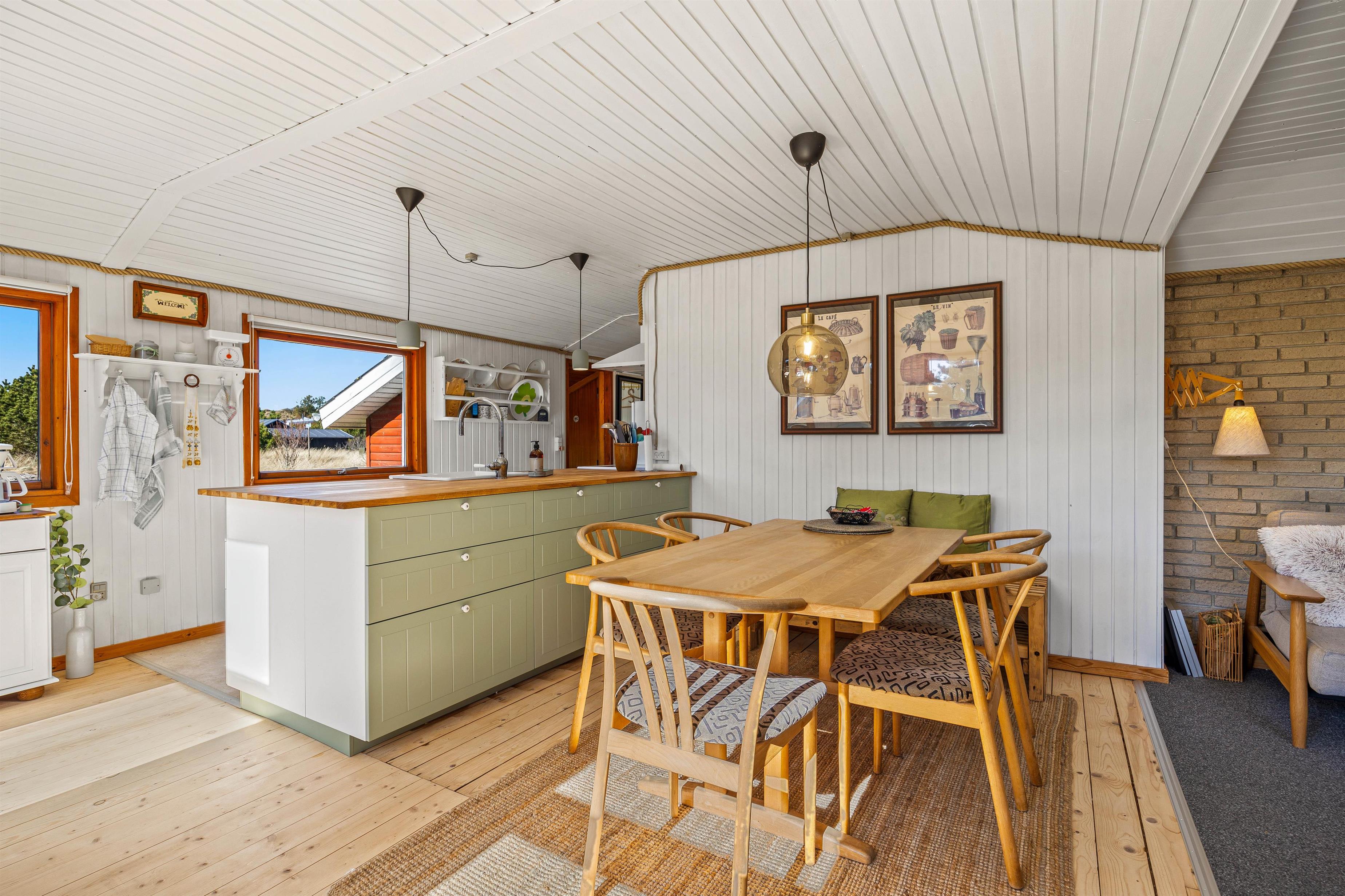 Det fine lysindfald gennem vinduespartierne og direkte udgang til terrassen gør, at man føler sig tæt på naturen. Det åbne plan med køkken, spiseafdeling og opholdsstue med brændeovn er feriehusets hjerte. Her kan man lave mad sammen, spille brætspil eller trække sig tilbage i sofaen med en god bog. En energibesparende og effektiv varmepumpe sørger for en behagelig varme i feriehuset.