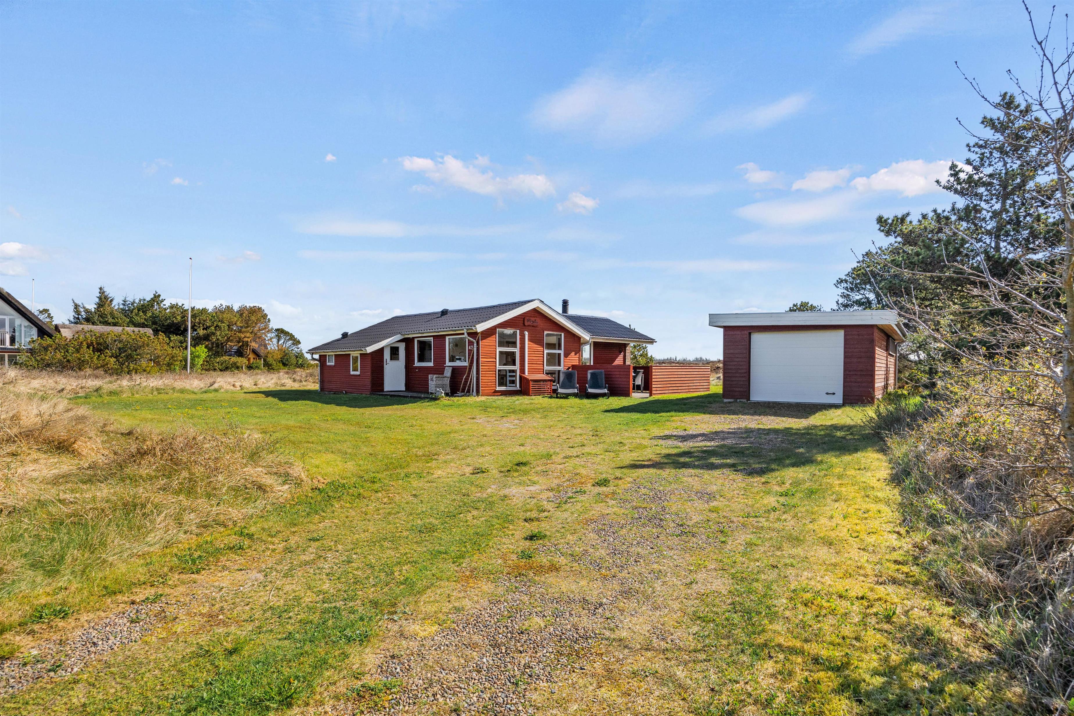 Med kun 1000 meter til den lange hvide sandstrand og 800 meter til den livlige indkøbs- og handelsgade er alt, hvad hjertet begærer, i komfortabel afstand fra feriehuset, og I kan nyde en ægte vesterhavsferie. Den afskærmede terrasse og den 1600 m² store naturgrund danner den perfekte ramme om din tid ude midt i den idylliske natur, et udendørs boblebad og en fantastisk udsigt over lyngsletten.