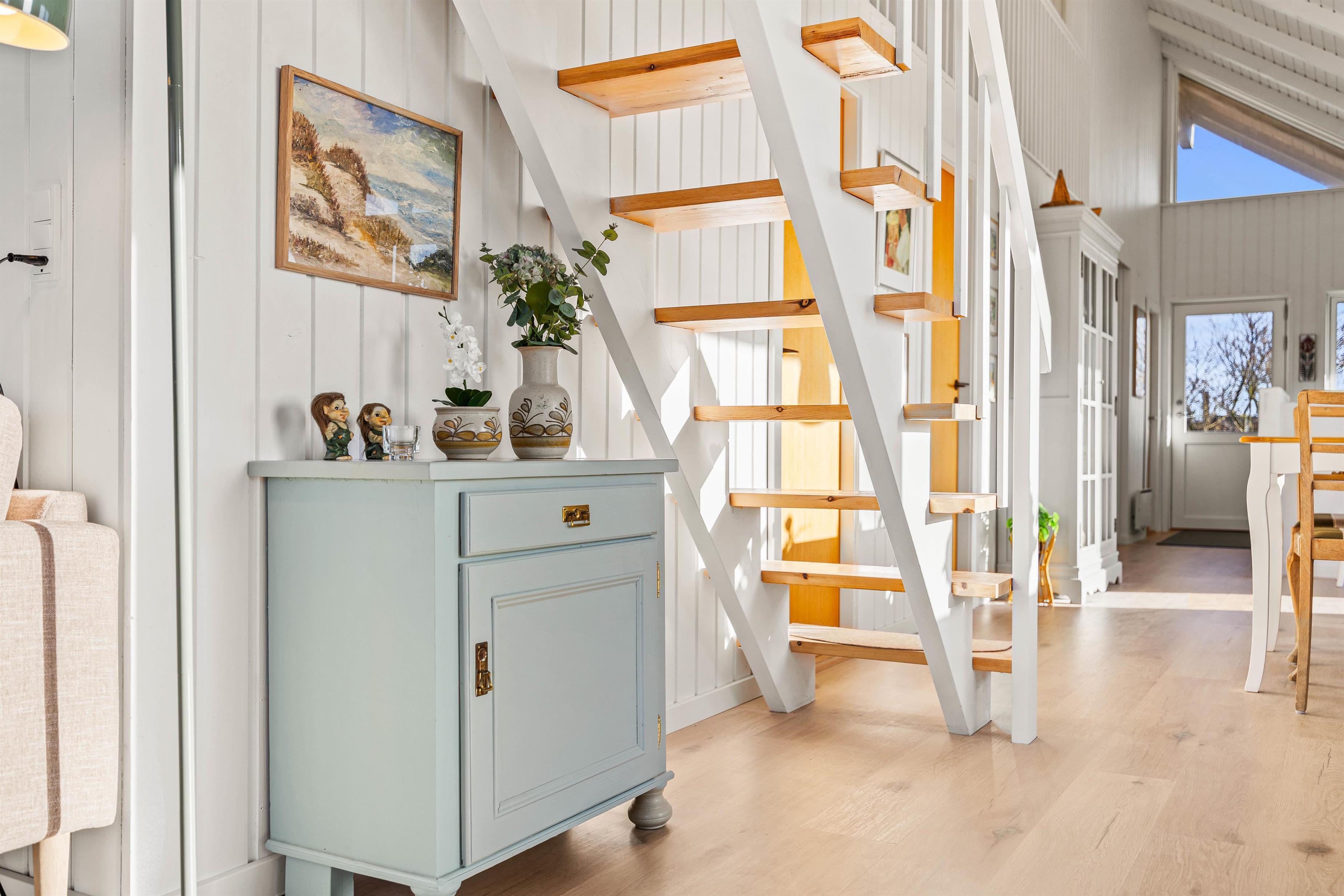 Der er også god opbevaring/garderobeplads i den hyggelige baggang, samt vaskemaskine og tørretumbler.