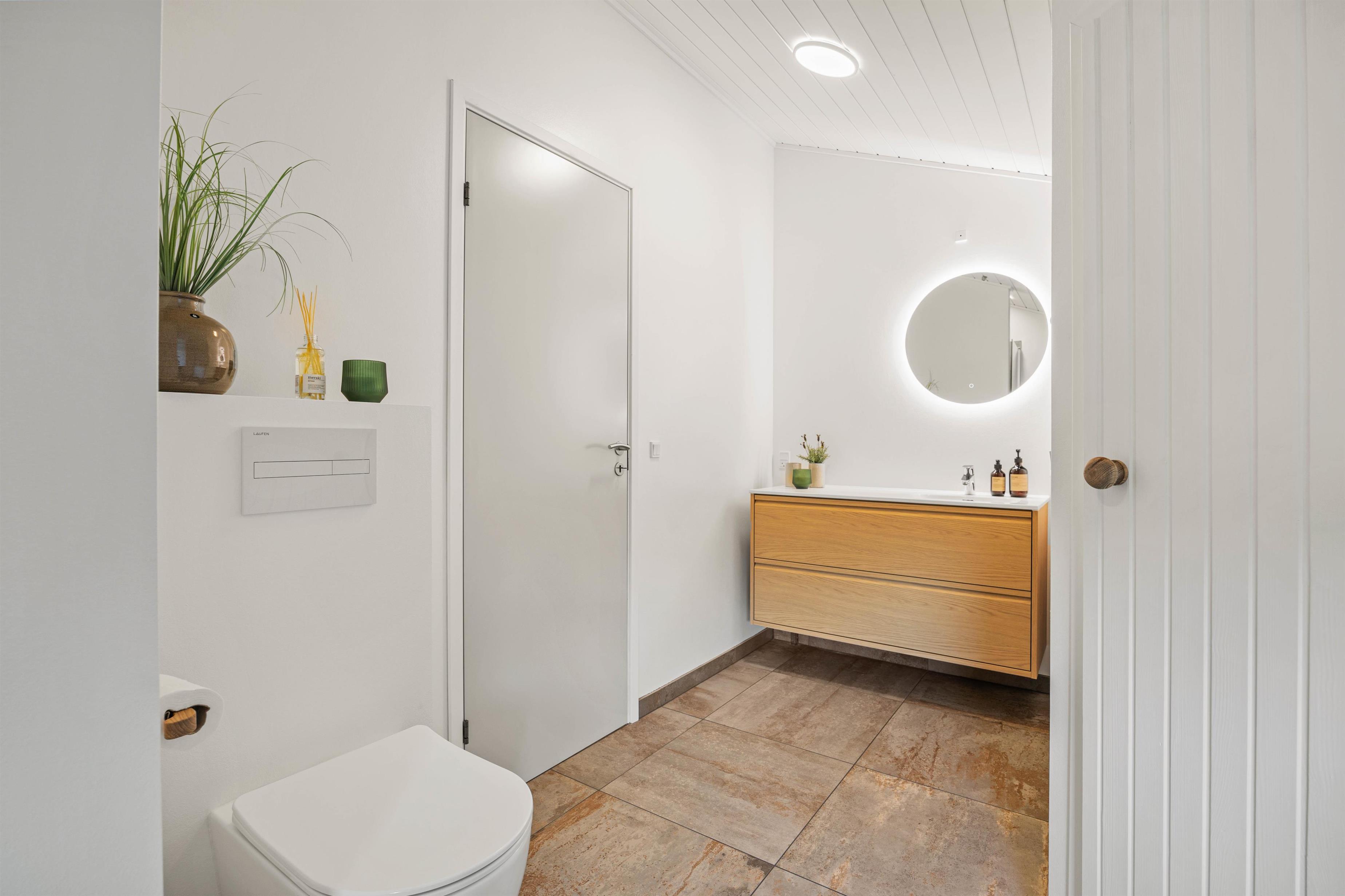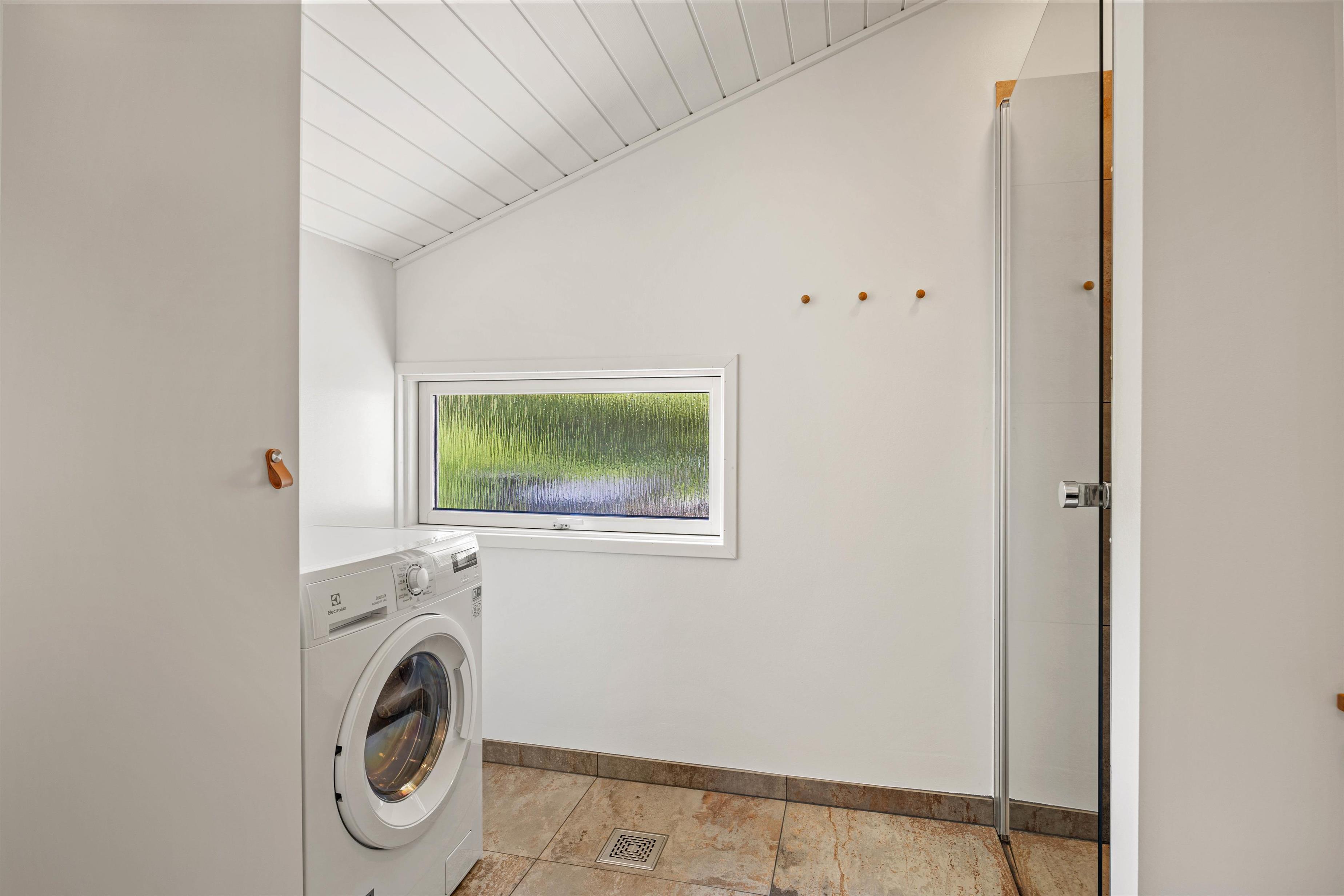 Sommerhuset byder en række praktiske faciliteter, såsom mikroovn, opvaskemaskine, vaskemaskine og tørretumbler, der gør jeres ferie endnu mere bekvem. Der er også en energieffektiv luft-til-luft varmepumpe, som sikrer et behageligt indeklima året rundt. Badeværelset er udstyret med gulvvarme og en skøn sauna, hvor I kan forkæle jer selv og slappe af efter en dag fyldt med eventyr.