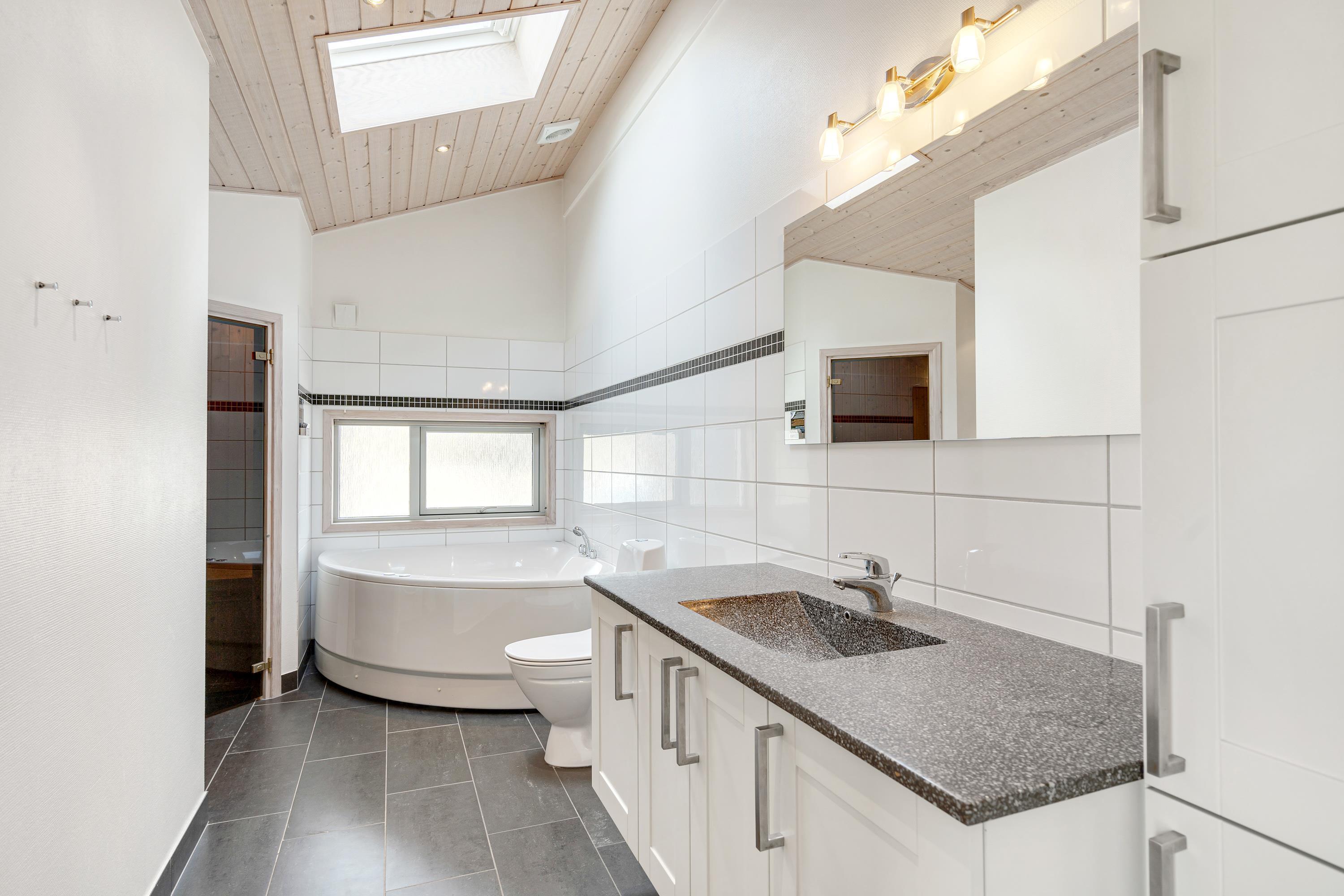 Feriehuset er udstyret med 2 badeværelser (begge med gulvvarme), så I slipper for lange køer til badet om morgenen. Det største badeværelse er desuden indrettet med en lille, privat wellnessoase med sauna og spabad. Her kan I rigtig nyde ferietiden og tanke ny energi, langt væk fra den travle hverdag.