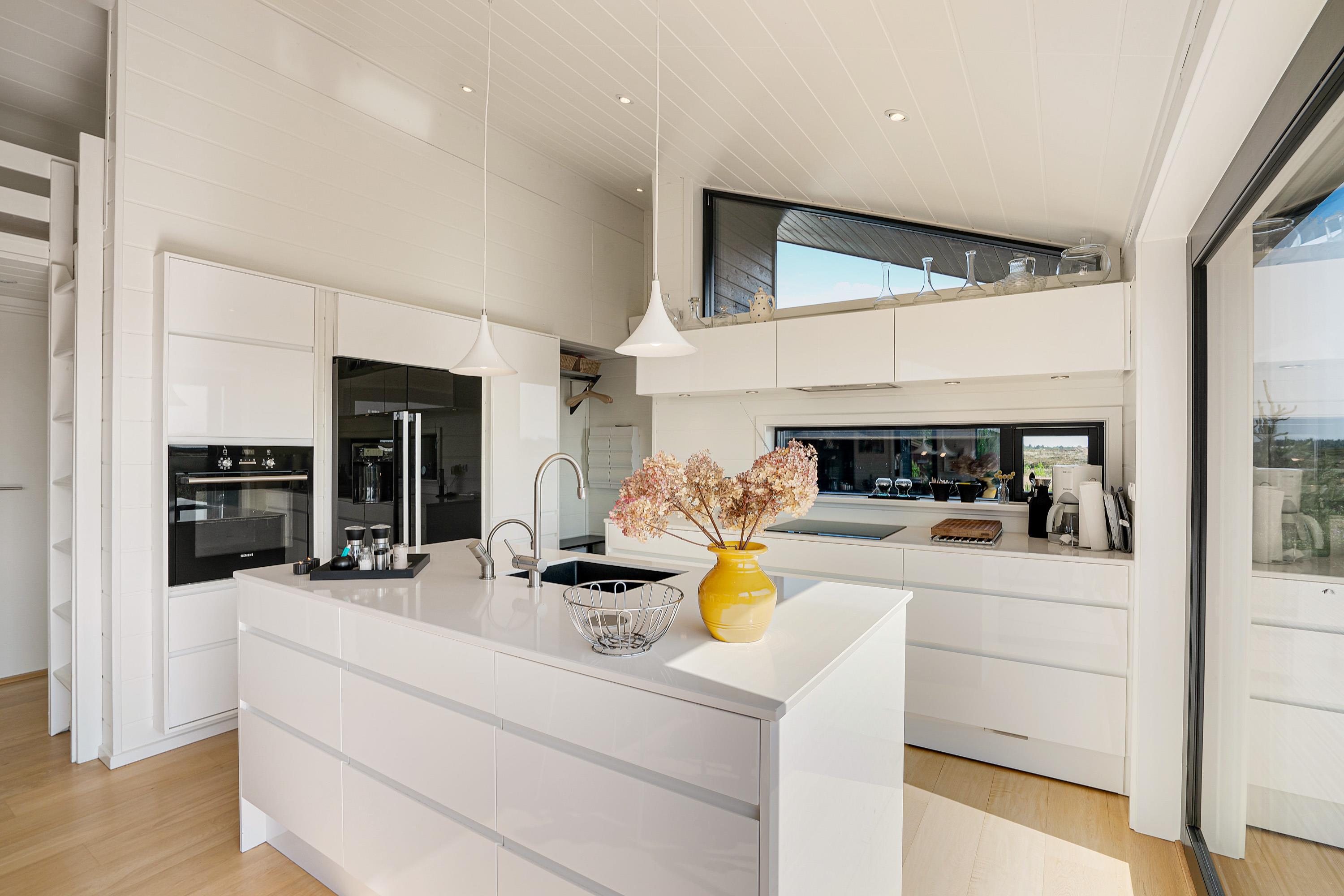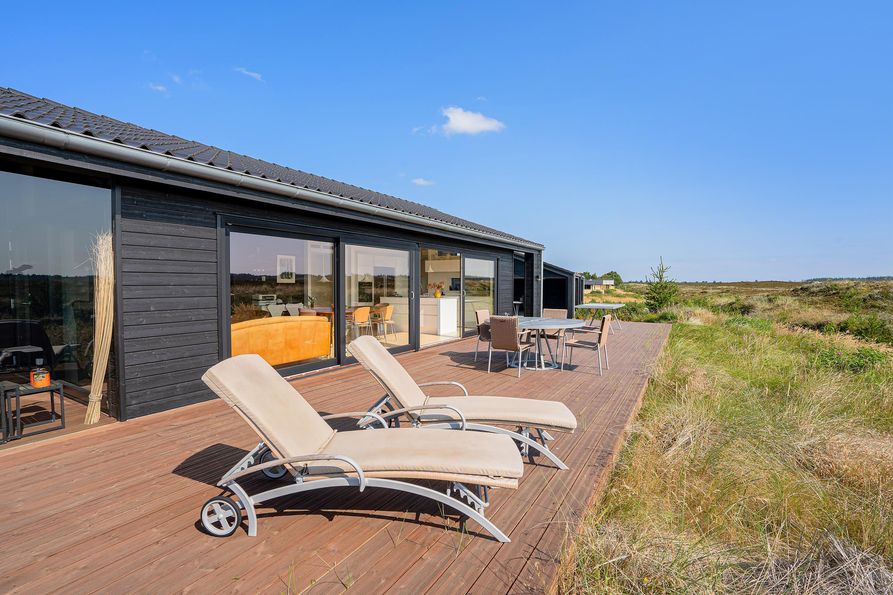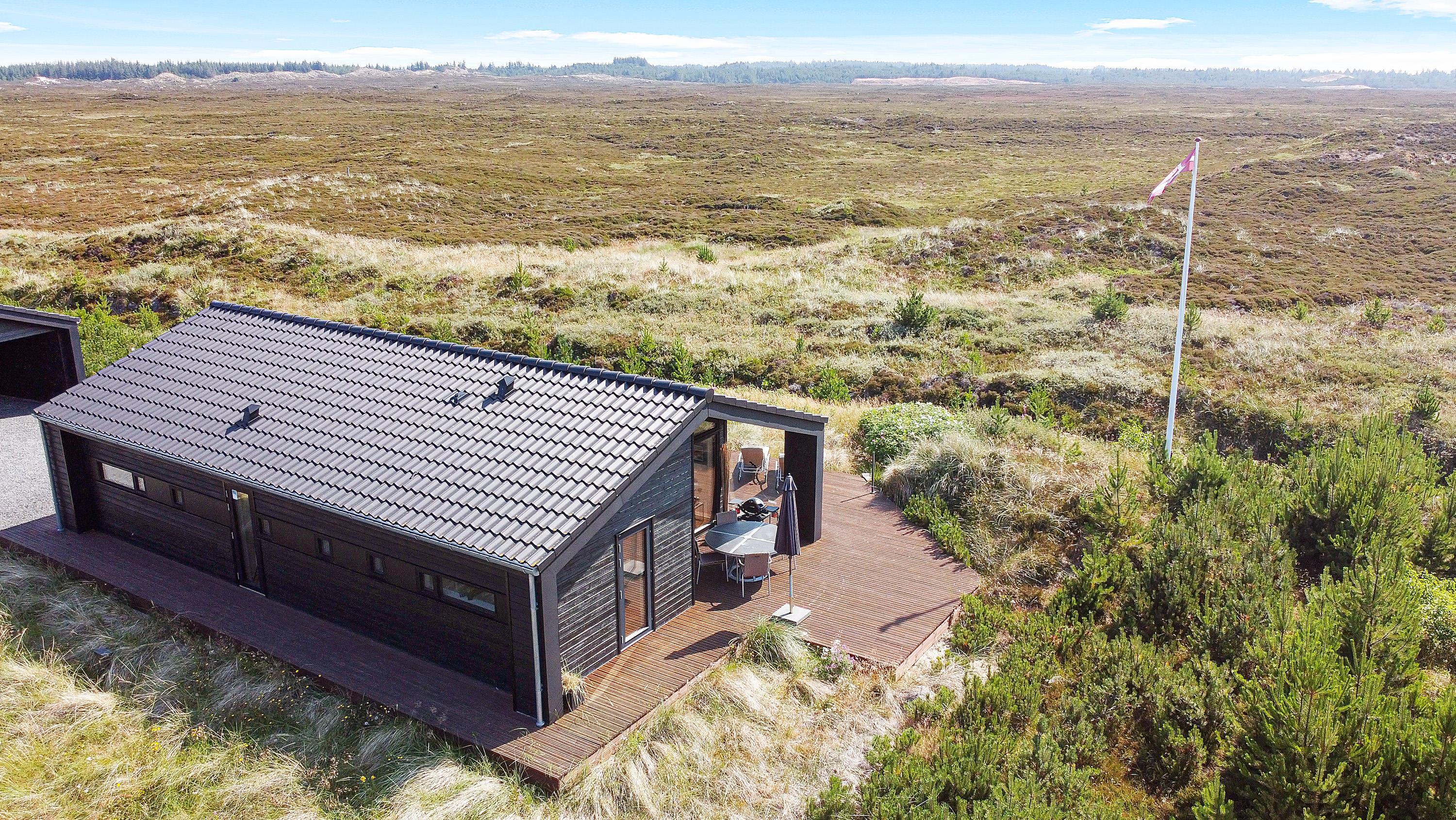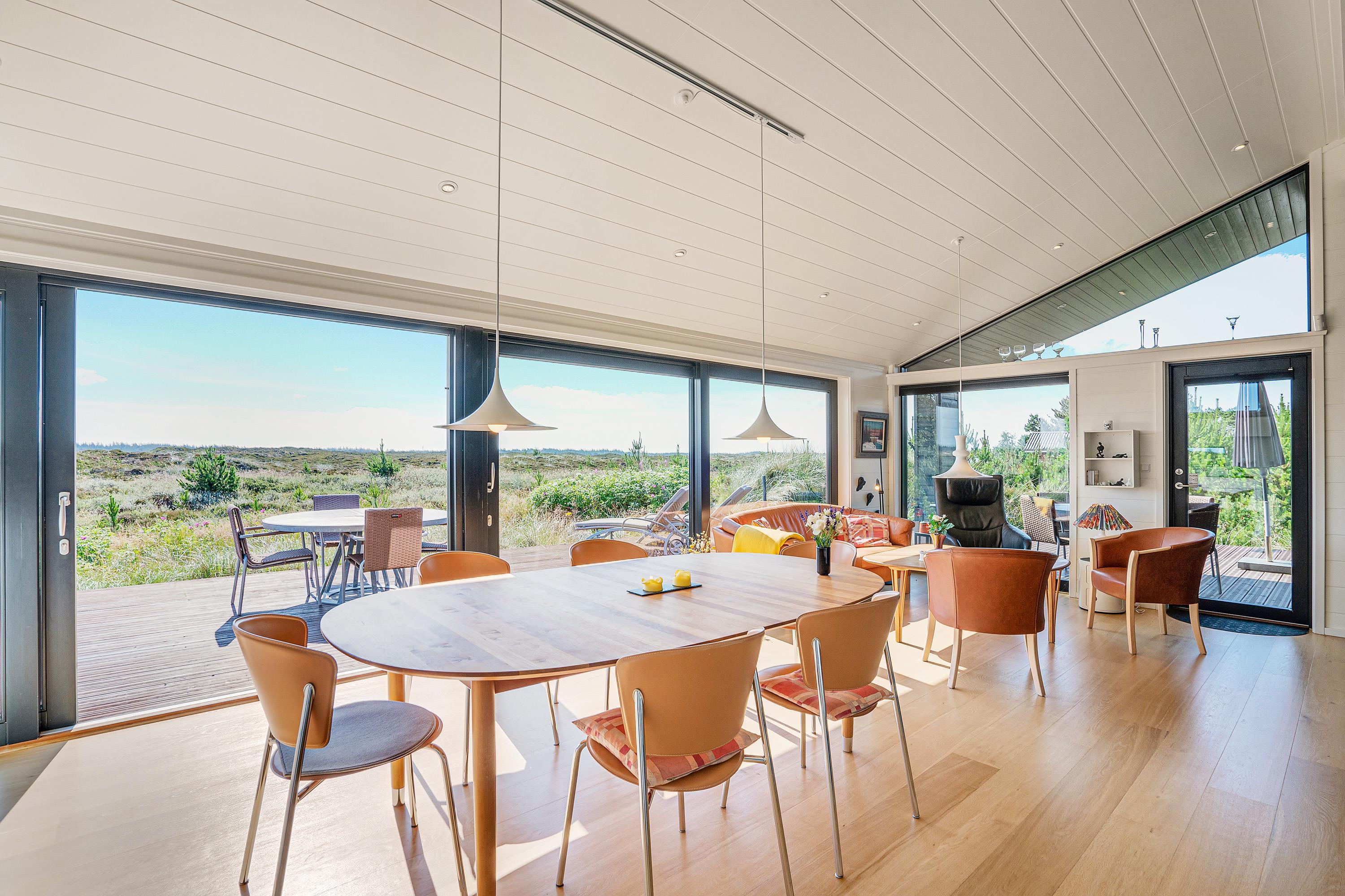 Køkken, stue og spisestue er ét stort rum, så I stadig kan være sammen, selvom nogle er i køkkenet og andre slapper af på sofaen. Derfra er der direkte adgang til terrassen, hvor I kan nyde morgensolen. Den vidunderlige udsigt over det store lyngområde kan både nydes fra terrassen og inde fra feriehuset.