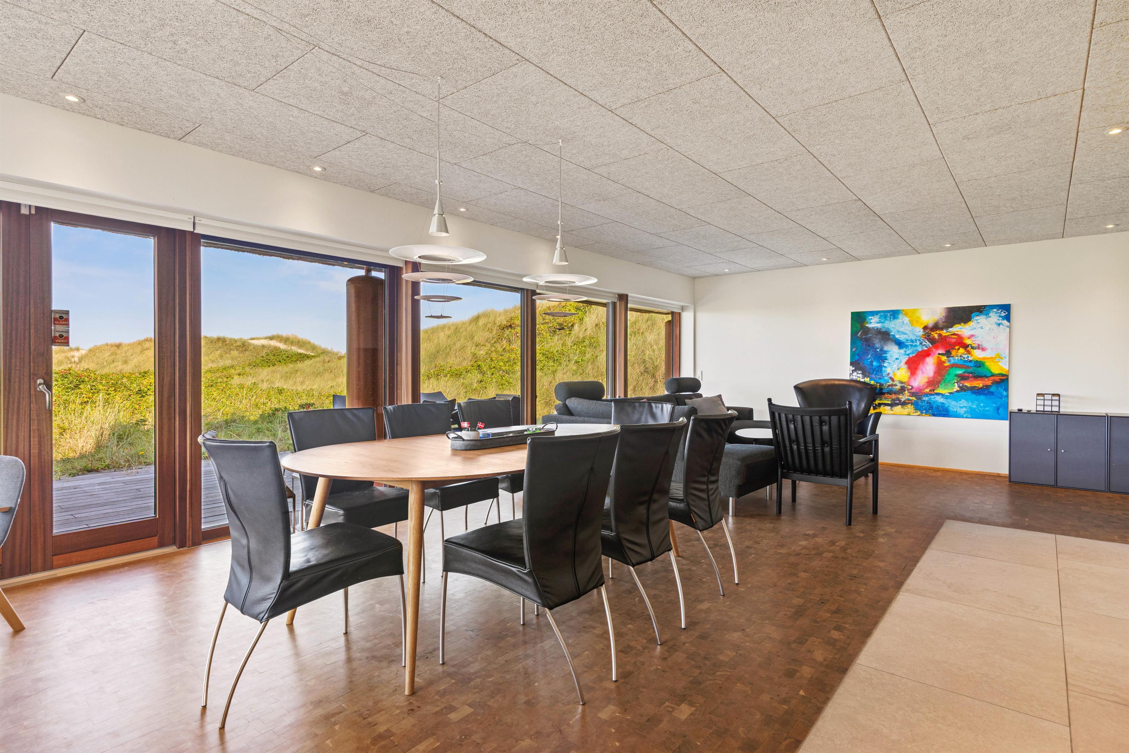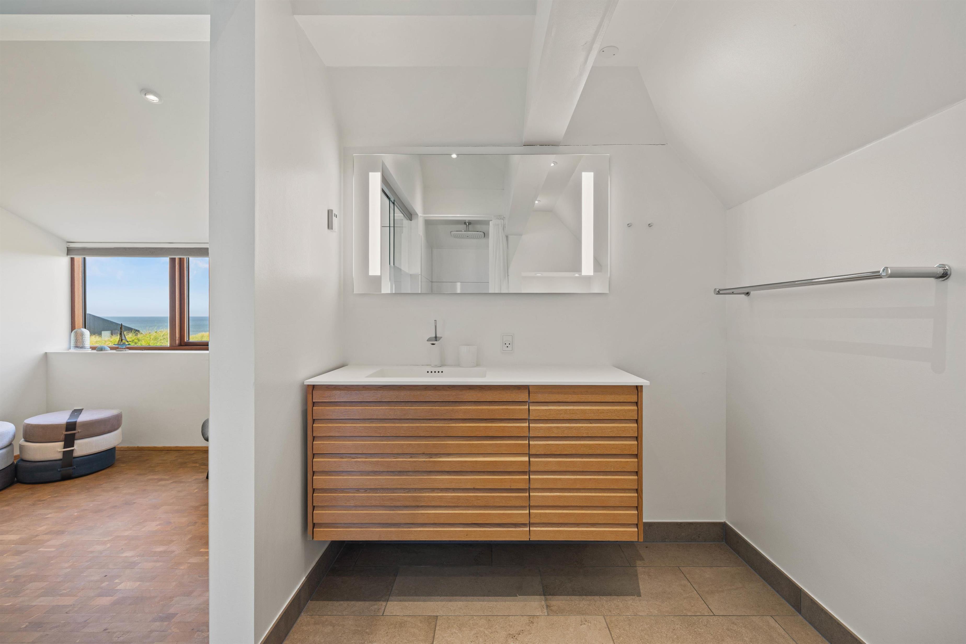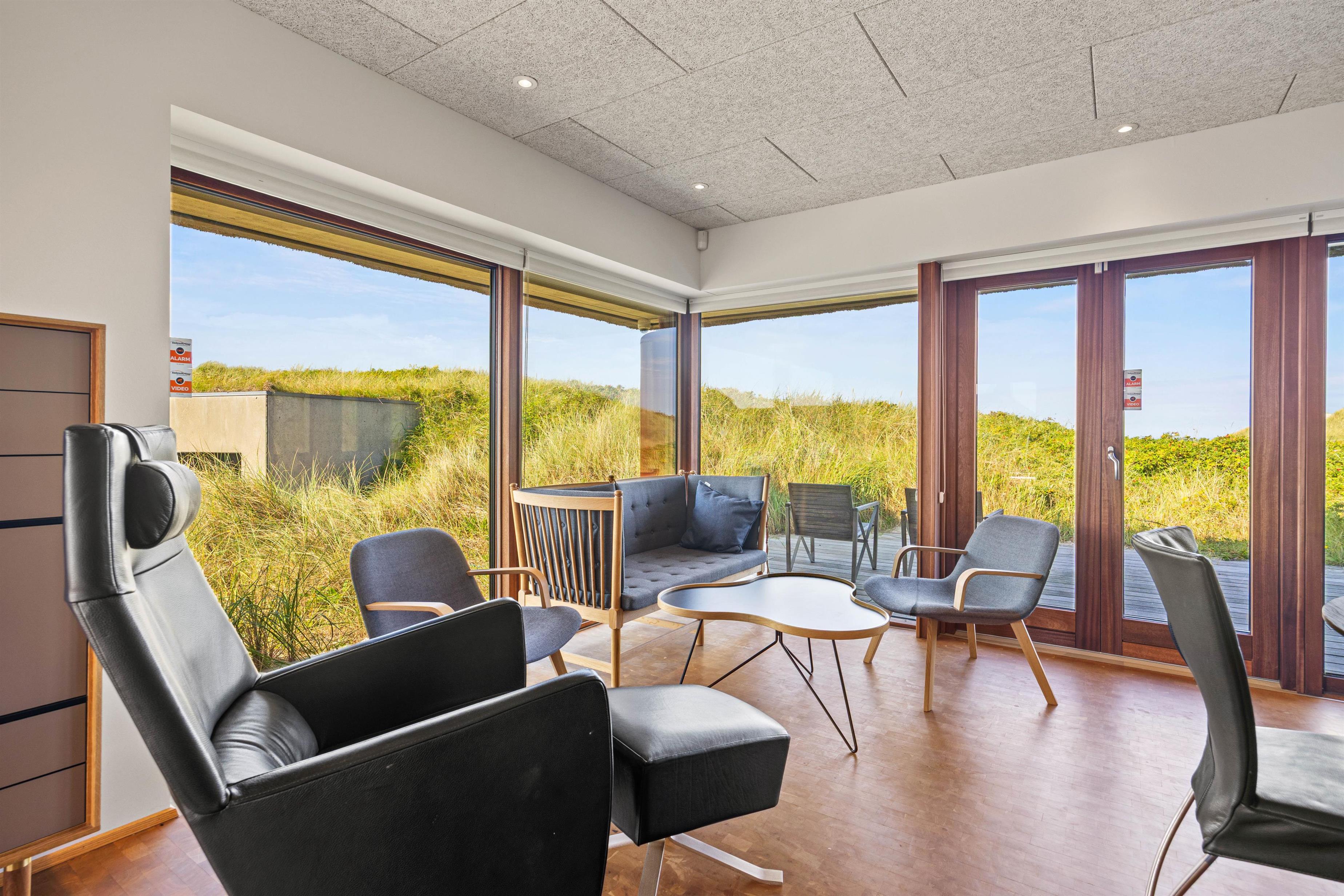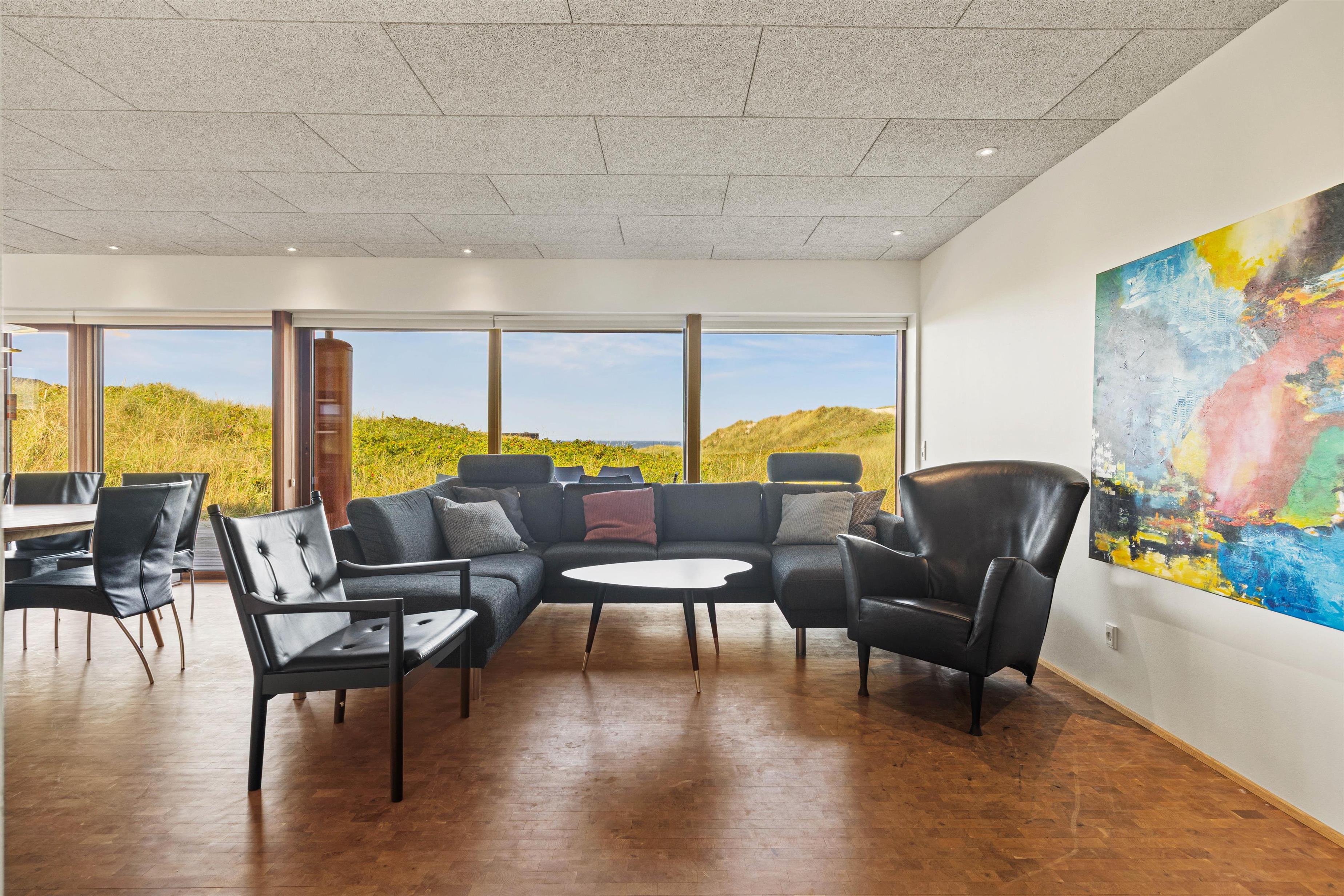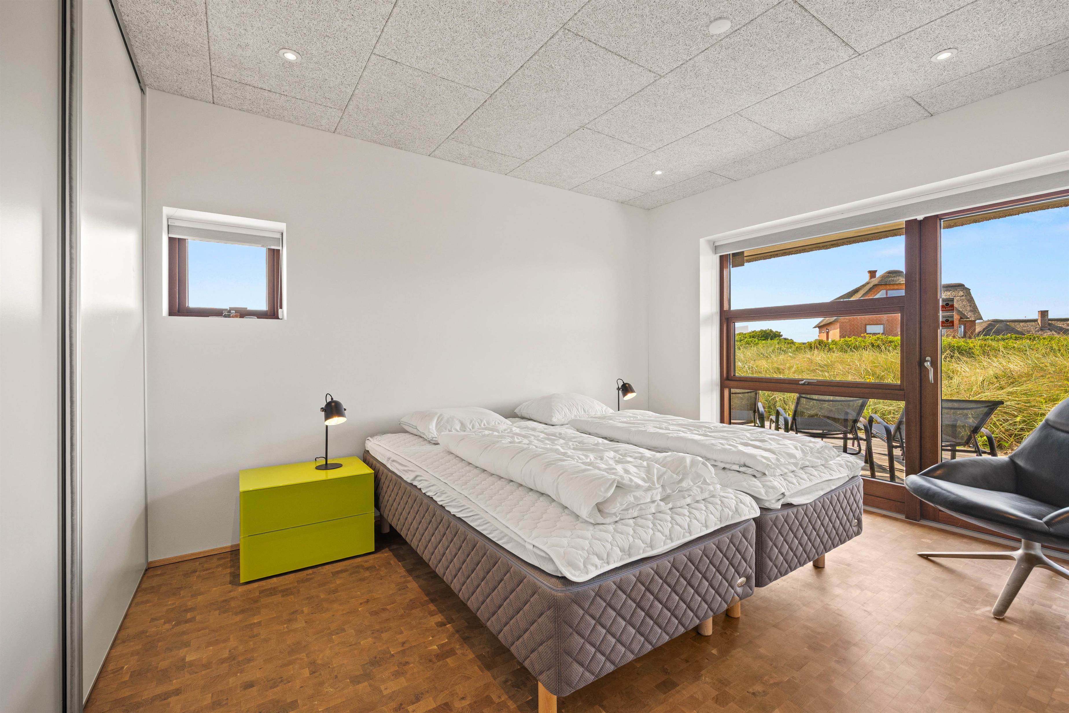 Det eksklusivt beliggende feriehus garanterer med sine 180 m2 et skønt ferieophold for op til 10 personer. Det ene af sommerhusets 4 soveværelser med eget bad ligger på husets første sal – her kan du stå op til den mest fantastiske udsigt og straks tjekke, om du ikke lige skal have en morgendukkert før morgenmaden. Bor du i et af de 2 øvrige værelser, kan du åbne terrassedøren og på bare tæer liste ud og nyde morgenluften ved Vesterhavet. I kælderen er der værelse med dobbeltseng og køjeseng, indrettet som familierum med TV.