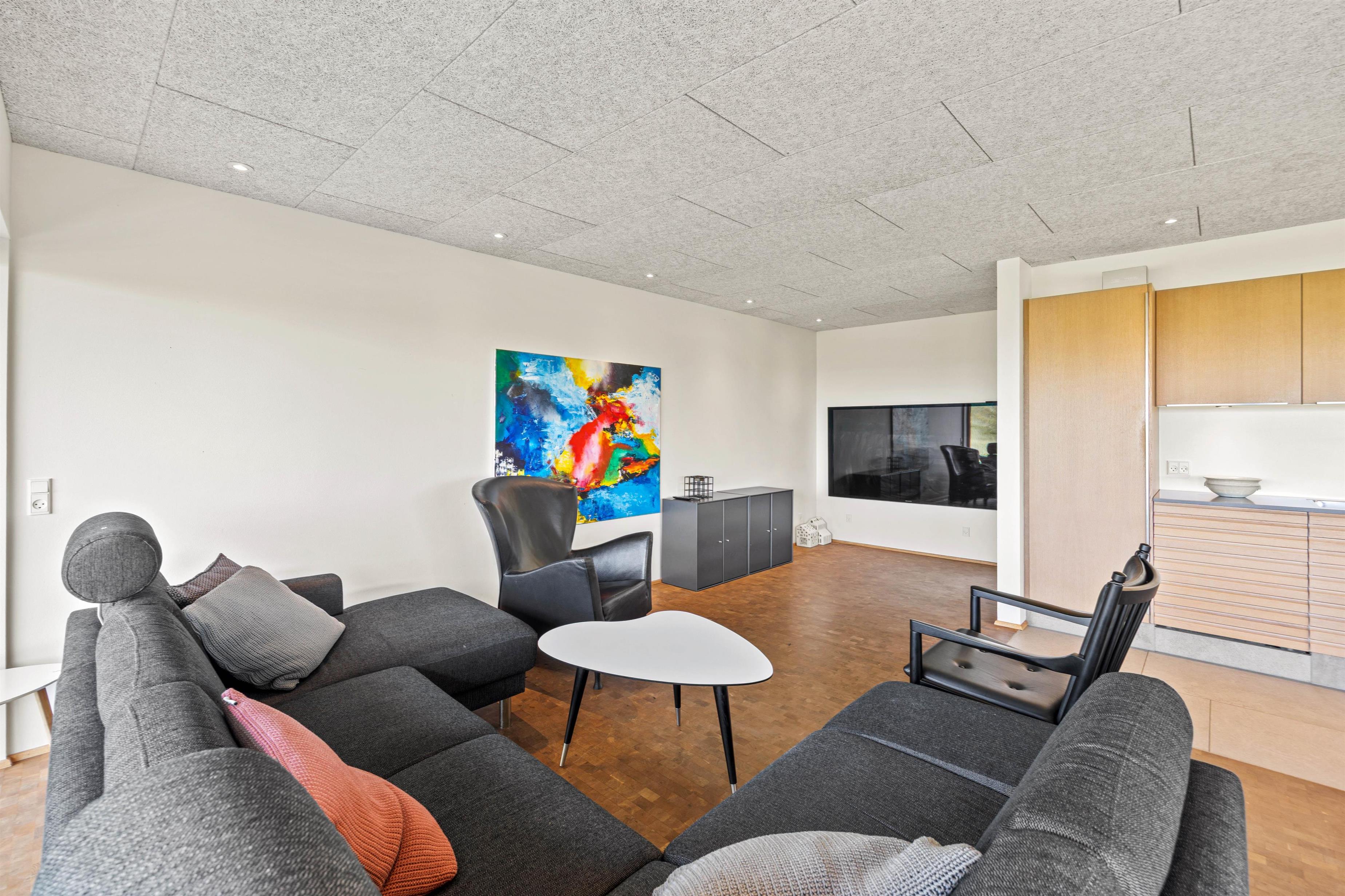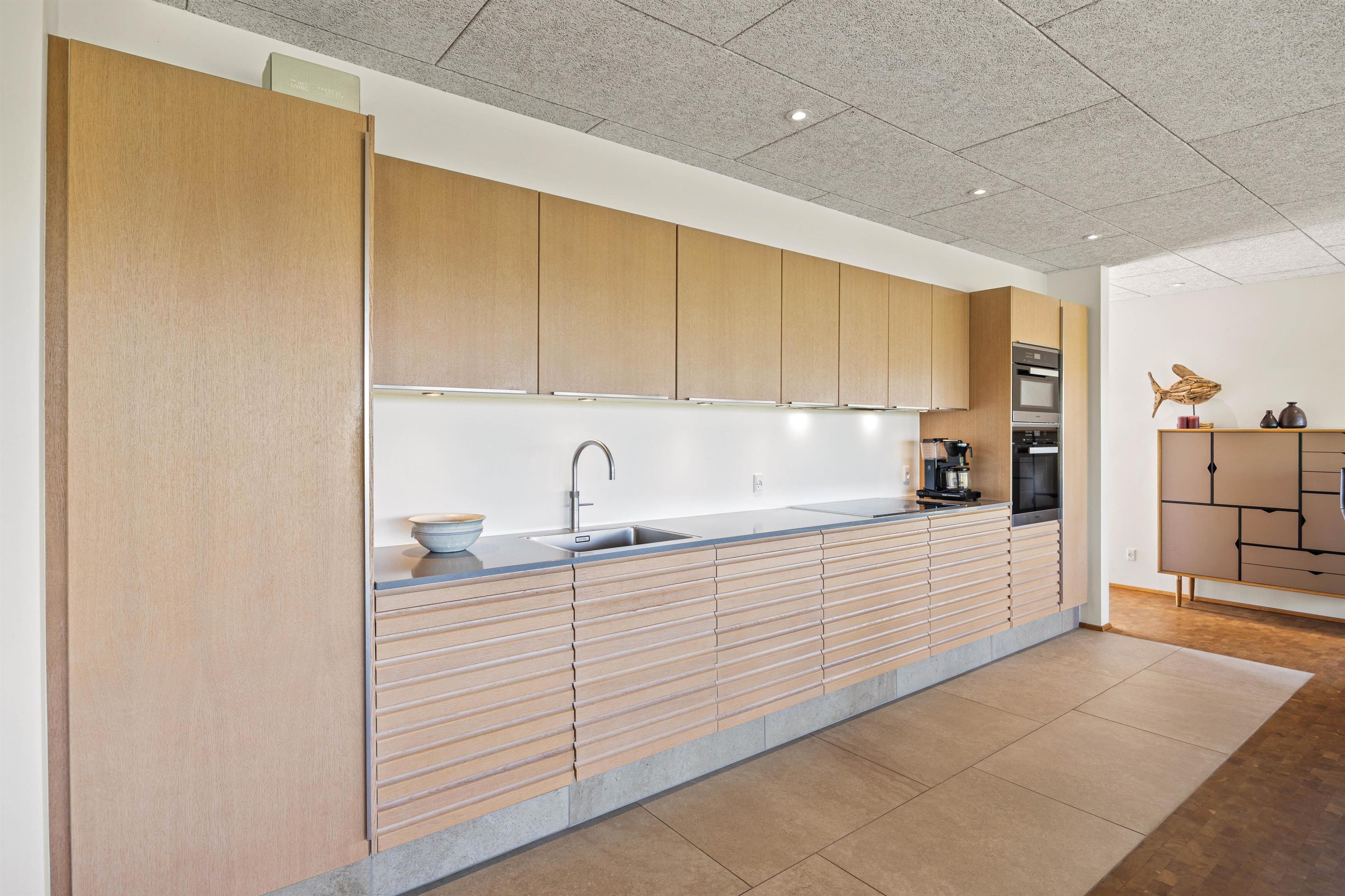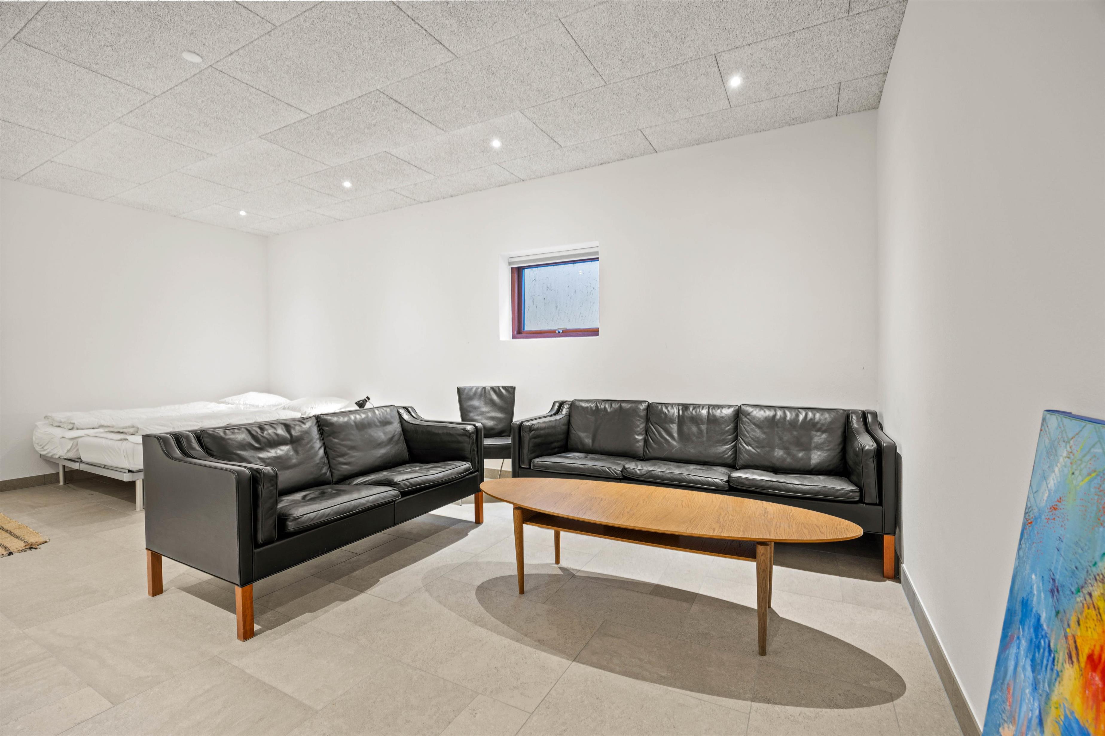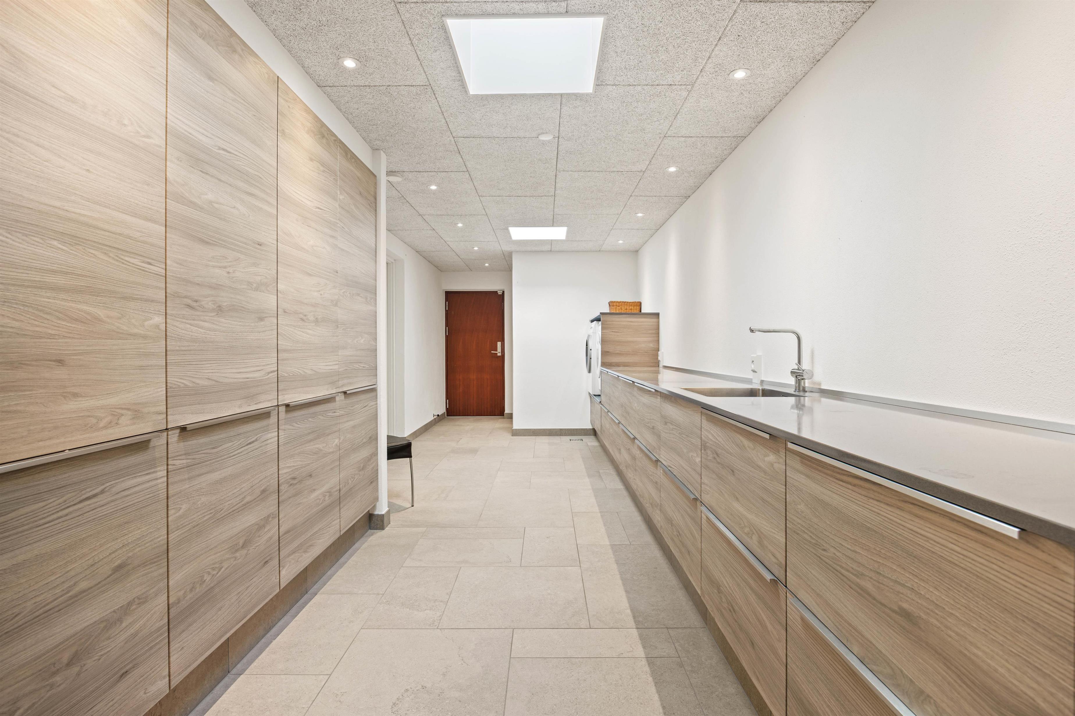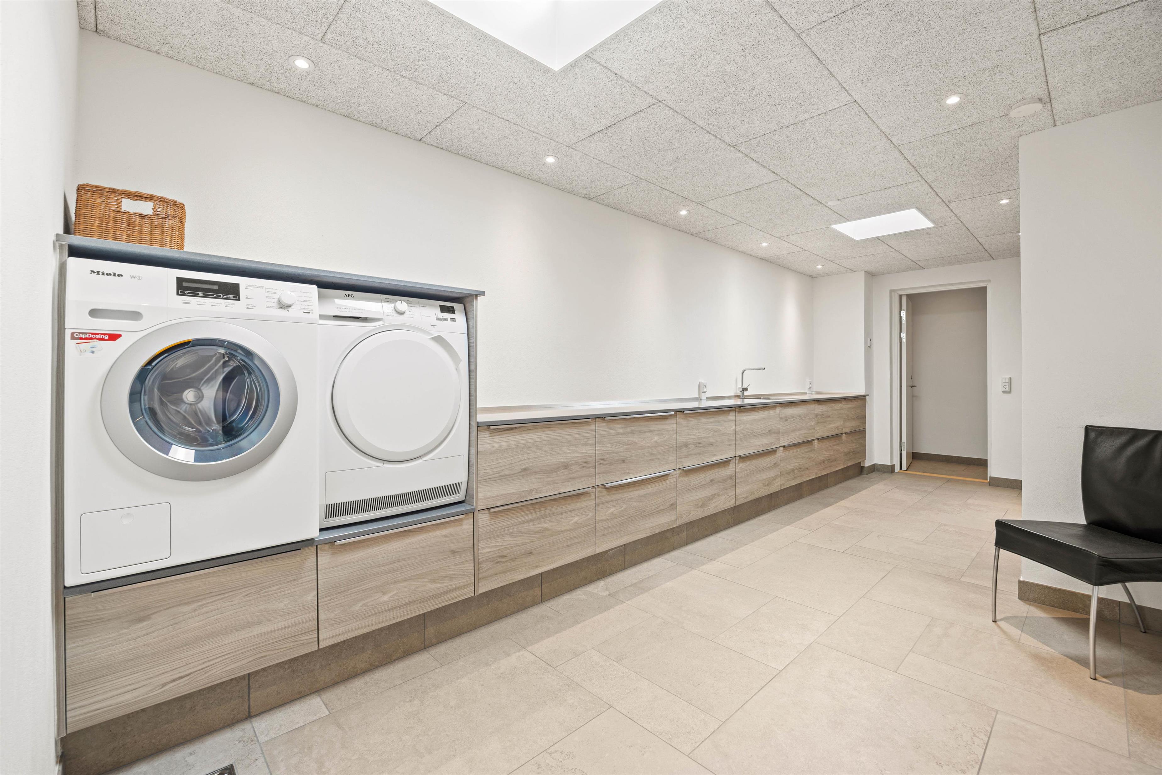 I husets underetage er der både et ekstra fjernsynsrum og et rum med praktiske faciliteter som vaskemaskine og tørretumbler. Ikke mindst har du en stor garage, så du ubesværet kan nyde den salte havluft, men bilen står tørt og sikkert.