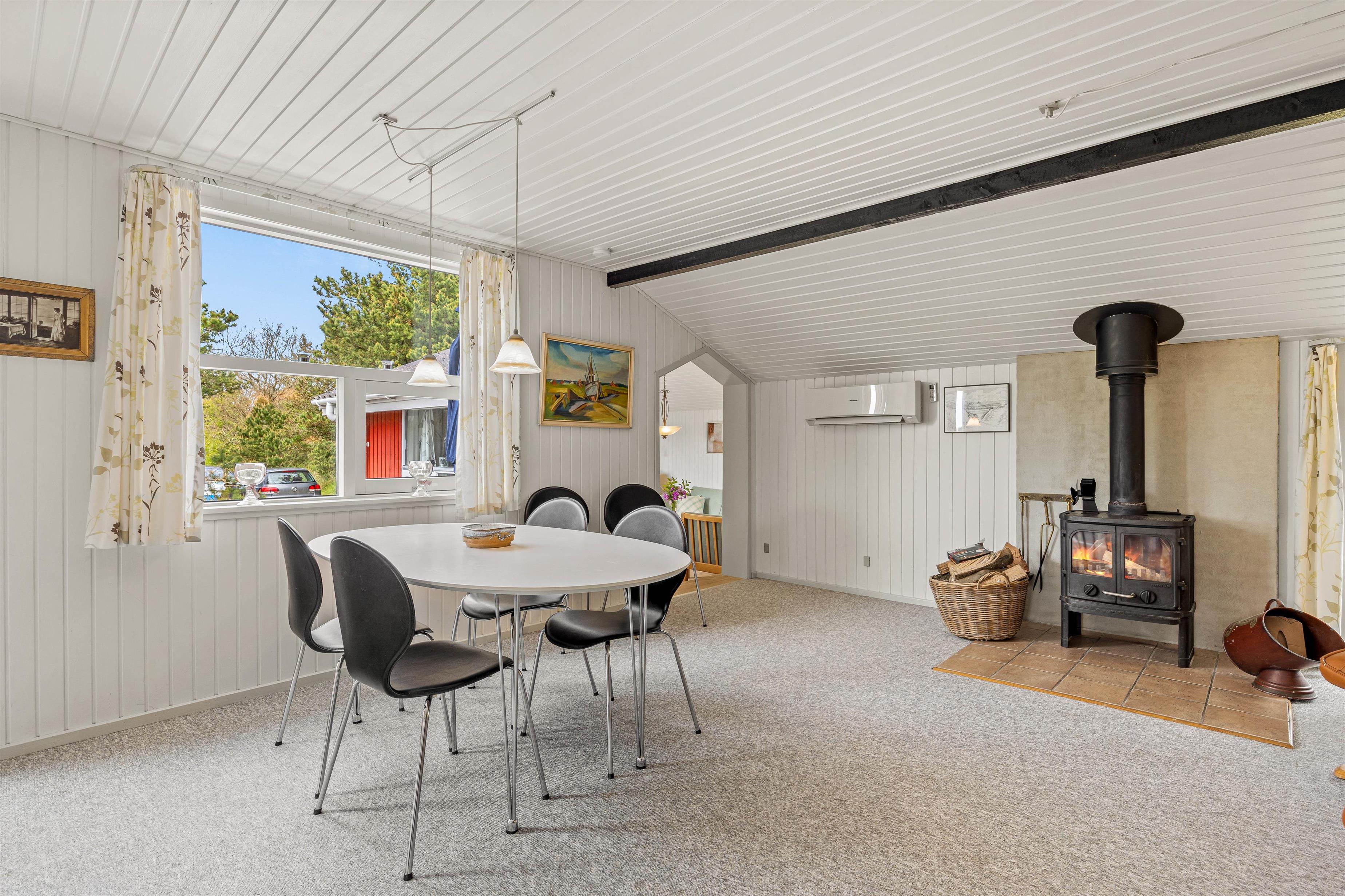 Hjerterummet er stuen, som ligger i åben forbindelse med spisepladsen og det funktionelle køkken. Her er mange hyggelige kroge, hvor man kan sidde og læse en god bog, spille brætspil eller se film i sofaen. Varmepumpen sørger for et behageligt indeklima, og brændeovnen spreder god stemning.