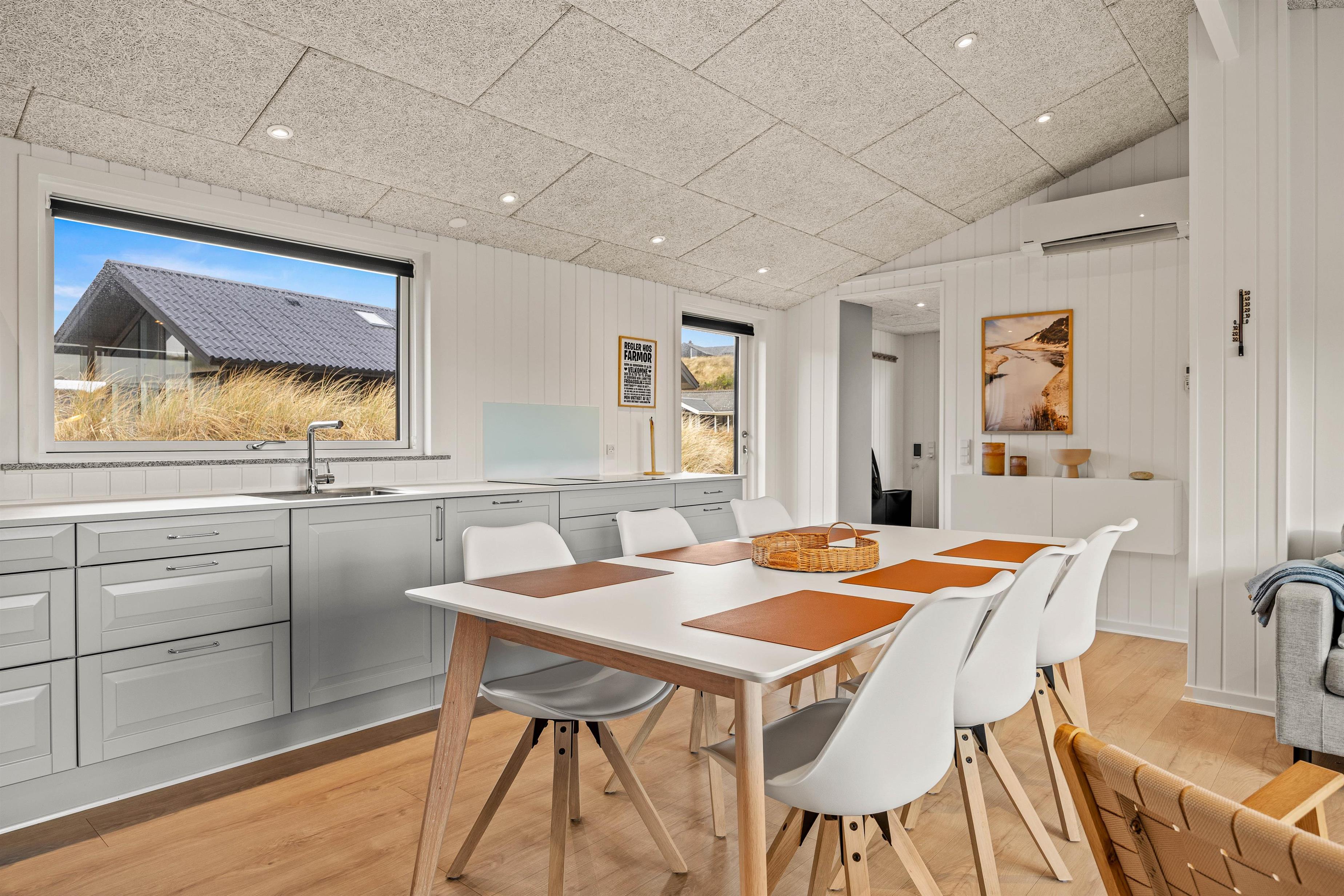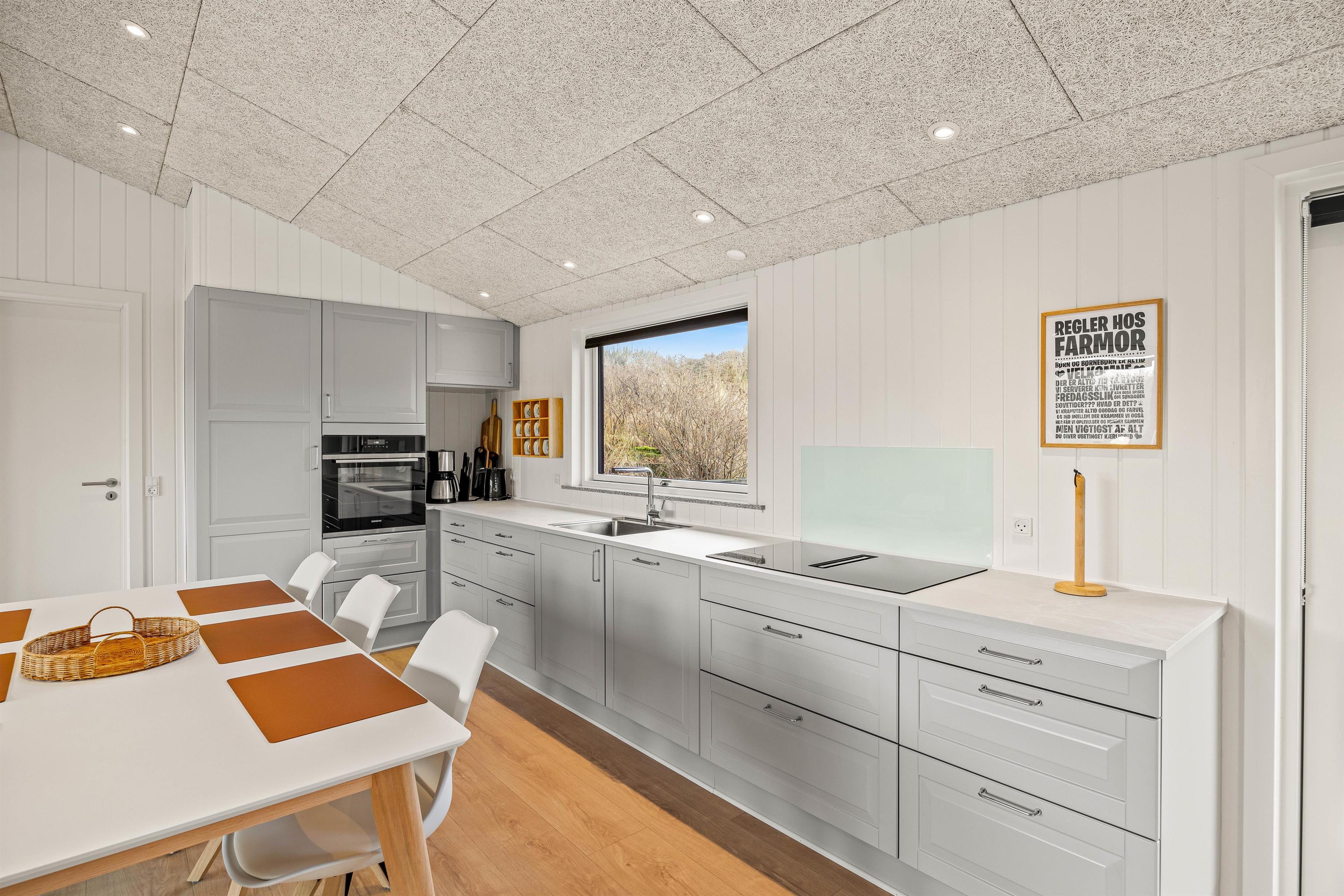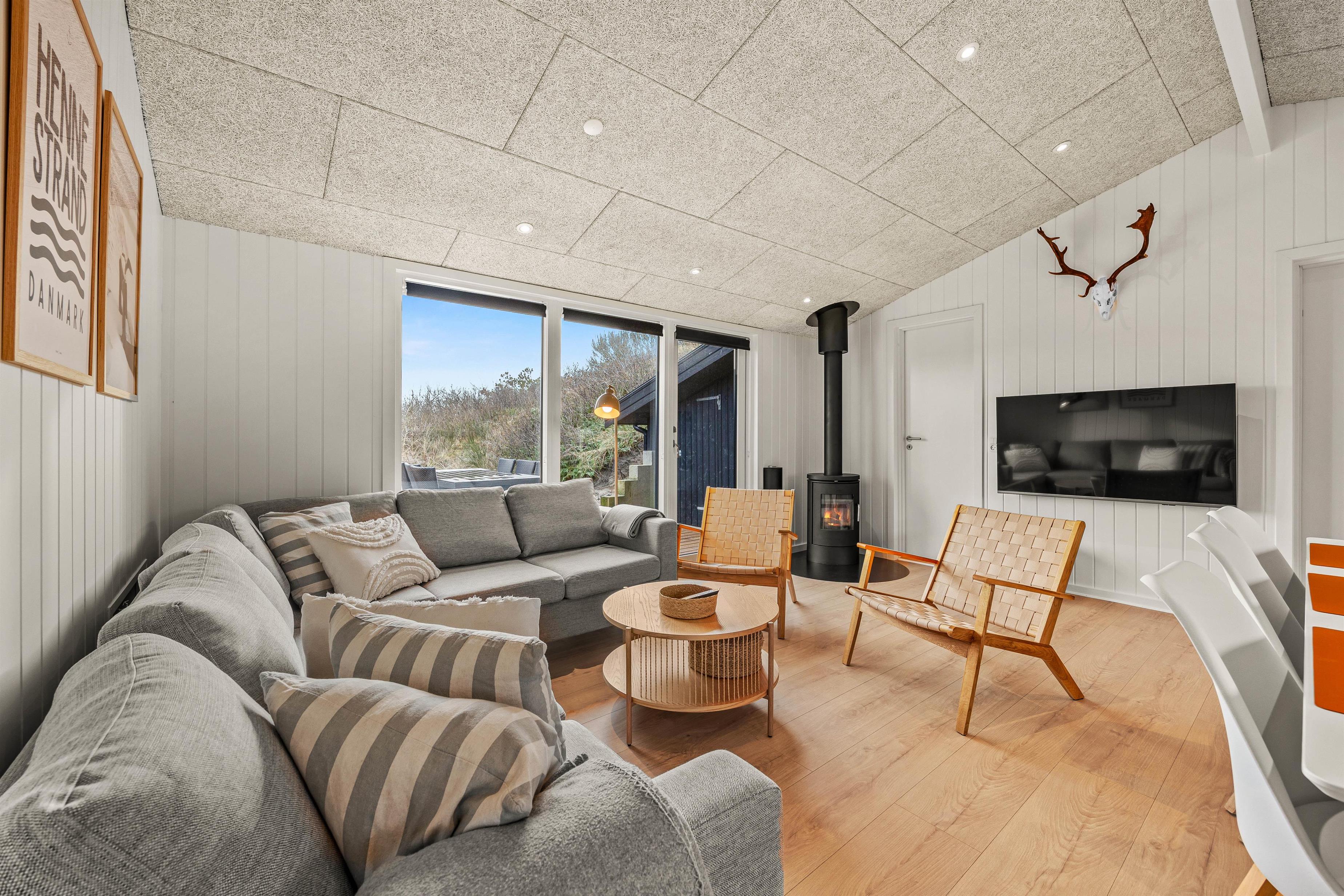 Sommerhuset, som er renoveret i 2024, er indrettet moderne, hvor der er lagt vægt på kvalitet og komfort. Det lyse loft til kip og de store vinduer gør sommerhuset til en oase af velvære. Opholdsrummet, hvor stuen er åbent i forbindelse med det veludstyrede køkken, er det naturlige samlingssted. Her kan I mødes og lave mad sammen eller lave en god gang popcorn, hvis I har lyst til en hyggelig filmaften - jeres yndlingsserier kan I streame via Chromecast. Brændeovnens rolige knitren vil fuldende sommerhus- og feriestemningen.