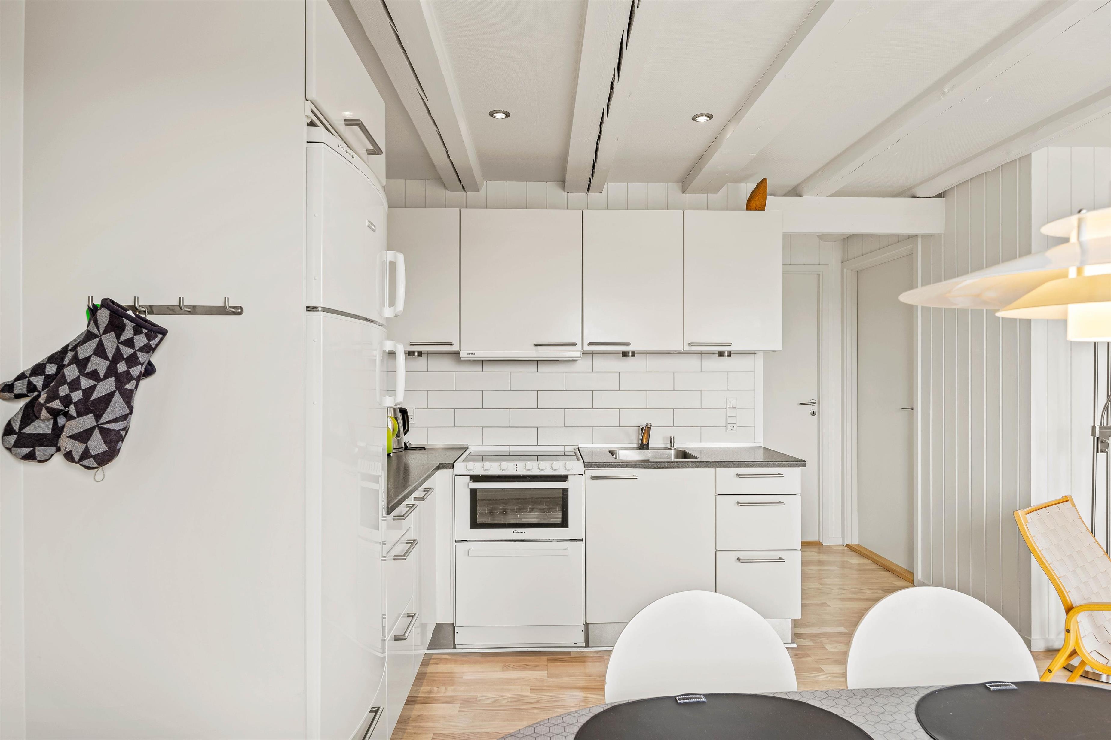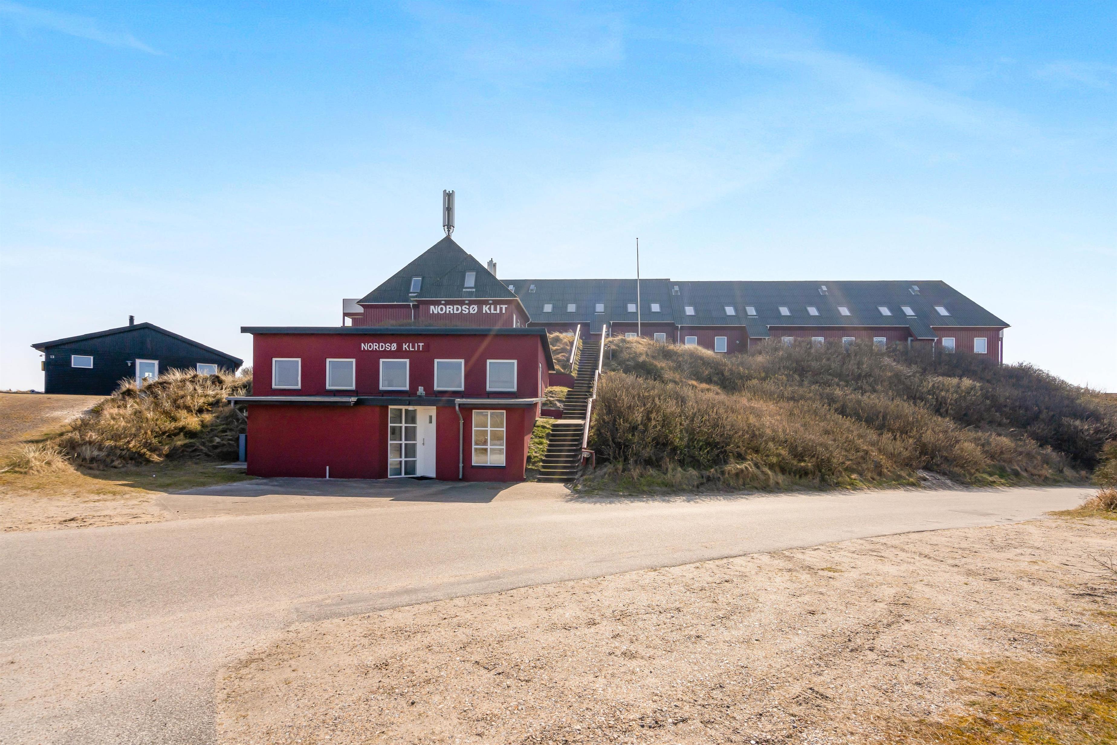 Beliggende på en klit fører en trappe fra P-pladsen jer op til ferielejlighedens terrasse, hvor I kan nyde en unik panoramaudsigt over de nærmeste omgivelser. Ferielejligheden er renoveret i 2021, og har en kombineret opholds- og spisestue med et integreret køkken, som indeholder opvaskemaskine samt en separat fryser på 30L.