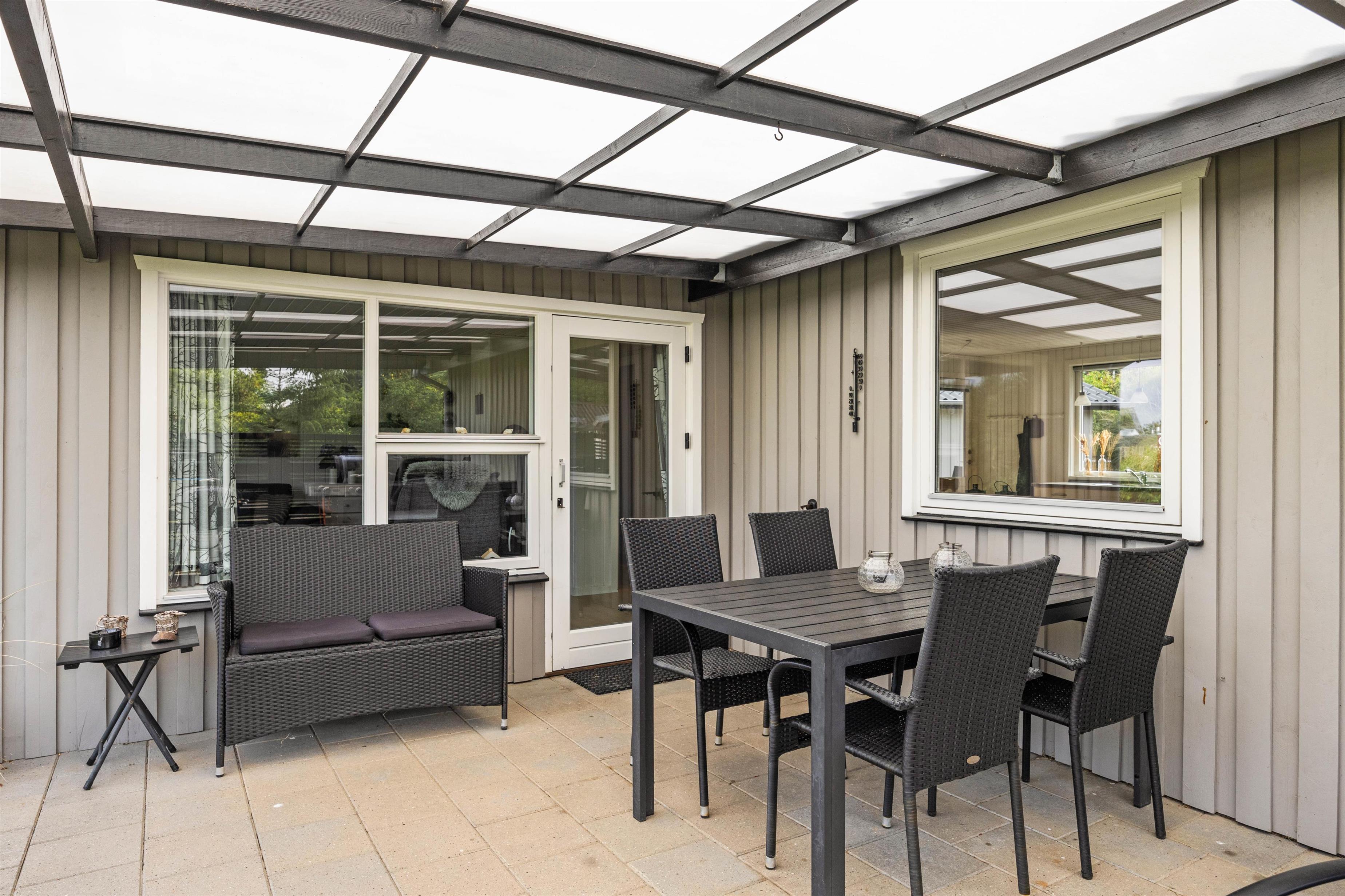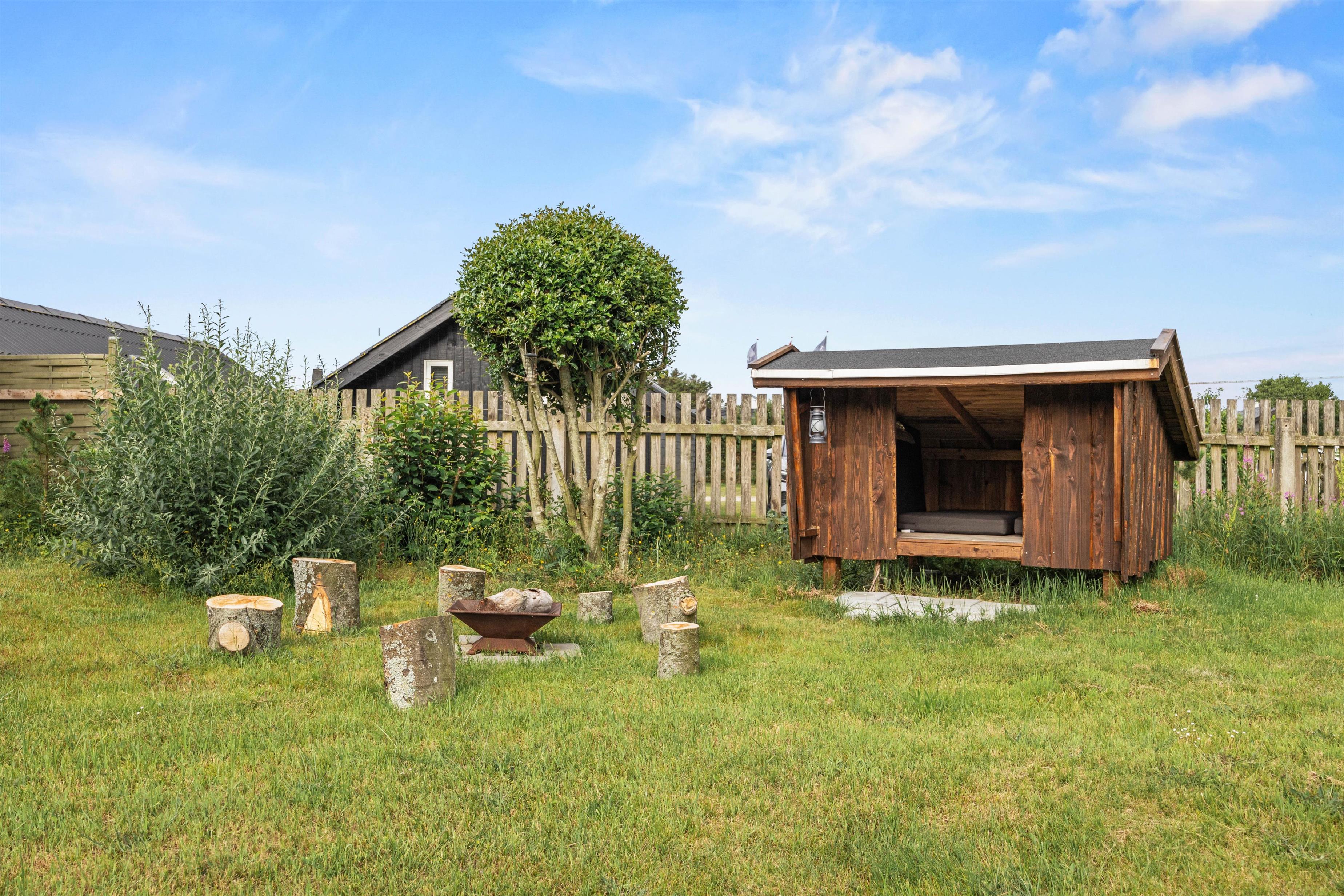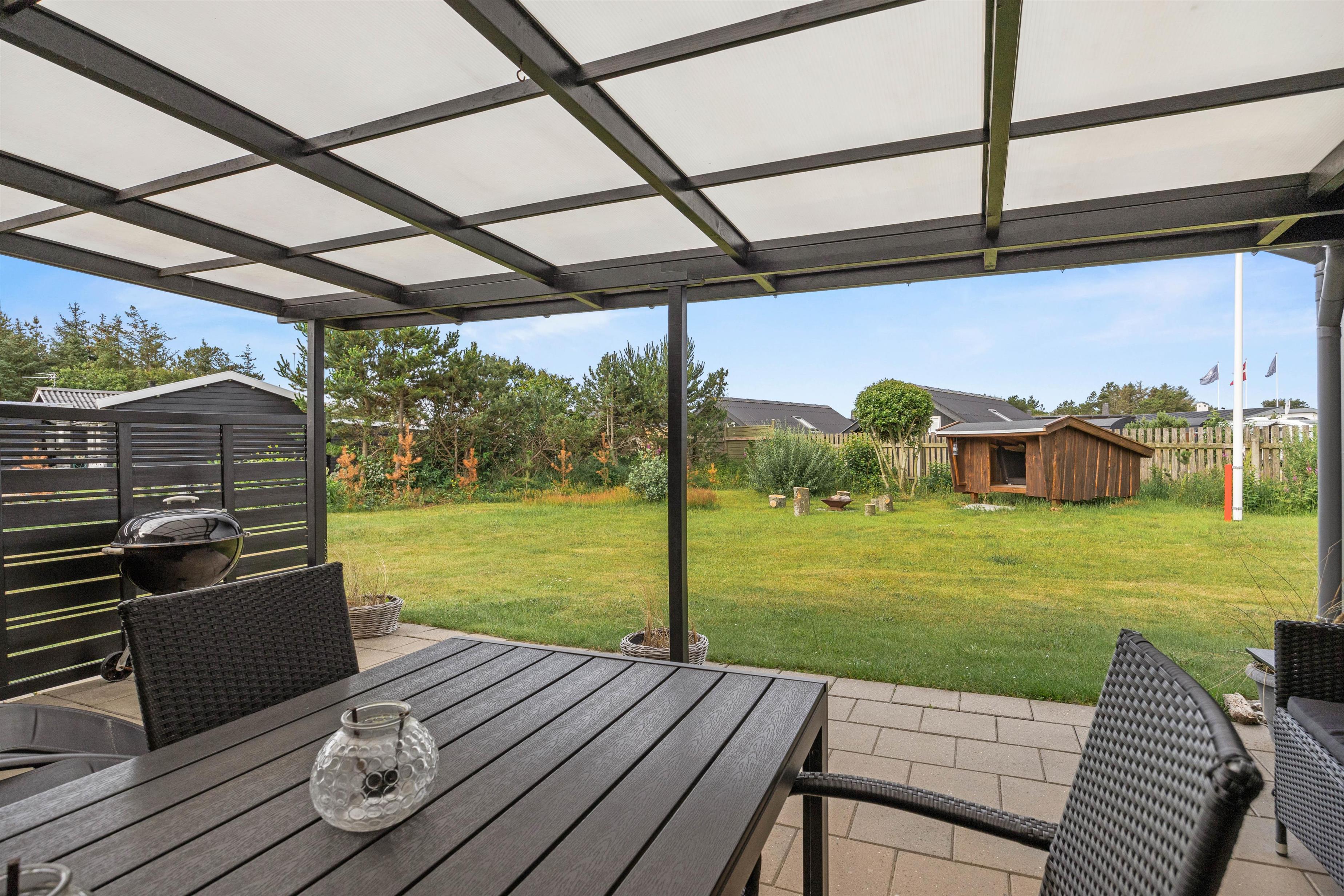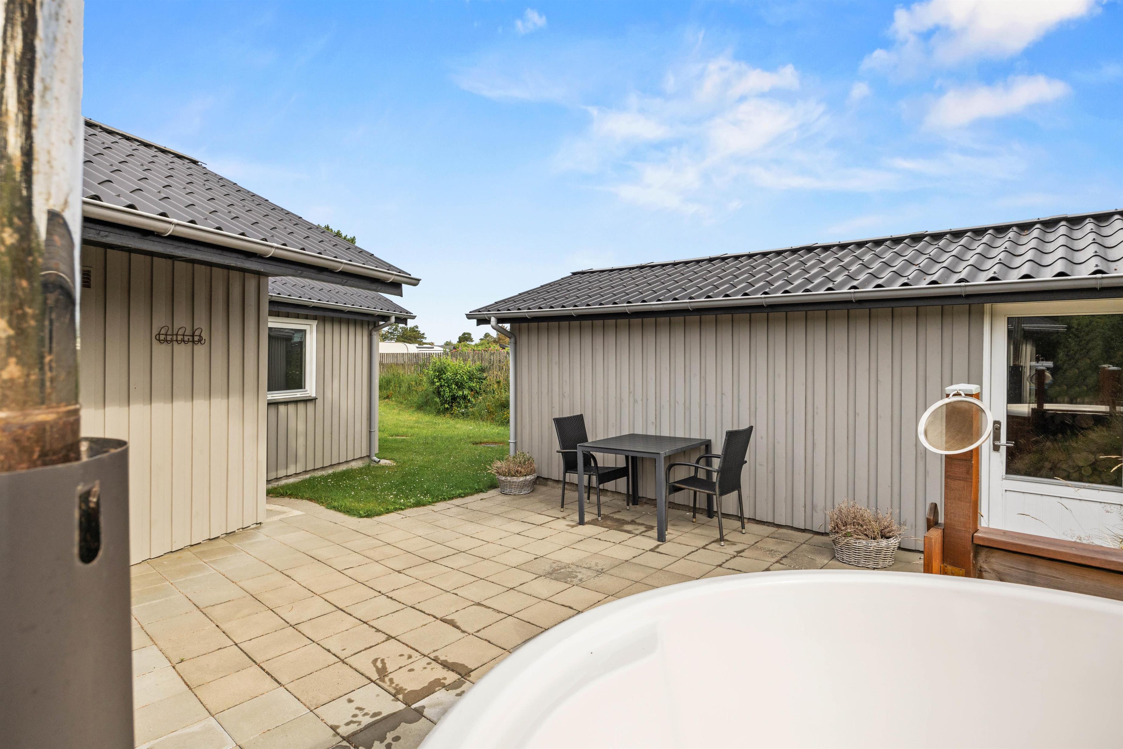 På den smukke og delvist overdækkede terrasse, kan du nyde havluften i alle slags vejr. Når solen skinner, kan du enten finde et skyggefuldt og køligt sted under overdækningen, eller et solrigt og varmt sted på den åbne terrasse. I regn og blæst vil der altid være en rolig plet, hvor du kan nyde en kop te og den særlig forførende duft fra fyrretræer og lyng. Tænd op i grillen, og slut dagen af med en lækker grillmenu, eller tag en rolig stund i vildmarksbadet, imens solen går ned.