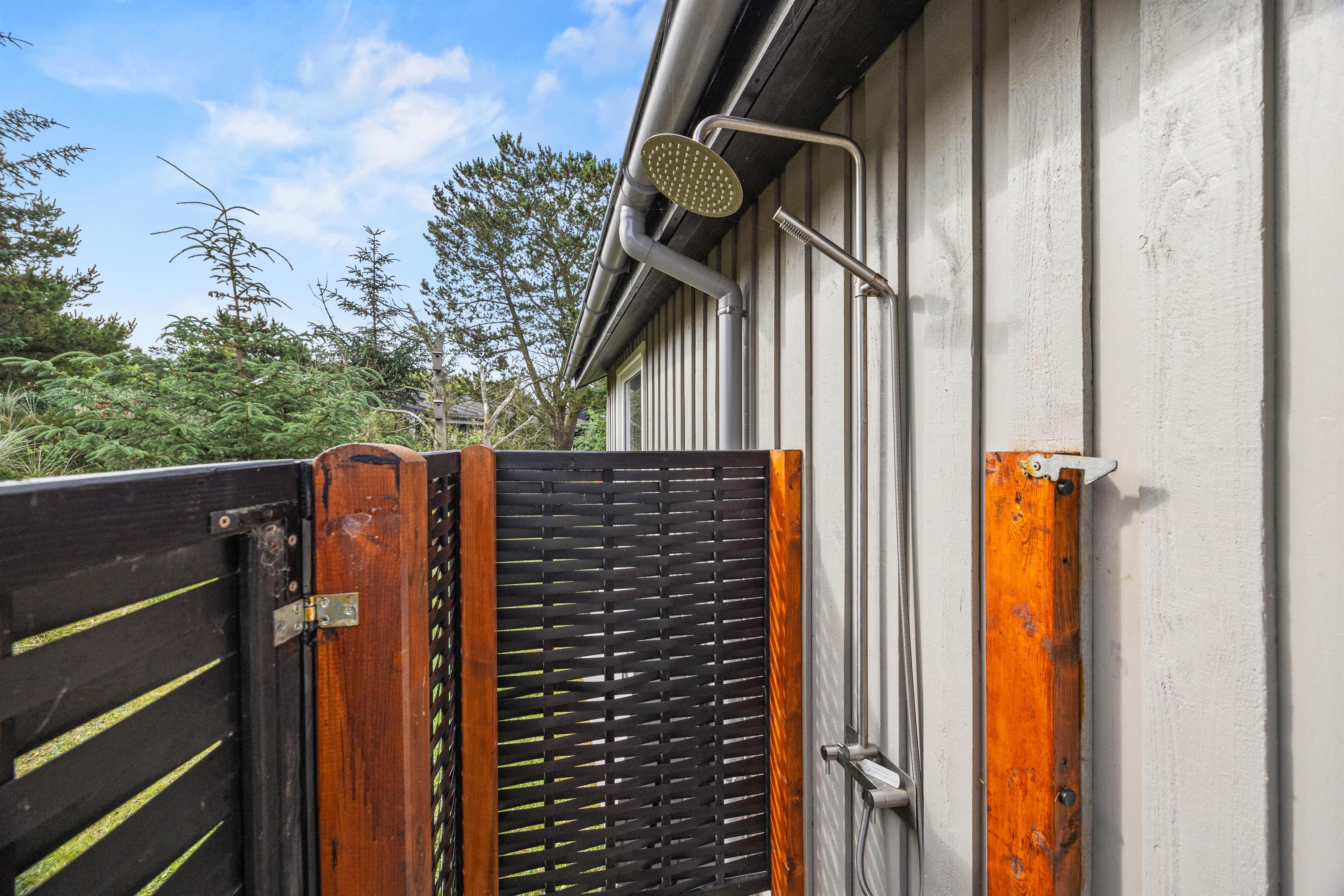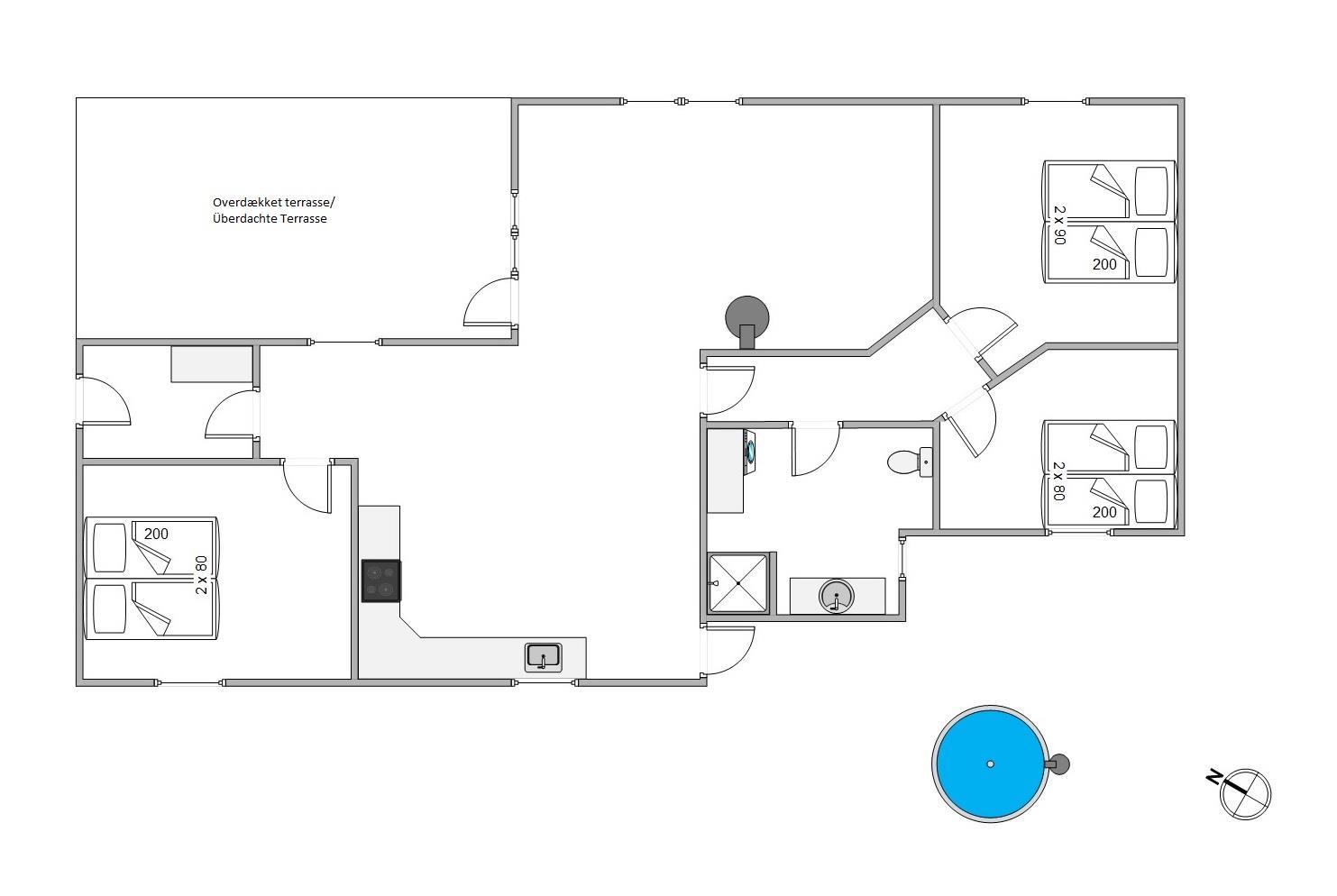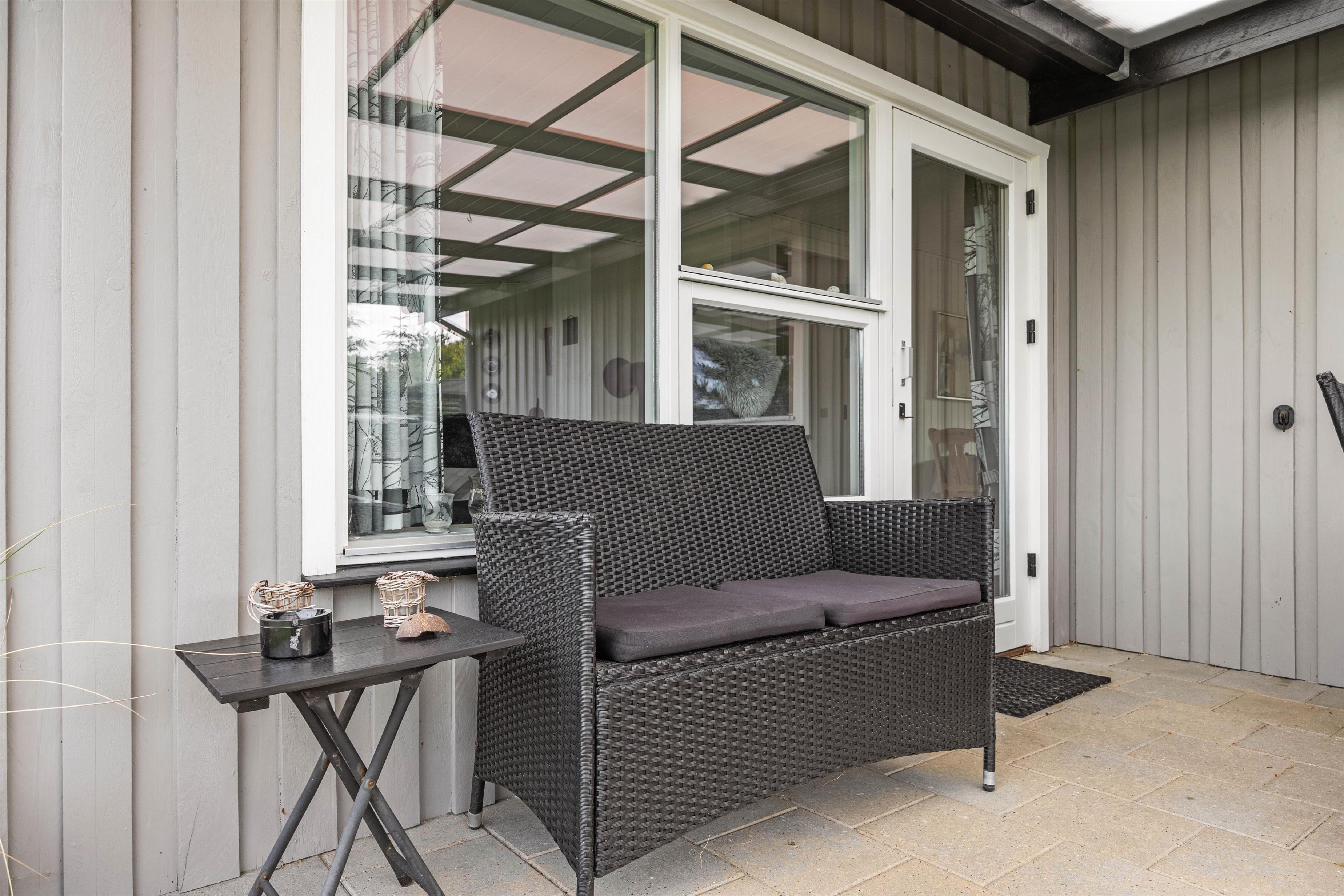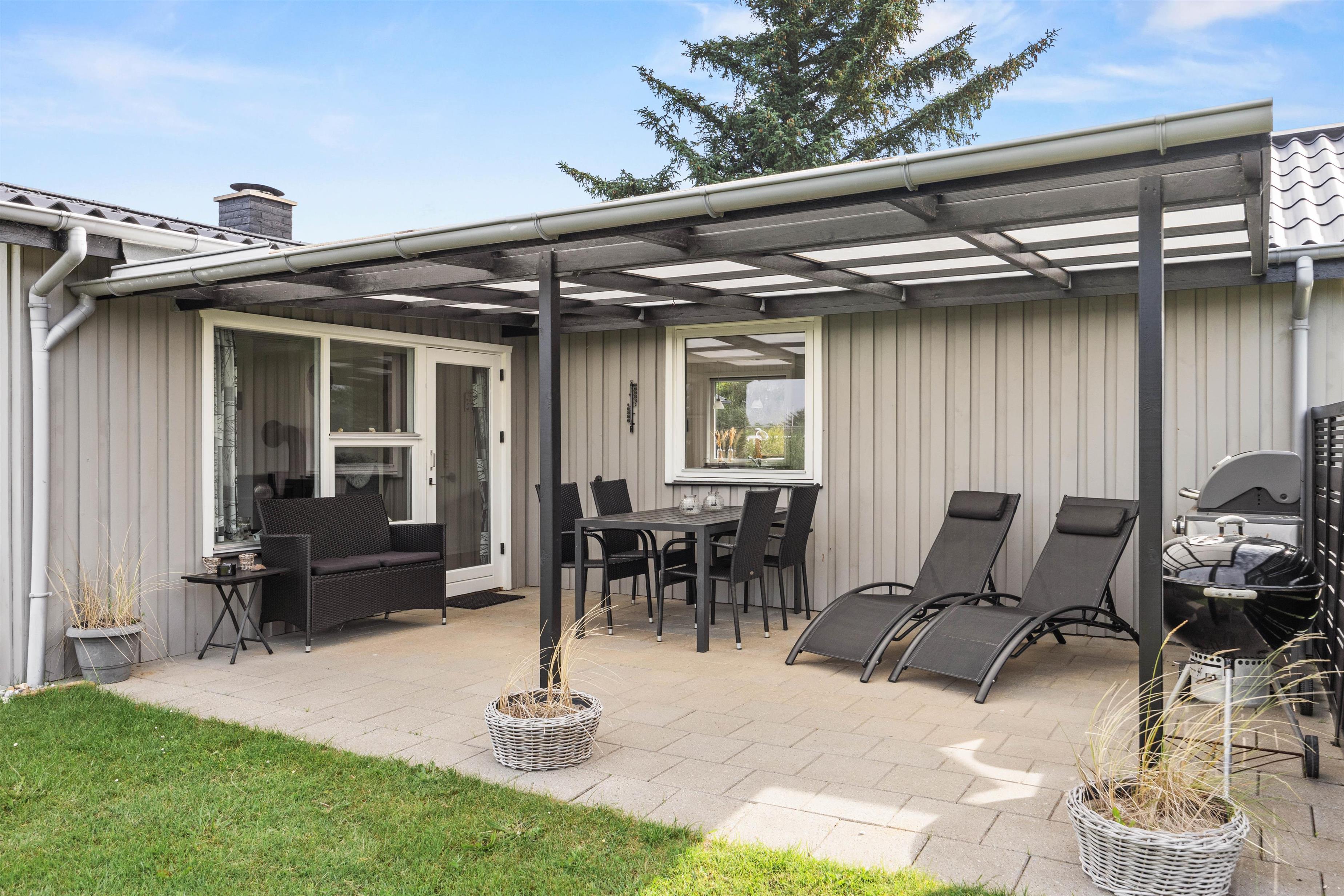 På den smukke og delvist overdækkede terrasse, kan du nyde havluften i alle slags vejr. Når solen skinner, kan du enten finde et skyggefuldt og køligt sted under overdækningen, eller et solrigt og varmt sted på den åbne terrasse. I regn og blæst vil der altid være en rolig plet, hvor du kan nyde en kop te og den særlig forførende duft fra fyrretræer og lyng. Tænd op i grillen, og slut dagen af med en lækker grillmenu, eller tag en rolig stund i vildmarksbadet, imens solen går ned.