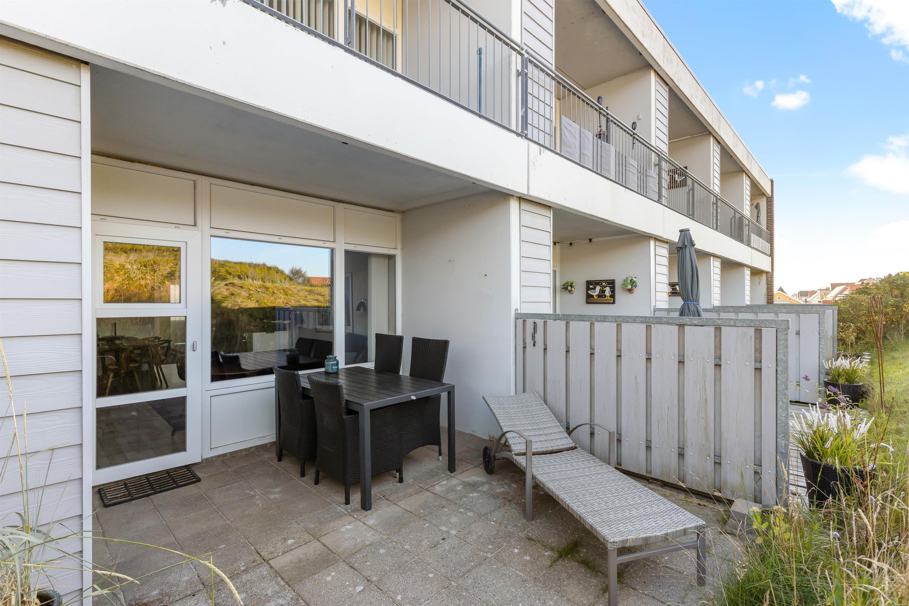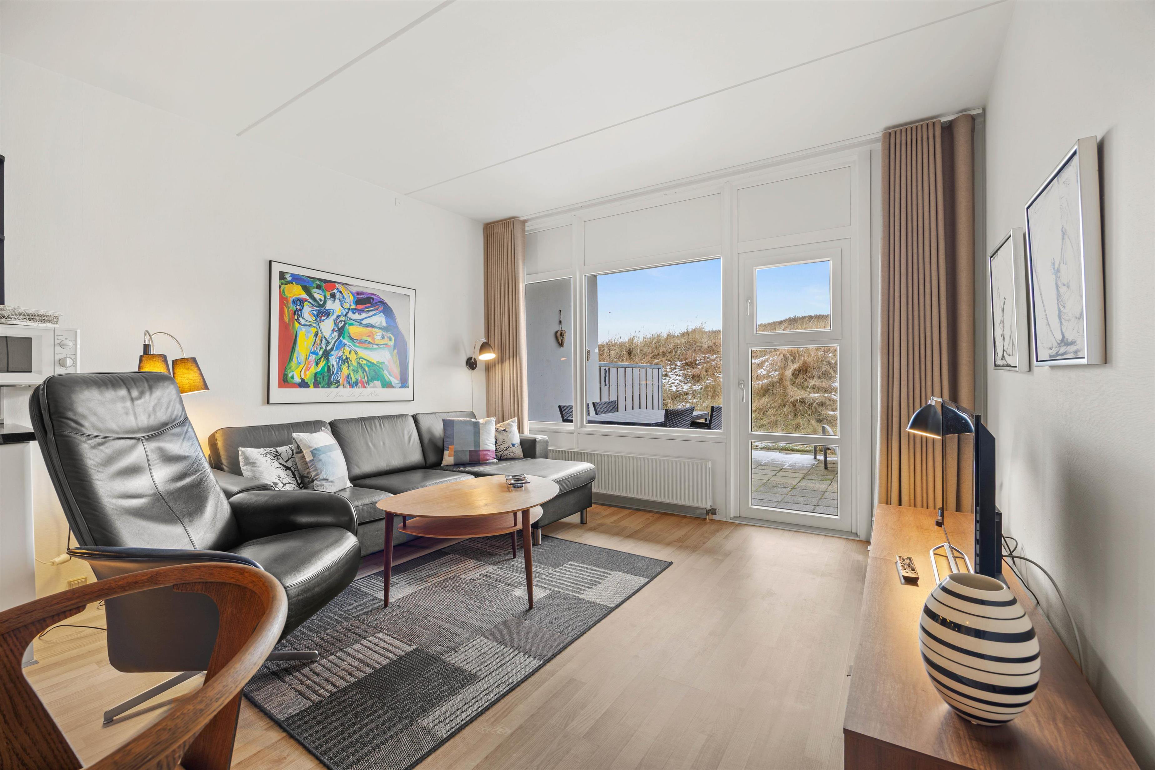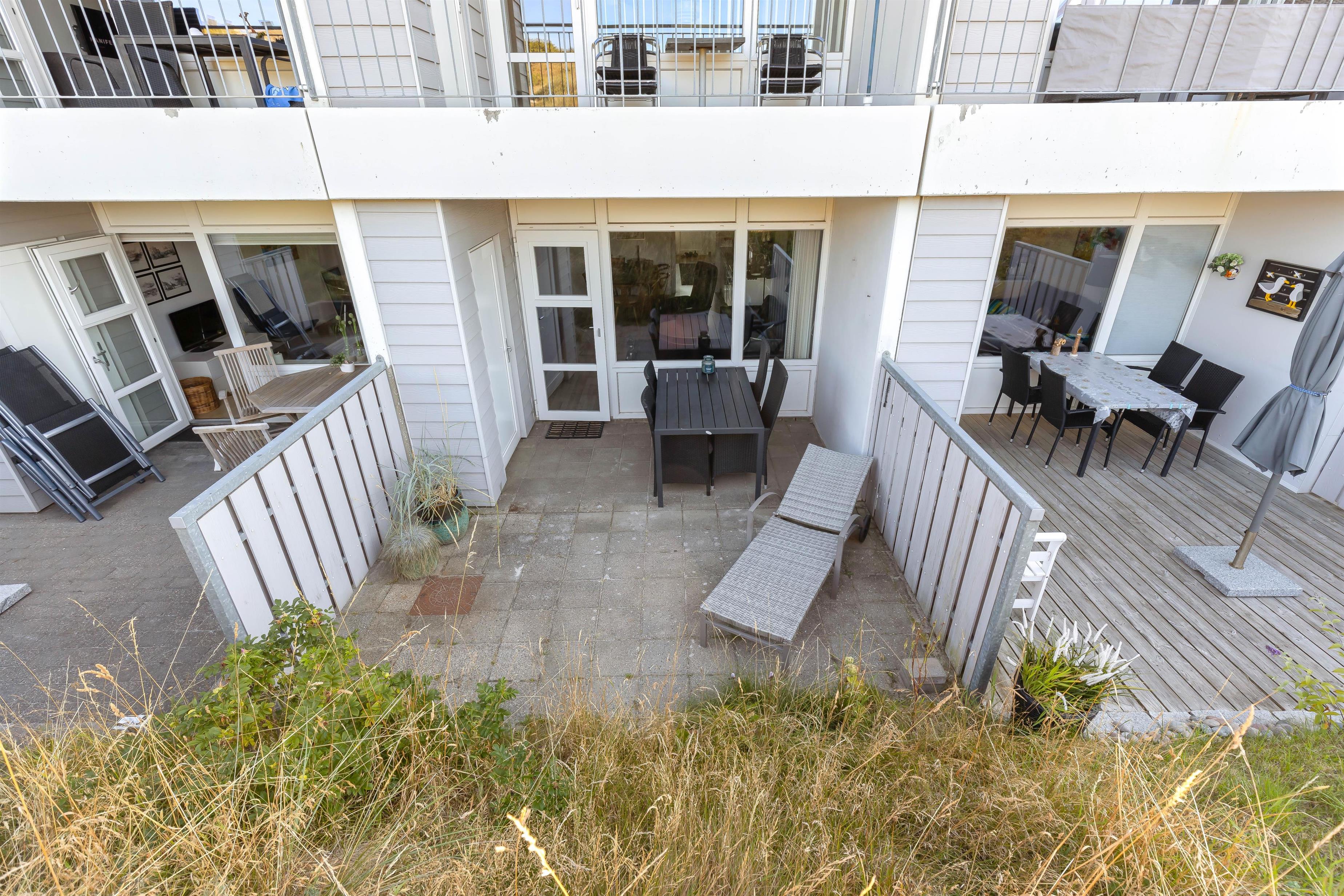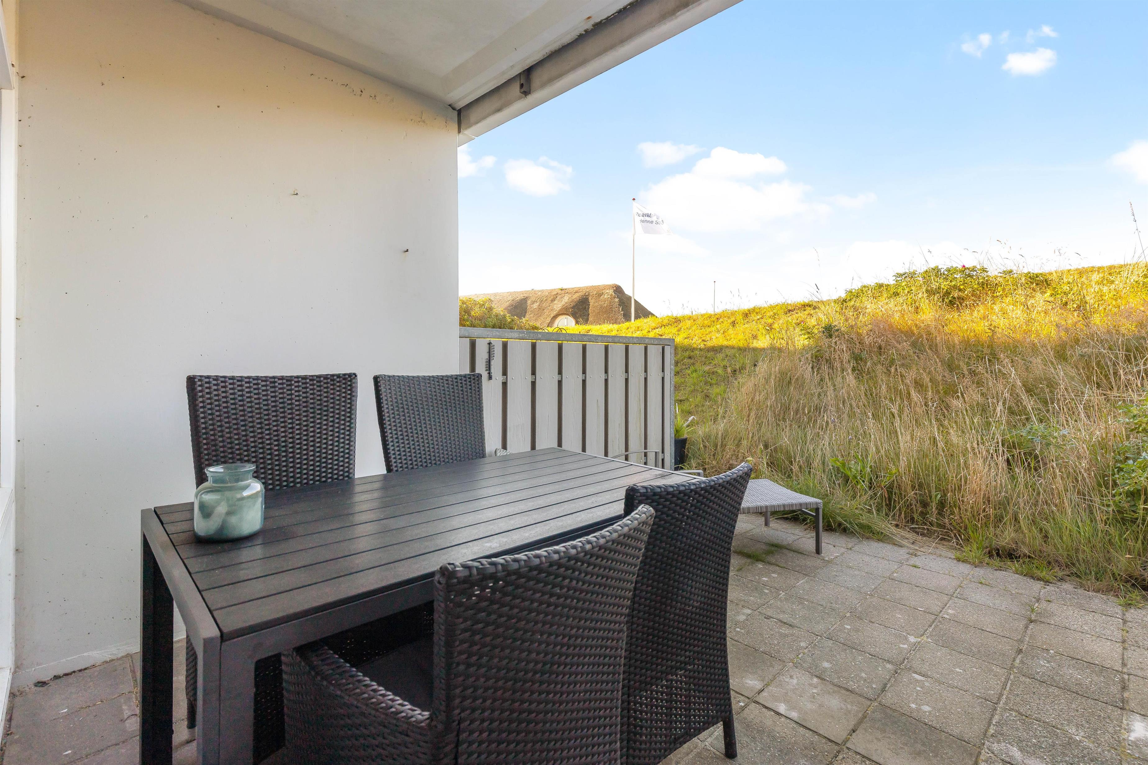Fra stuen er der direkte udgang til en dejlig terrasse. En lille læfyldt oase og gode havemøbler. Her kan du tage morgenkaffen, og efter at have nydt solnedgangen fra udsigtsklitten, kan du pakke dig ind i et tæppe og nyde en godnatøl eller et glas vin på terrassen. Det er ikke tilladt at grille på lejlighedens terrasse, men til gengæld er der en fælles terrasse hvor der står en fast gril.