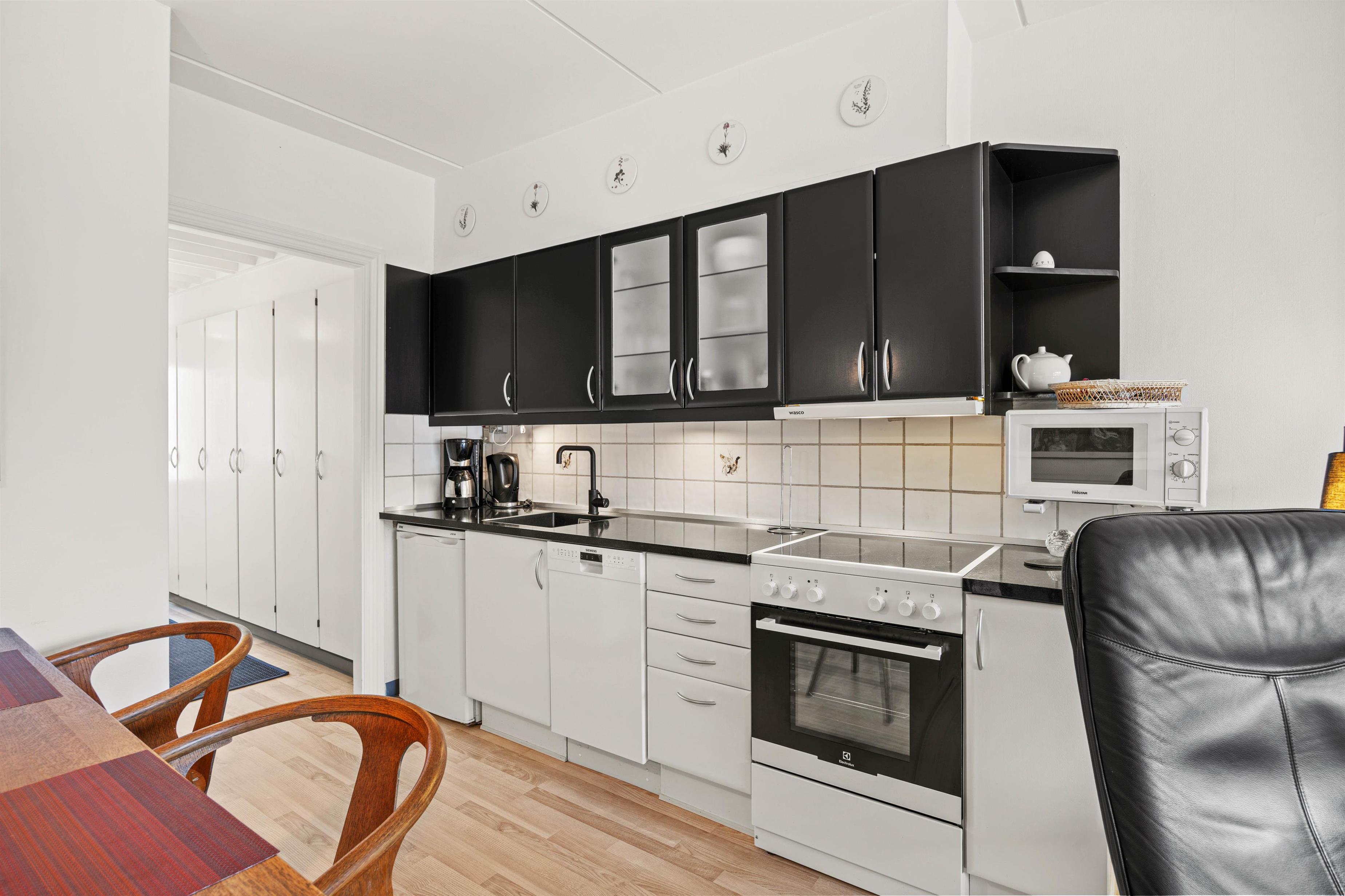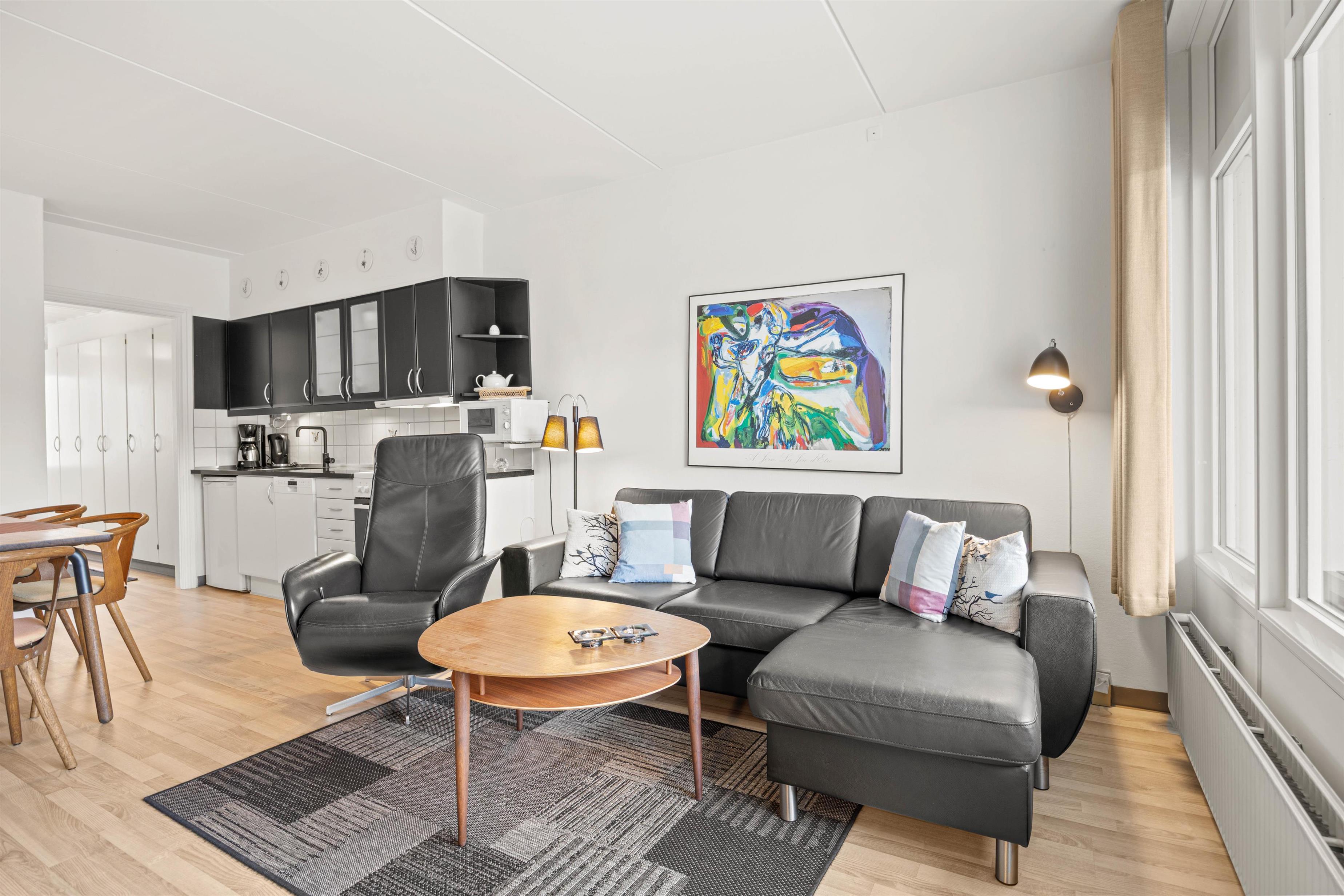 Ferielejligheden er rigtigt hyggeligt og praktisk indrettet. Det velindrettede køkken er fint egnet til at trylle lækker feriemad frem, og efter en dejlig middag kan opvaskemaskinen heldigvis klare resten. En god lænestol og den bekvemme sofa står nemlig klar til den efterfølgende afslapning foran fjernsynet eller med den bog, du så længe har glædet dig til at få læst.